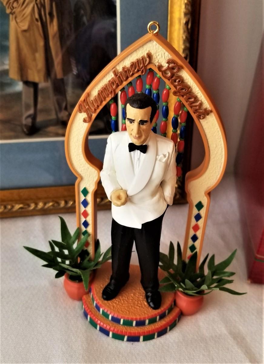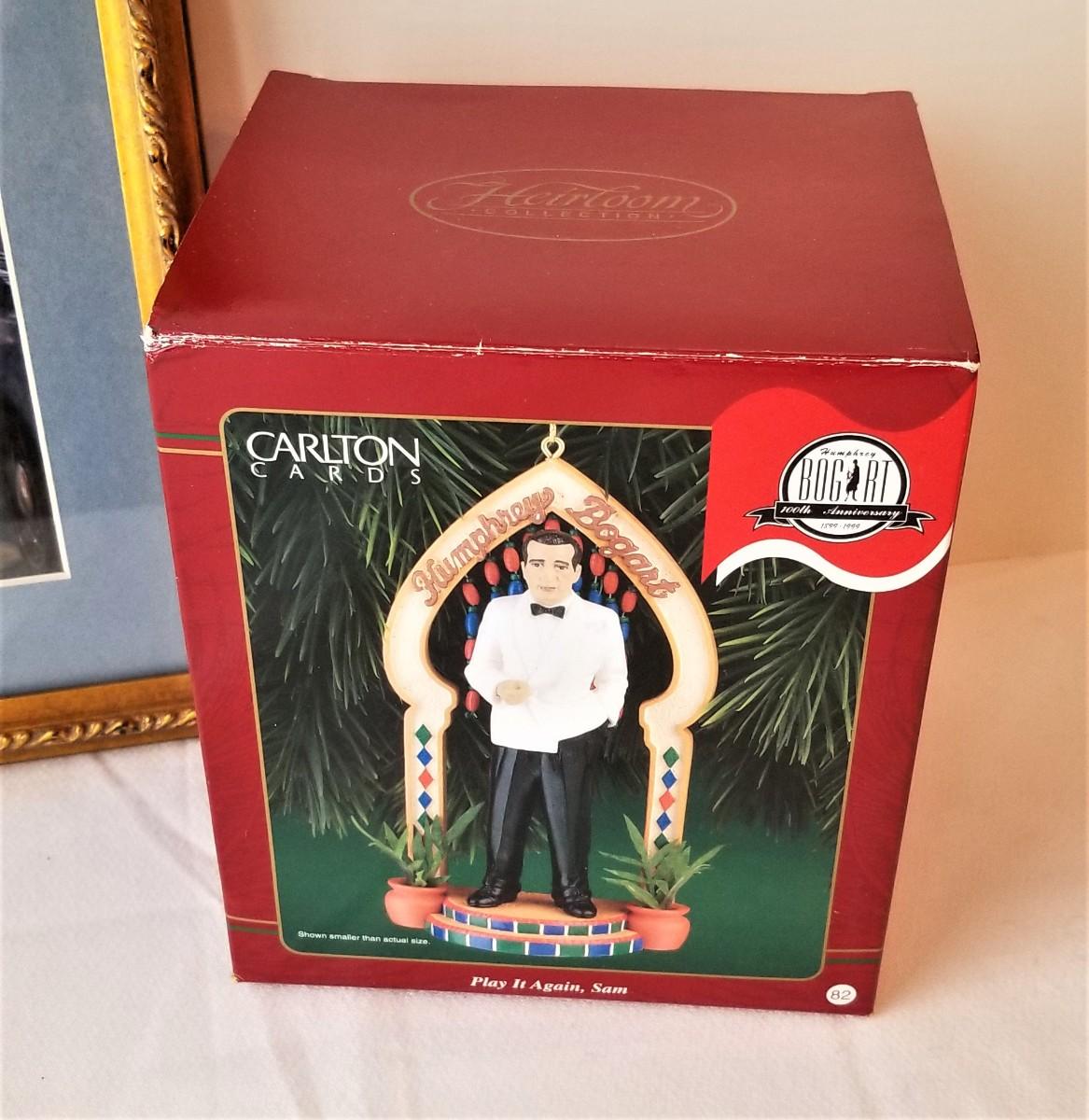 You get this framed block of U.S. postage stamps honoring Humphrey Bogart along with this Christmas ornament feturing a scene from Casablanca. Framed piece is 12" across x 10.75" tall. Good condition.