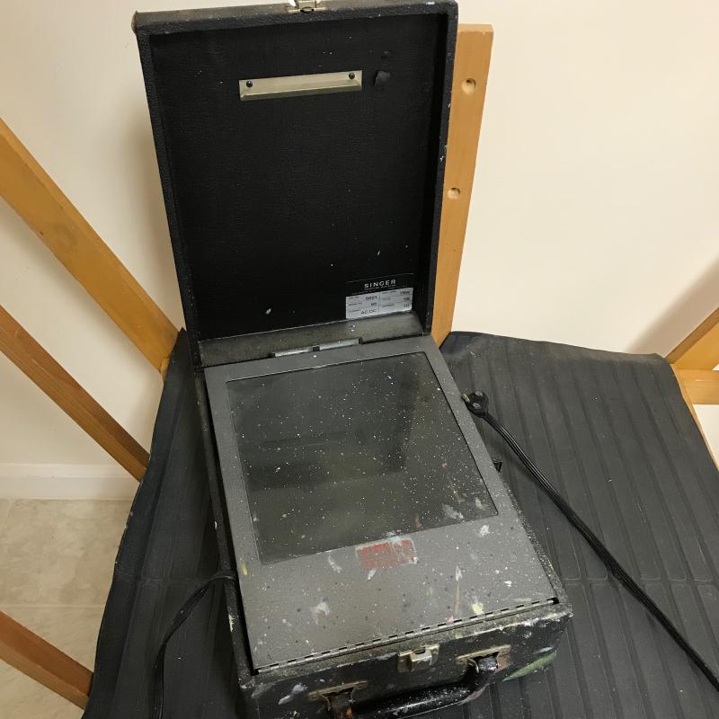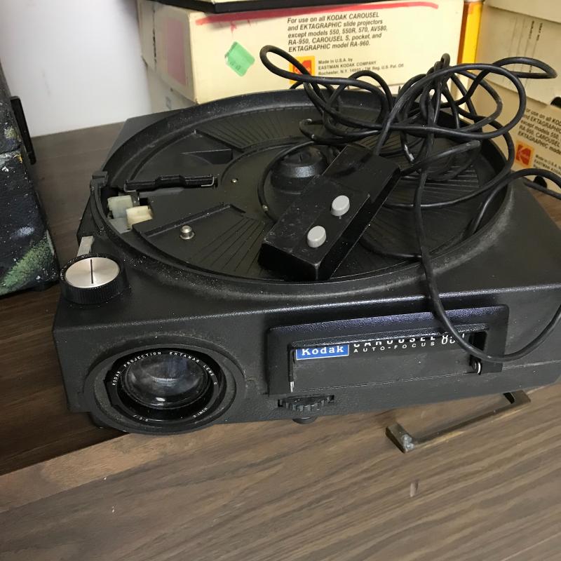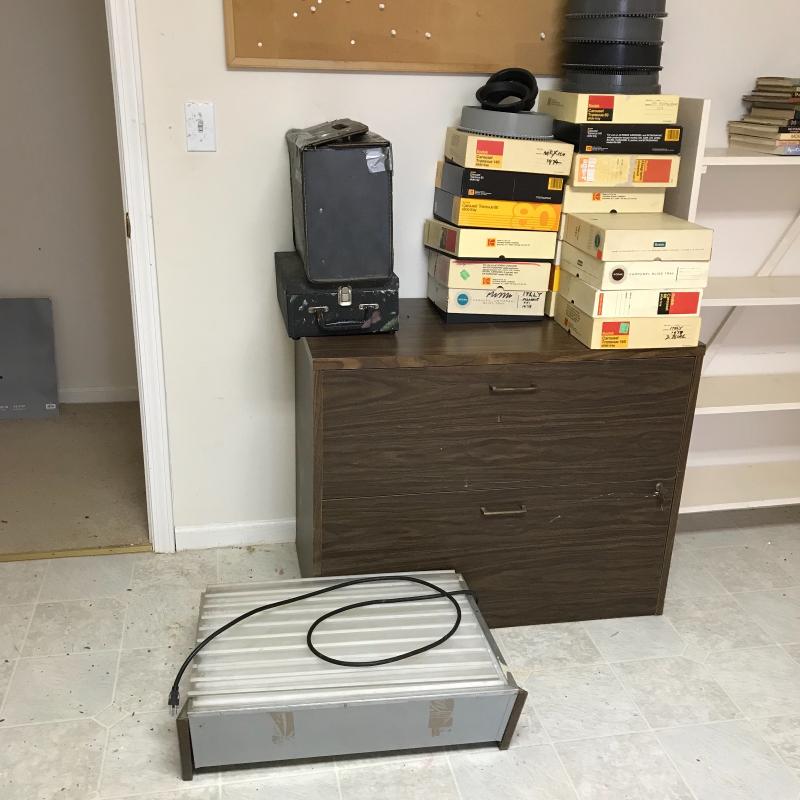24 empty slide carousels, two slide view stations (large one works), Kodak carousel 850 auto focus projector, Da-lite Screen and two drawer file cabinet with lock for storage. File cabinet measures 34” x20” x29”. This lot is available for local pick up in Asheville, NC only.