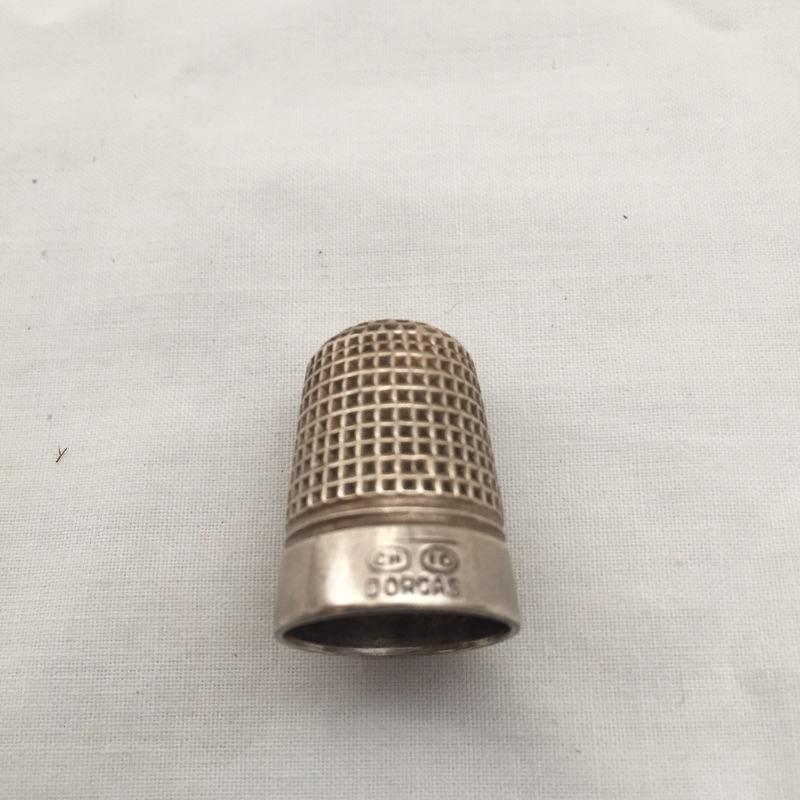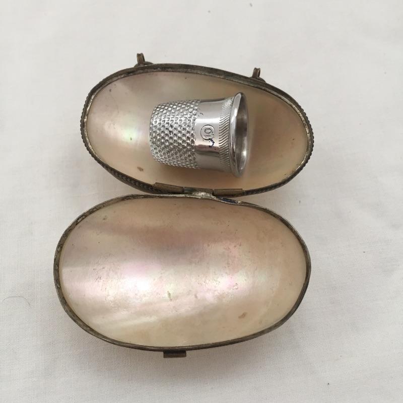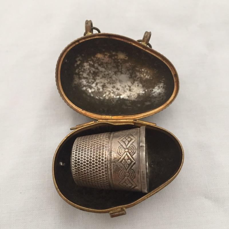 Three thimble holders with thimbles. Distinctly different trio of thimble holders with thimbles. Largest holder measures 3” long.