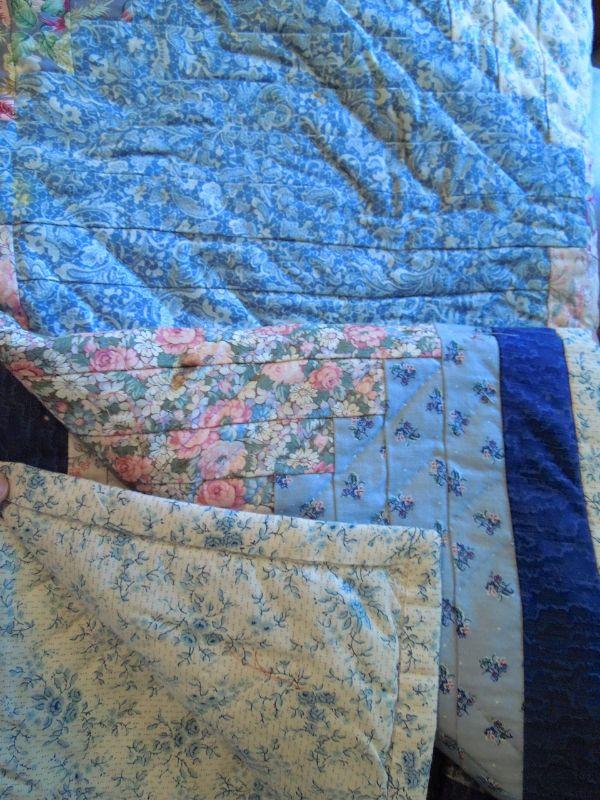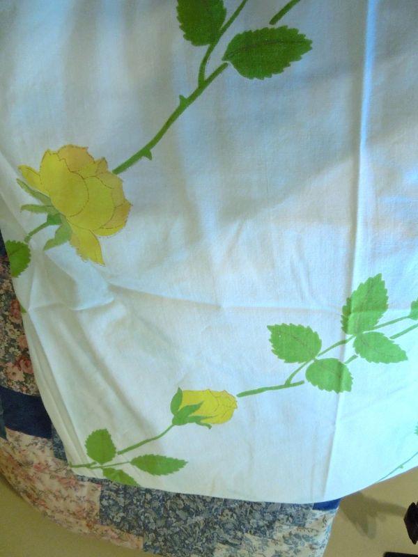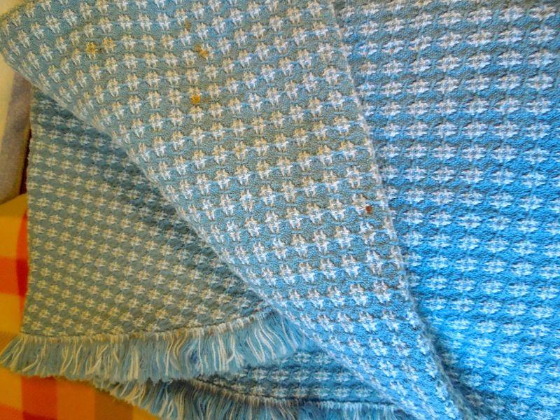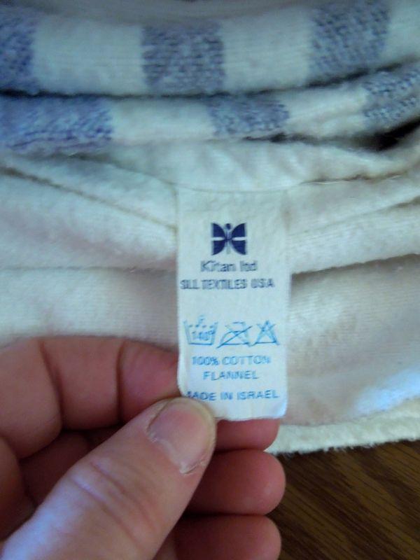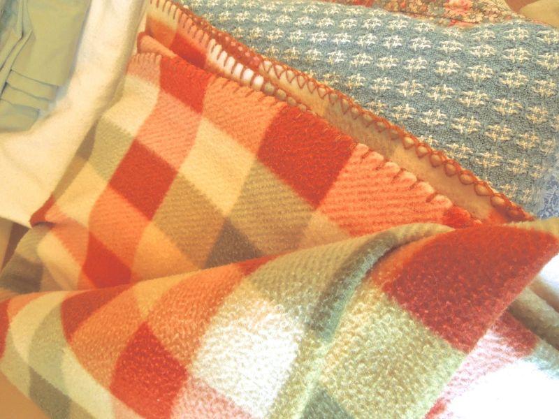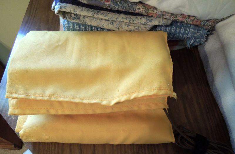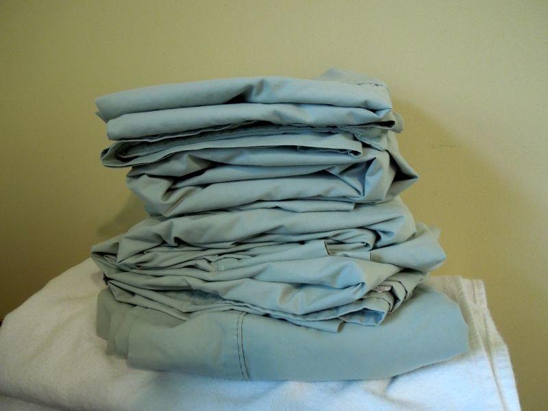 Two sets of sage green fitted, flat and pillow cases; two thick flannel blue striped blankets by Katan; and extra long heating pad with cloth cover; vintage yellow rose twin fitted sheet;a hand made blue pieced lap quilt; a shaker style woven blue afghan blanket and an orange, green and white fleece blanket.