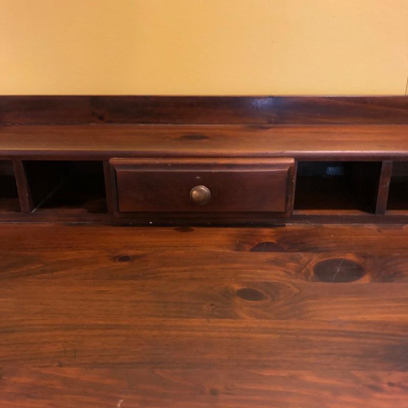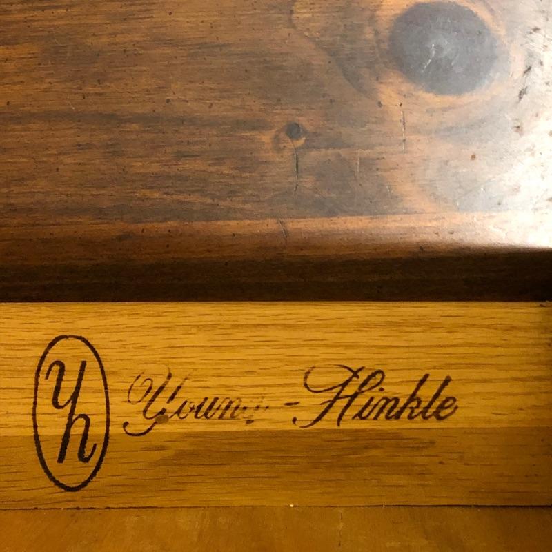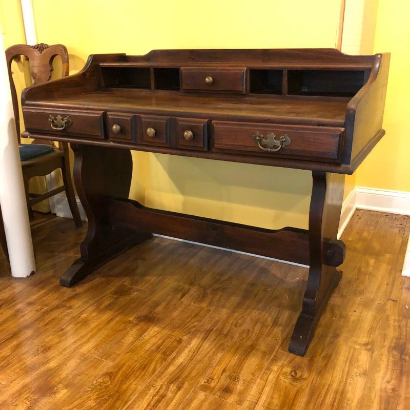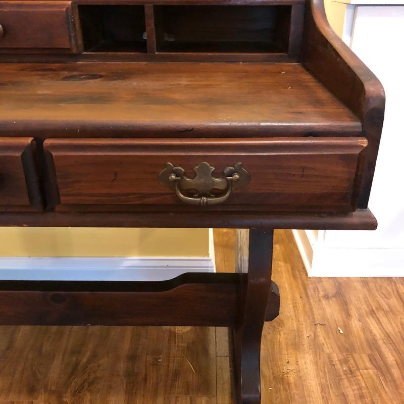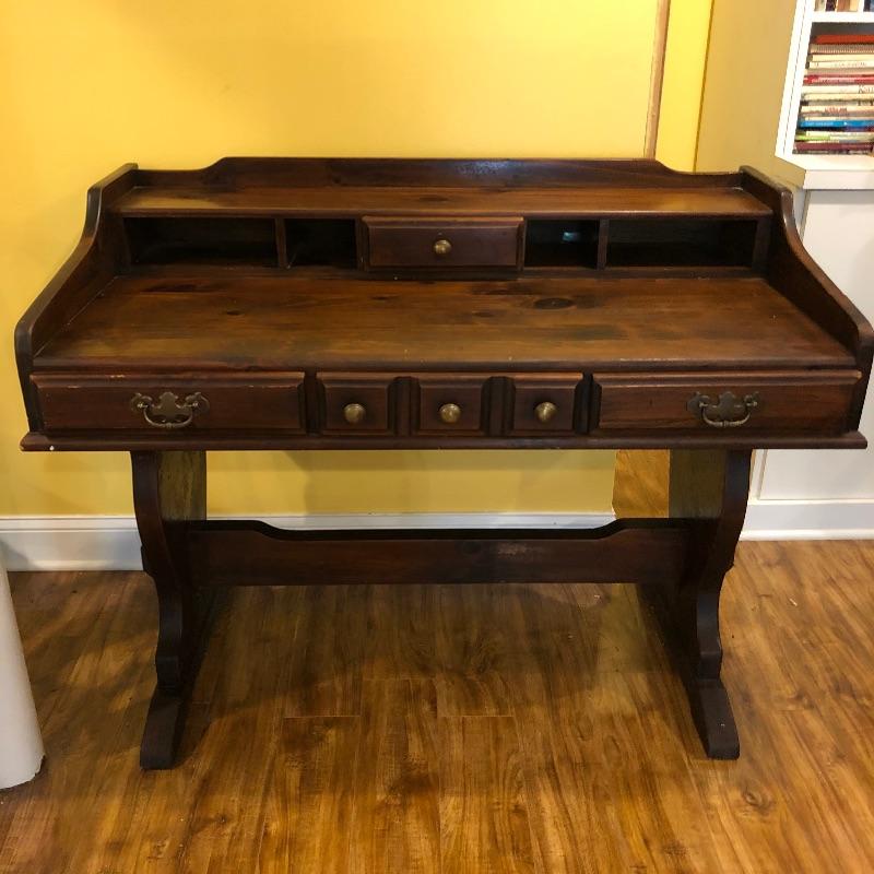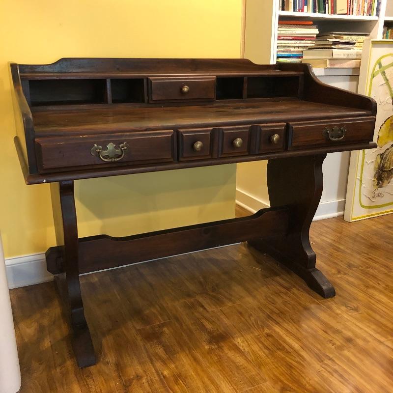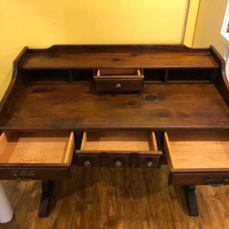 This handsome Young Hinkle desk is Plymouth Pine. It has a dark stain and is in great condition with just a few blemishes that are shown in the latter images. There are 3 dovetailed drawers with dark brass like pulls, plus a smaller drawer in the center of the cubby hole slots. This well crafted desk would look great in your home office!