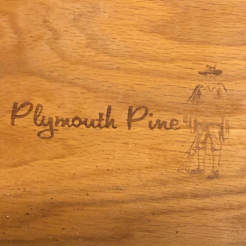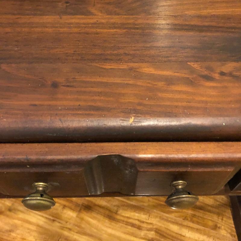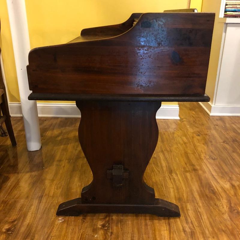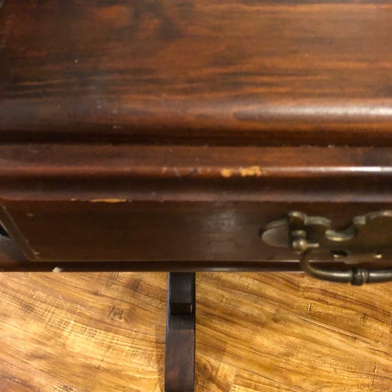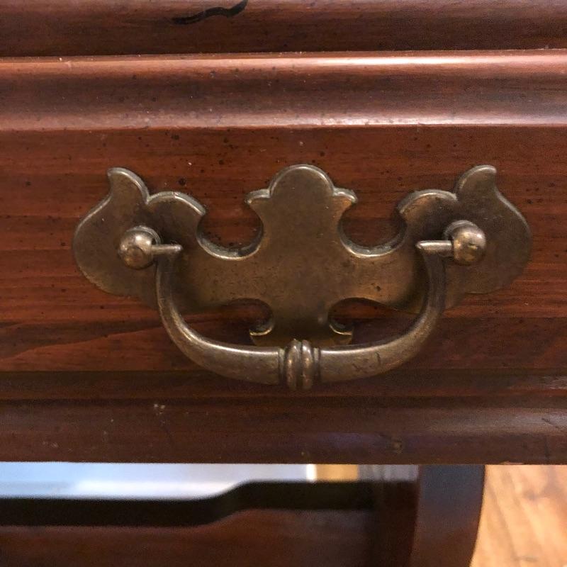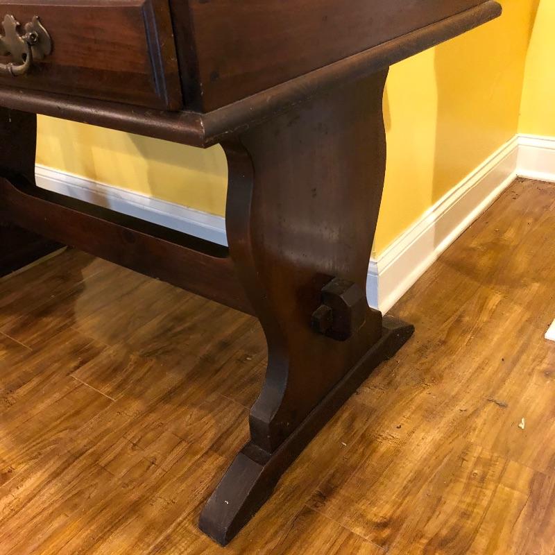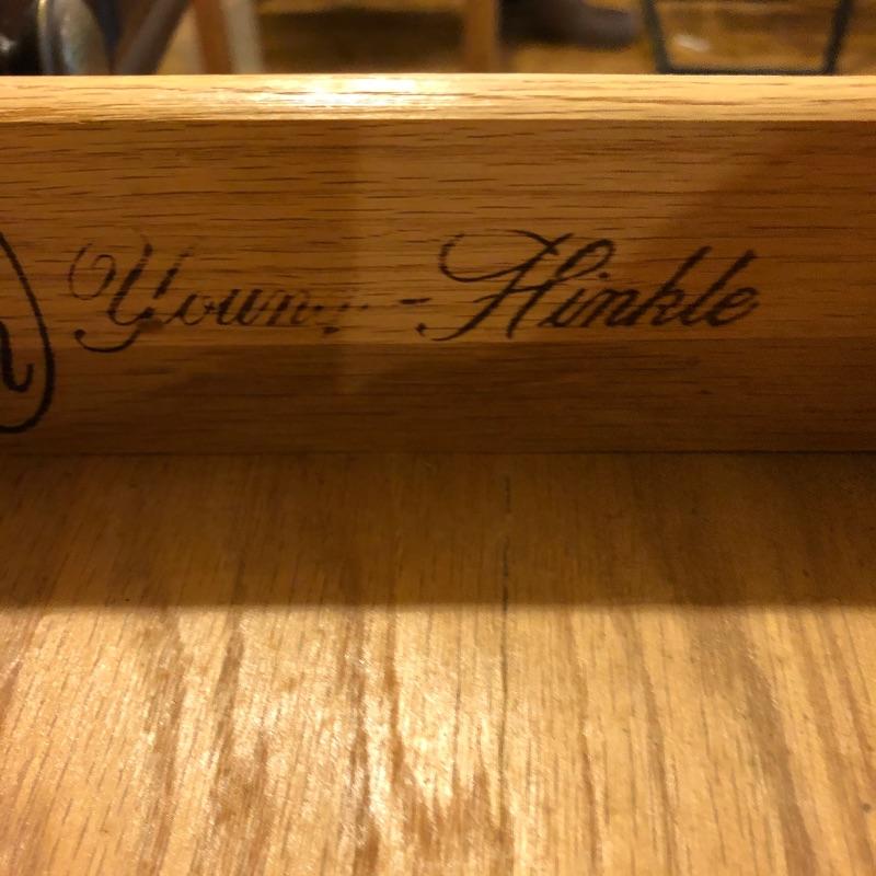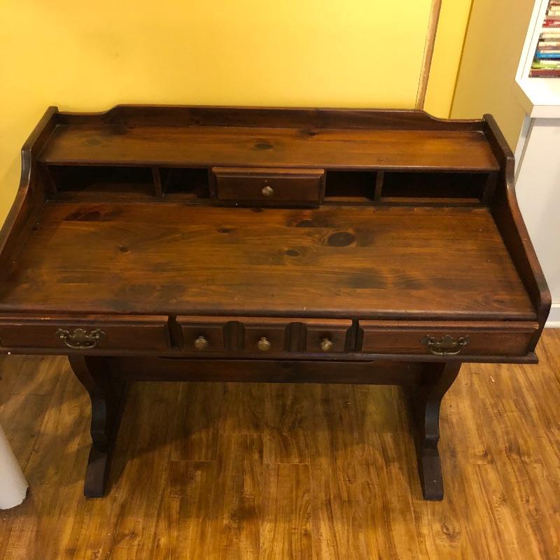 This handsome Young Hinkle desk is Plymouth Pine. It has a dark stain and is in great condition with just a few blemishes that are shown in the latter images. There are 3 dovetailed drawers with dark brass like pulls, plus a smaller drawer in the center of the cubby hole slots. This well crafted desk would look great in your home office!