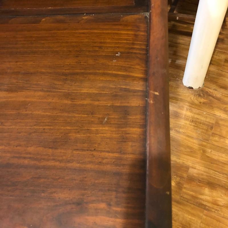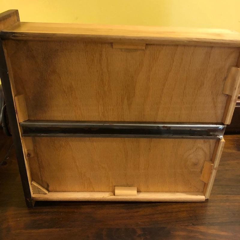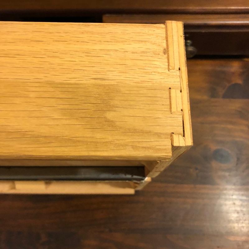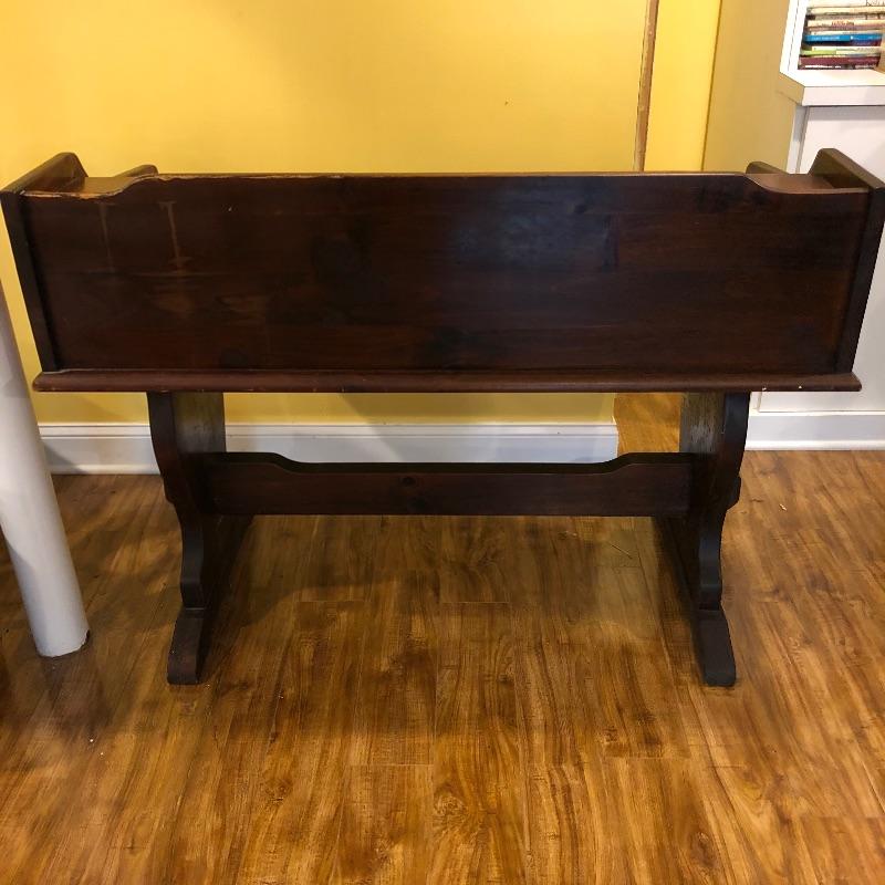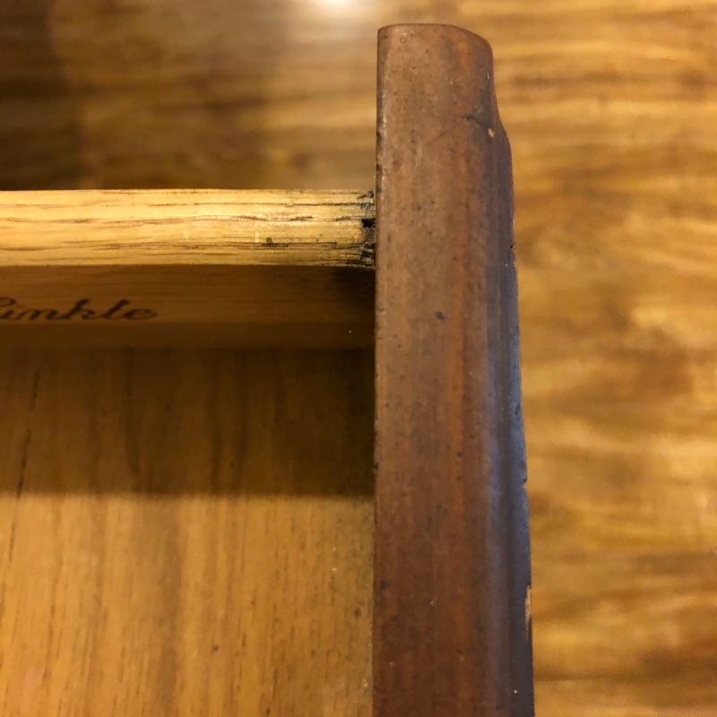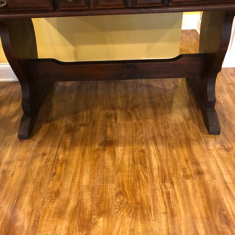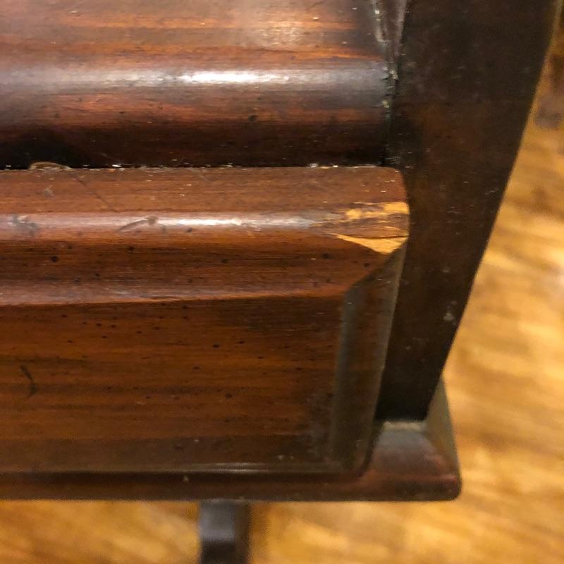 This handsome Young Hinkle desk is Plymouth Pine. It has a dark stain and is in great condition with just a few blemishes that are shown in the latter images. There are 3 dovetailed drawers with dark brass like pulls, plus a smaller drawer in the center of the cubby hole slots. This well crafted desk would look great in your home office!