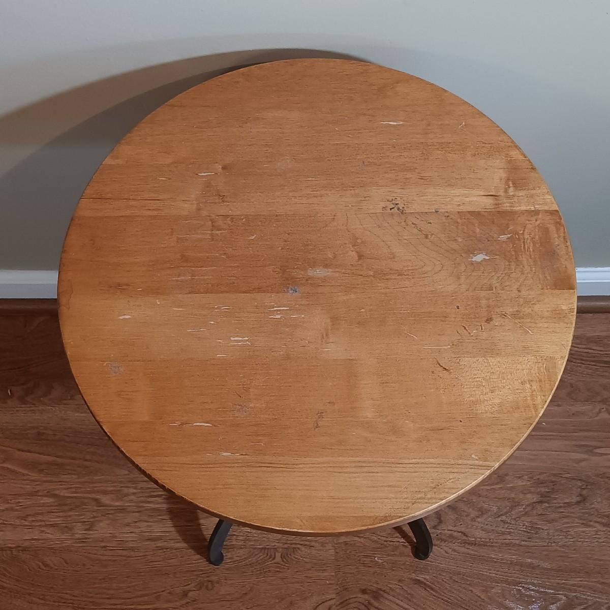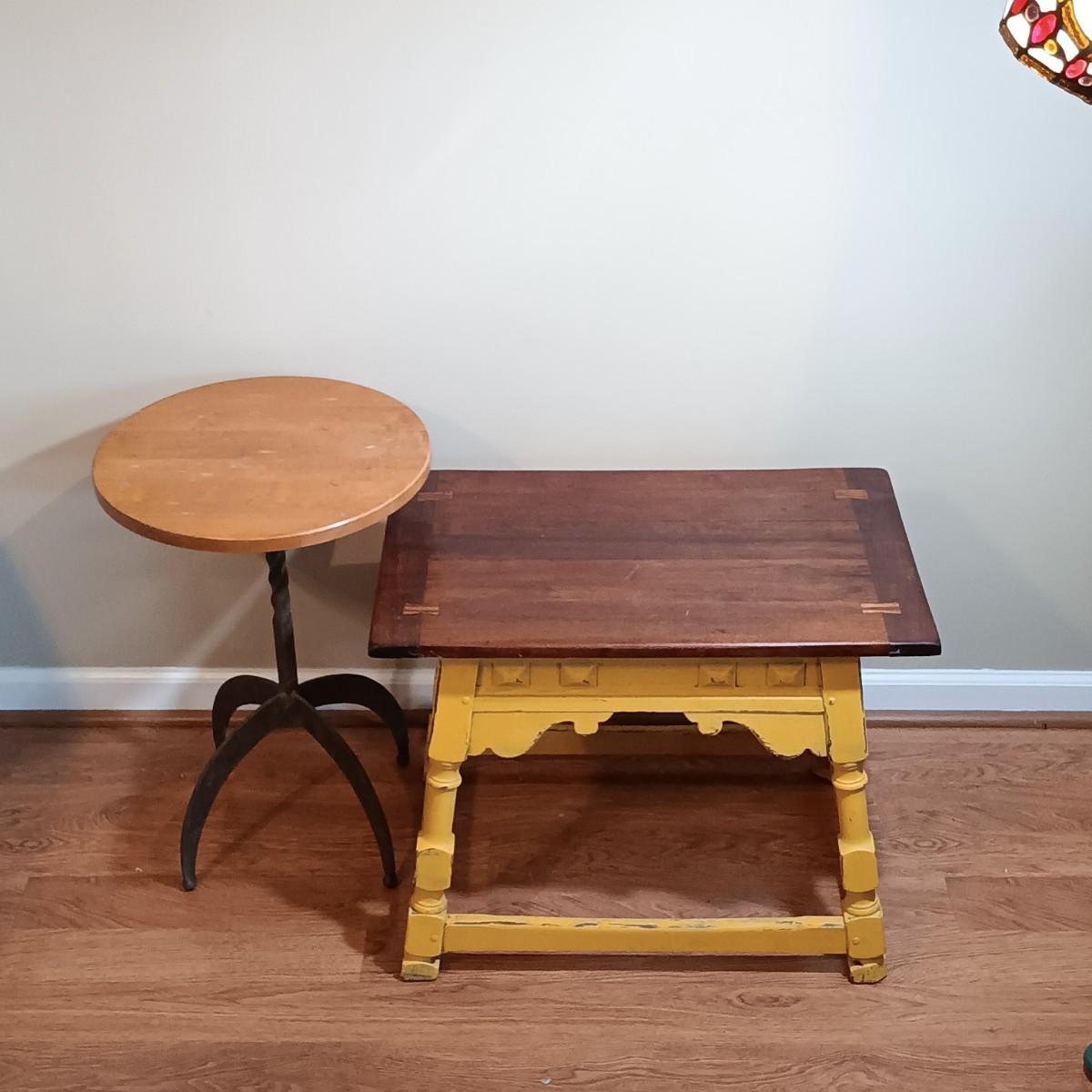 LOT 195: Ethan Allen Wrought Iron Base Side Table with Vintage Painted Side Table