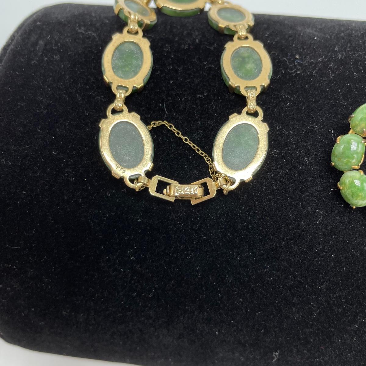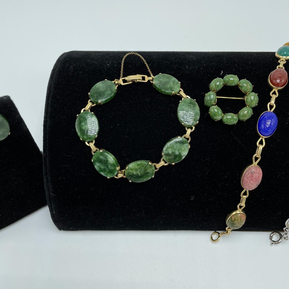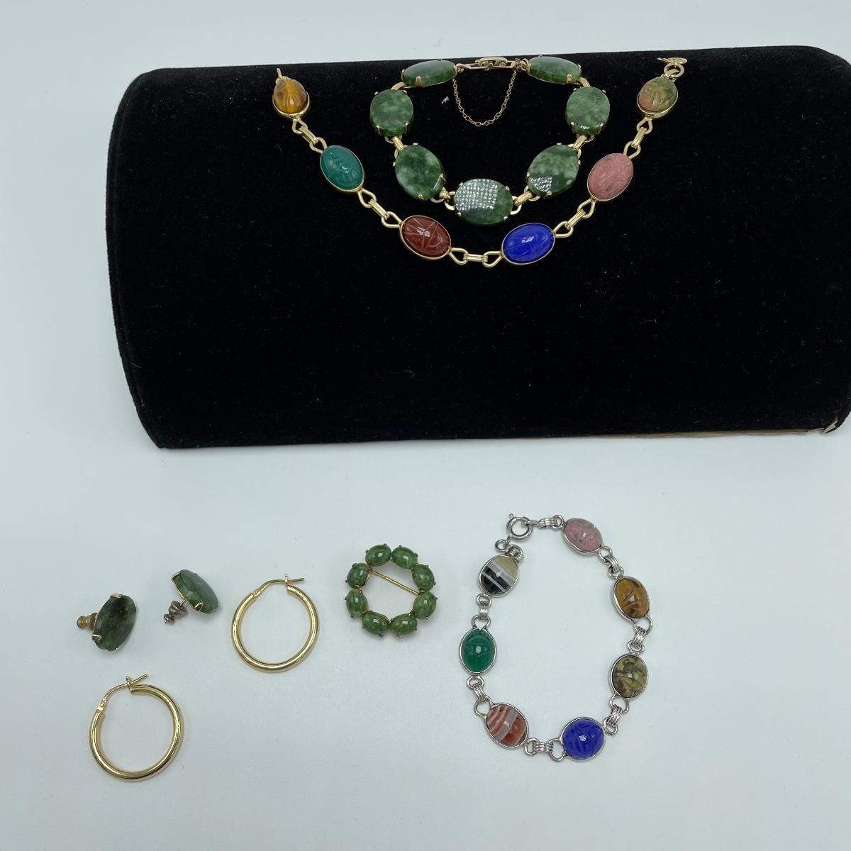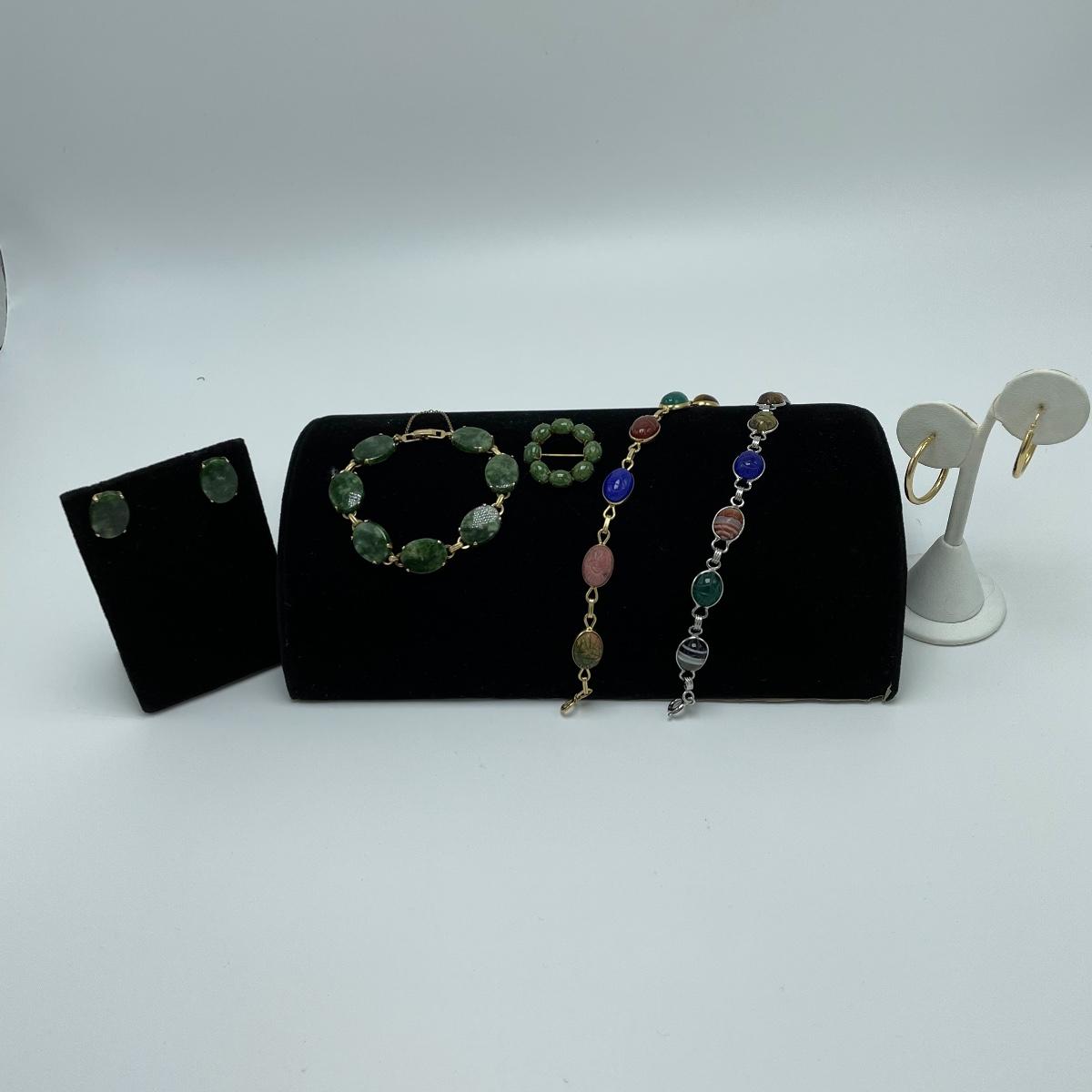 Three stunning bracelets with beautiful stones. Two bracelets are marked 14K, one is a multi-colored carved stones and another has a darker green jade colored stones. The dark green jade colored has a pair of unmarked matching earrings and a beautiful complementing pin. Lot also features two items marked Sterling and 925. A shining pair of gold colored hoop earrings marked 925 and another carved stone bracelet marked Sterling on its lobster clasp. See images. Shipping available.