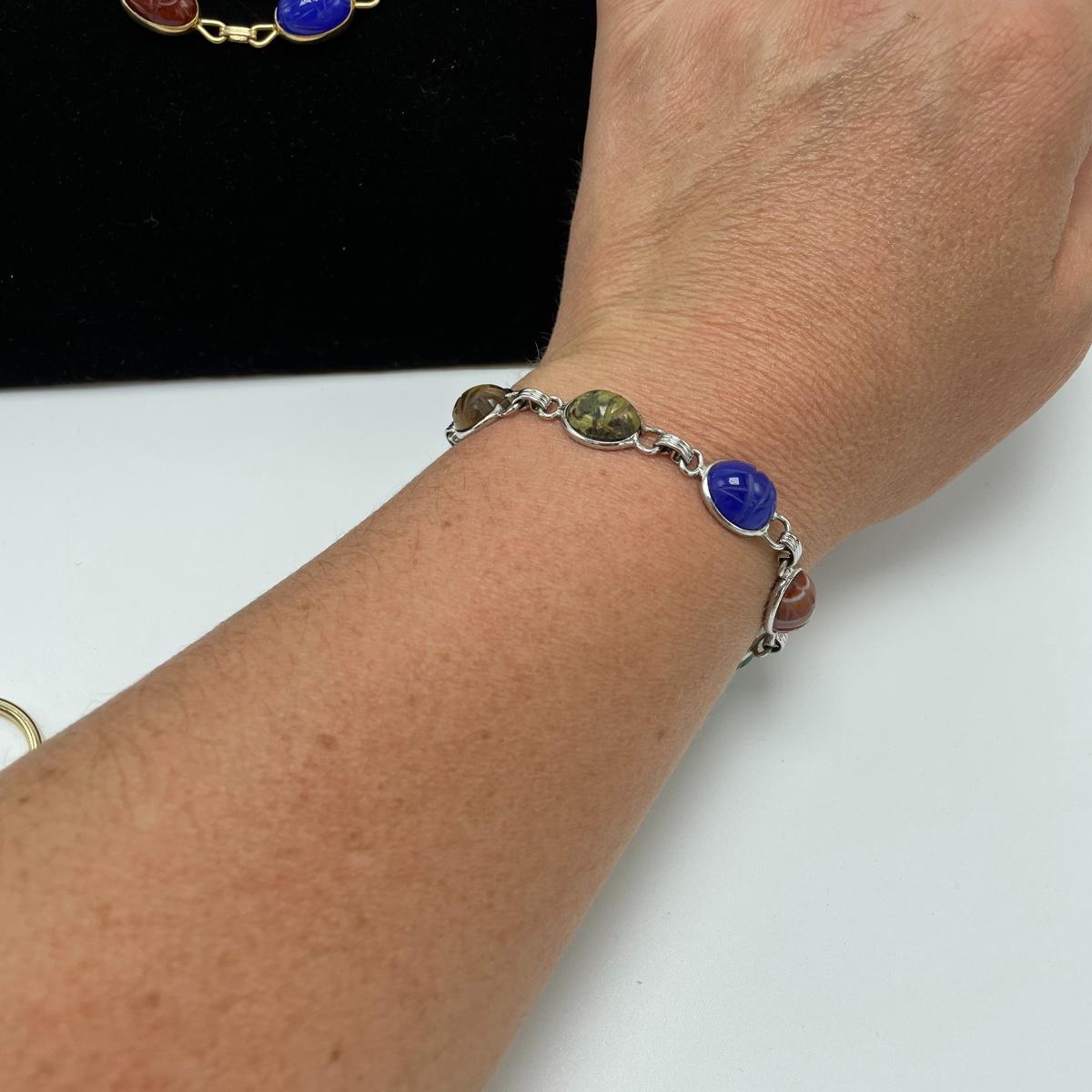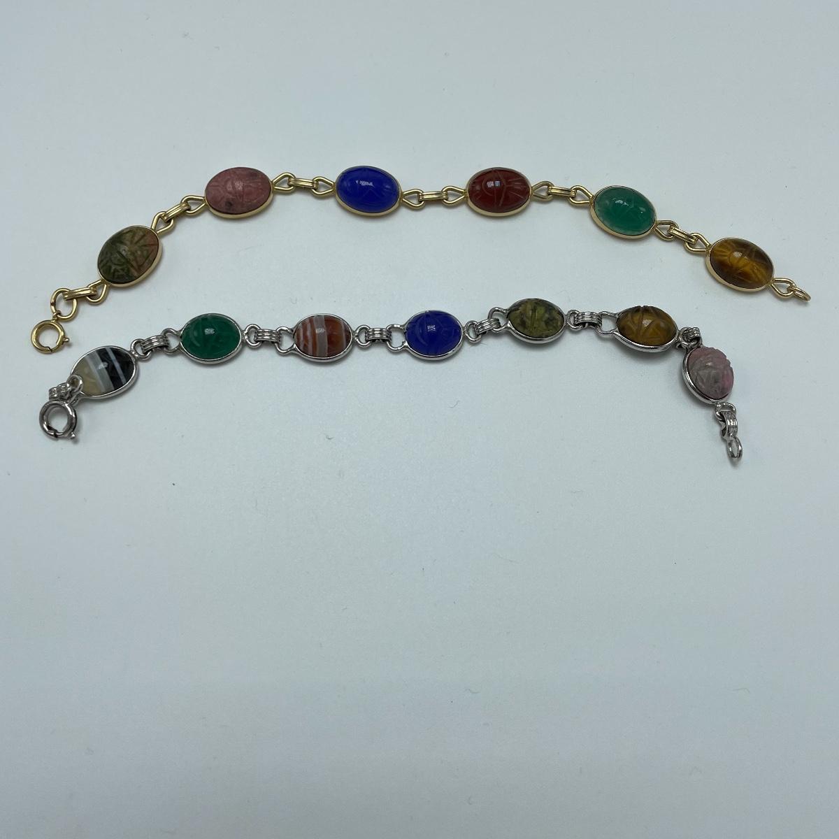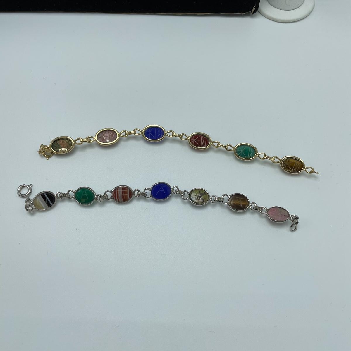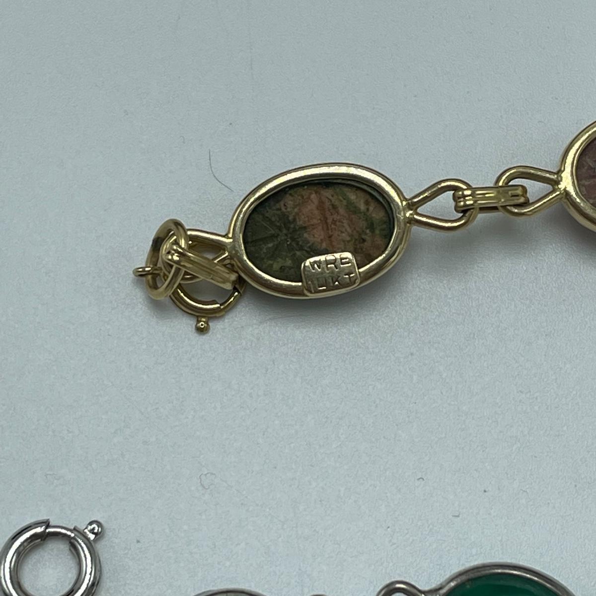 Three stunning bracelets with beautiful stones. Two bracelets are marked 14K, one is a multi-colored carved stones and another has a darker green jade colored stones. The dark green jade colored has a pair of unmarked matching earrings and a beautiful complementing pin. Lot also features two items marked Sterling and 925. A shining pair of gold colored hoop earrings marked 925 and another carved stone bracelet marked Sterling on its lobster clasp. See images. Shipping available.