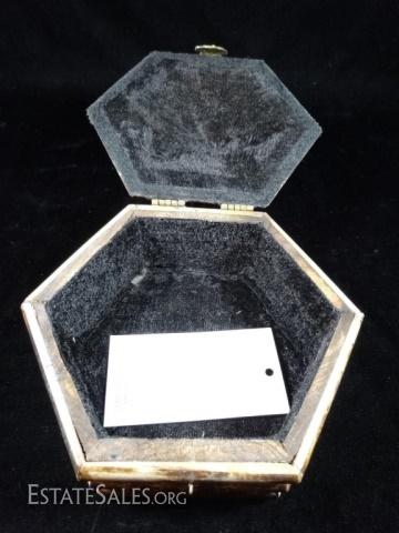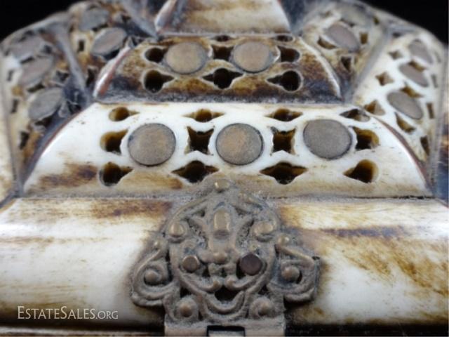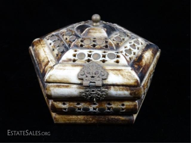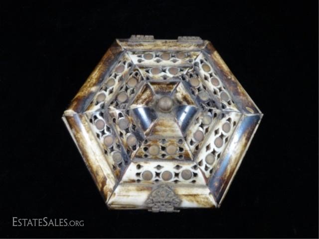LOT 195: 6 SIDED CAMEL BONE BOX, APPROX 7"