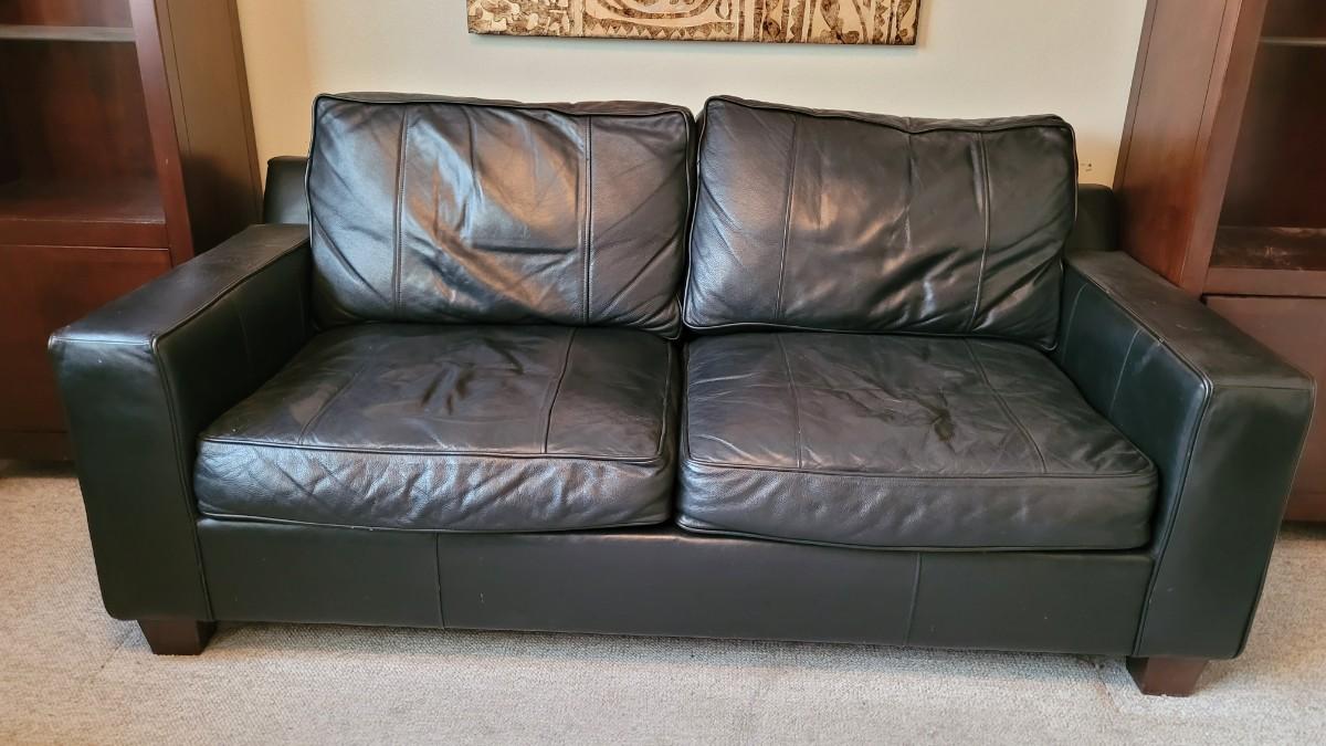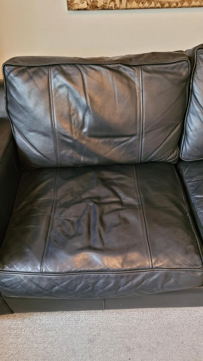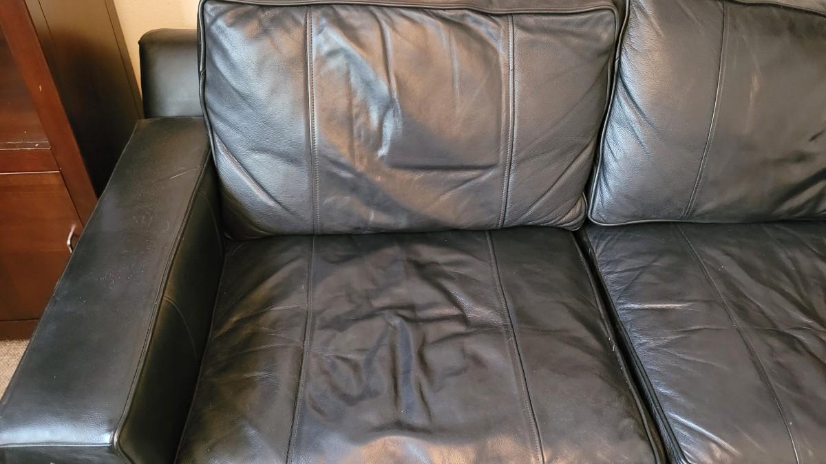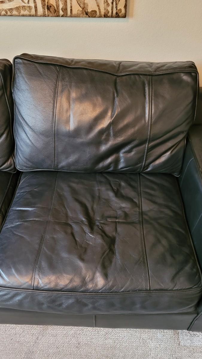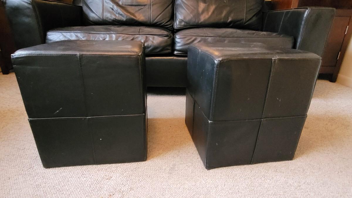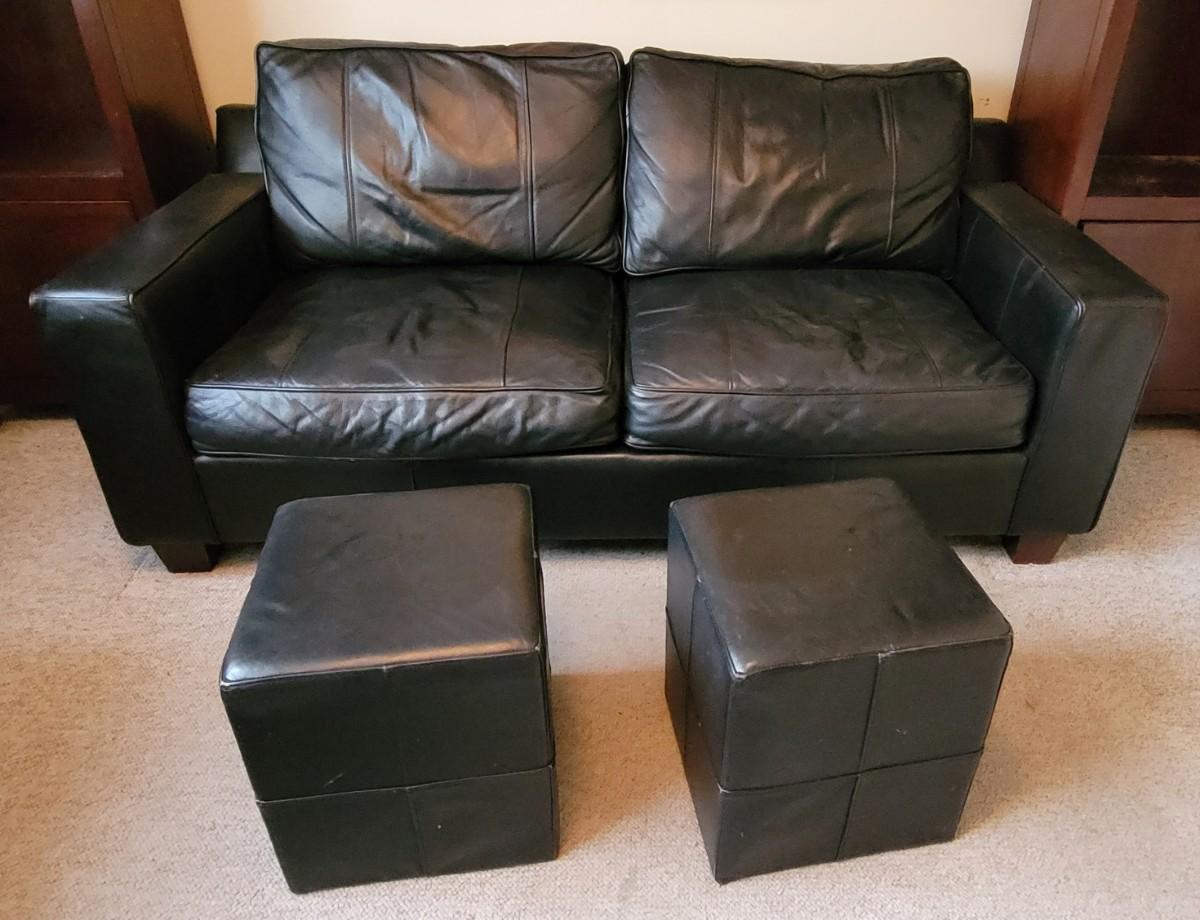 Lot 195: NORWALK FURNITURE Aniline Black Leather Down Filled Couch and 2 Matching Foot Stools