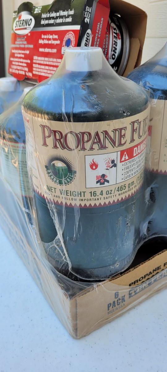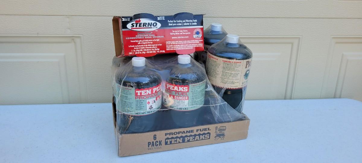Lot 195: Bundle of (6) Propane Camping Tanks + STERNO Cooking Fuel