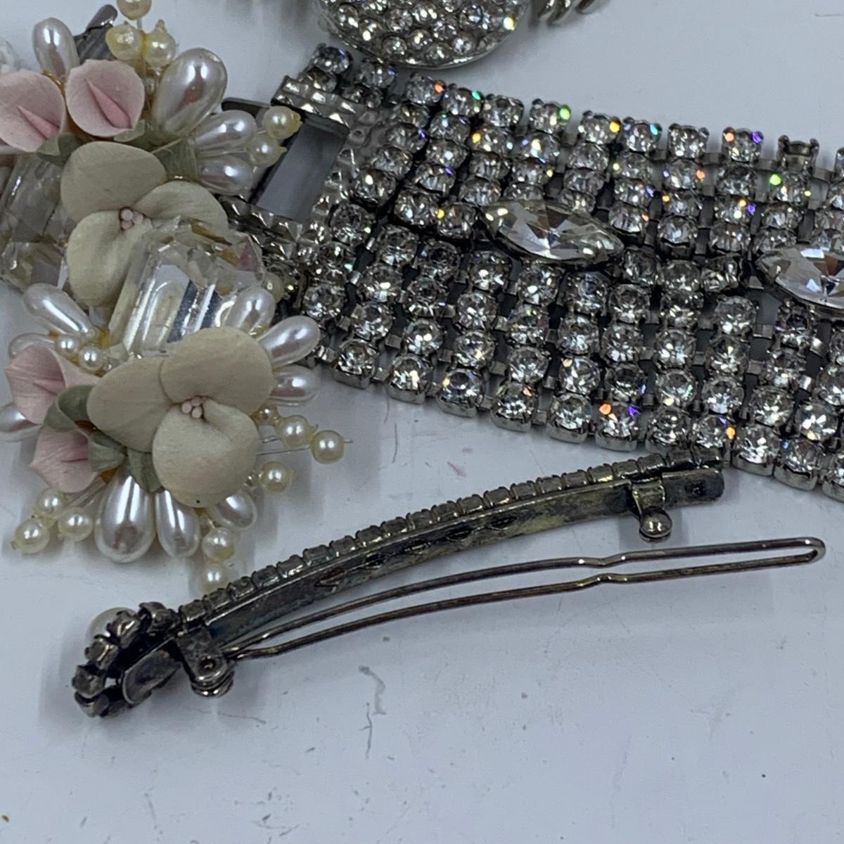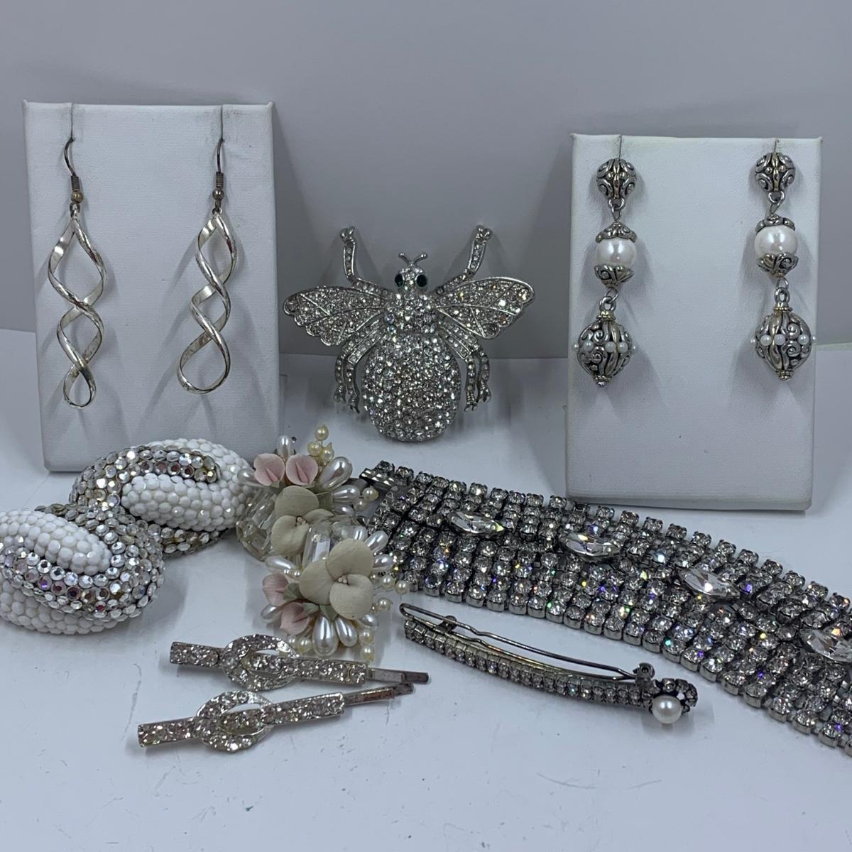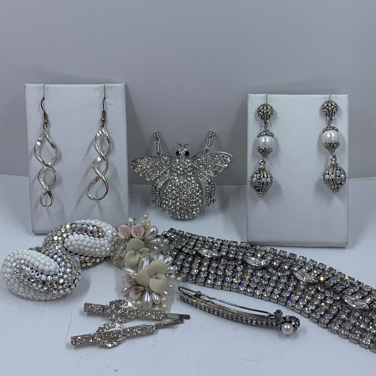 Lot 195: Silvertone & Rhinestones: Pierced & Clip Earrings, Hair Pins, Bracelet & Beetle Brooch