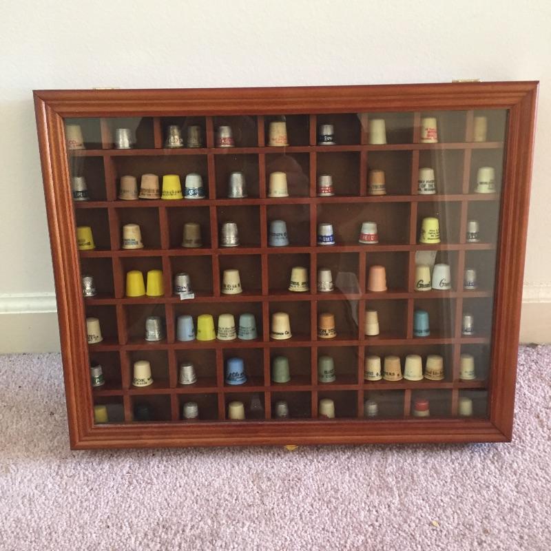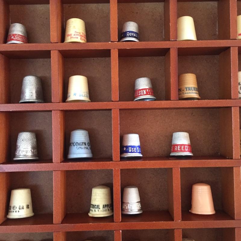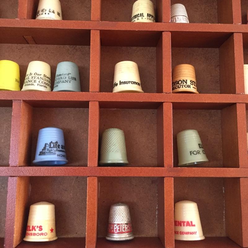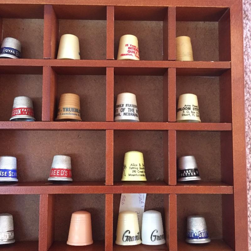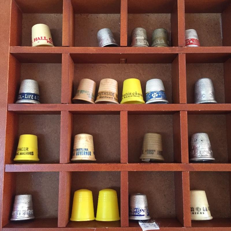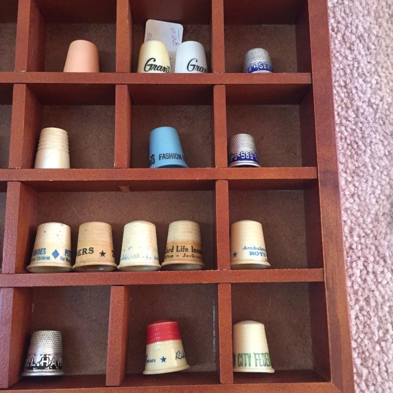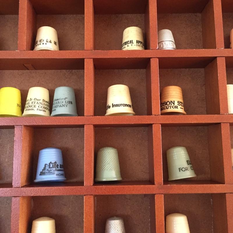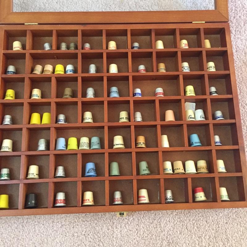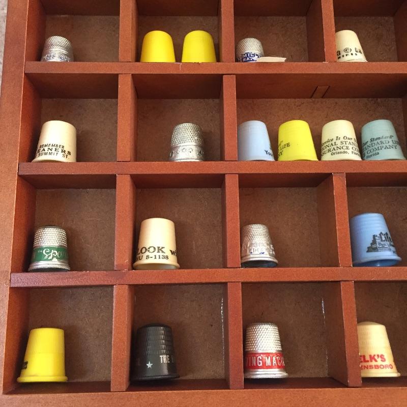 Large assortment of advertising thimbles in a display box. 72 total thimbles with 24 aluminum and 48 plastic. Box measures 12.75” x 16.25” x 2”.