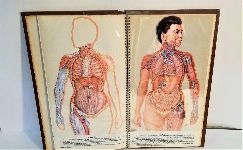 Wonderful 1950's anatomical studies of the human male and female - spiral bound - colored glassine sheets illustrate the muscles and organs of the body. Great vintage look.