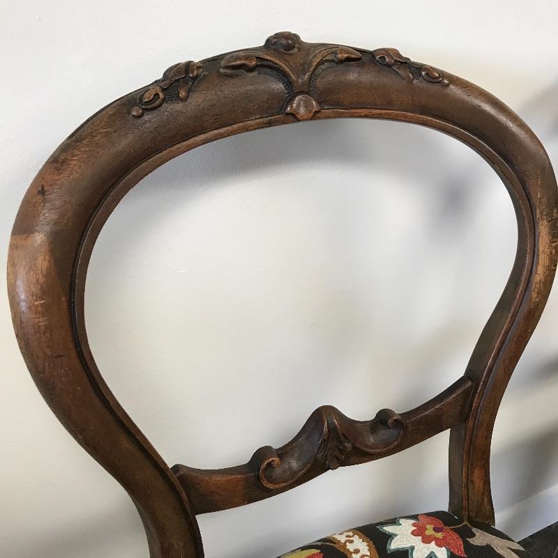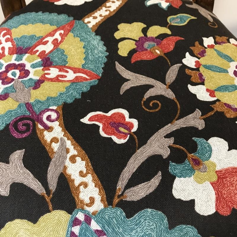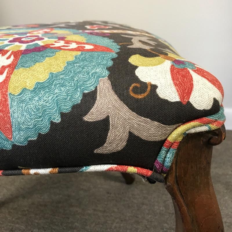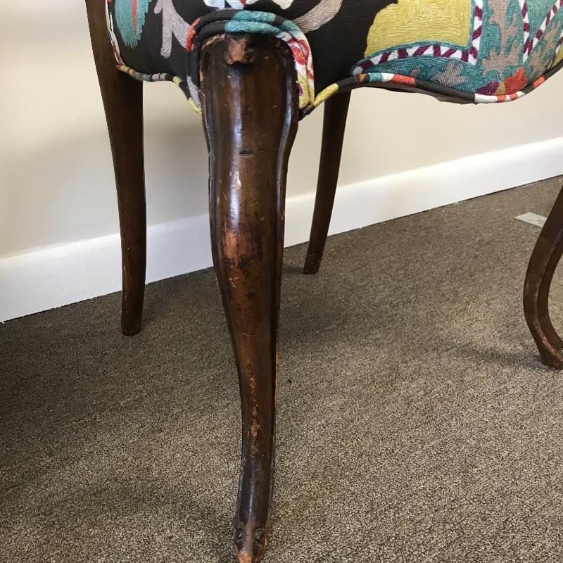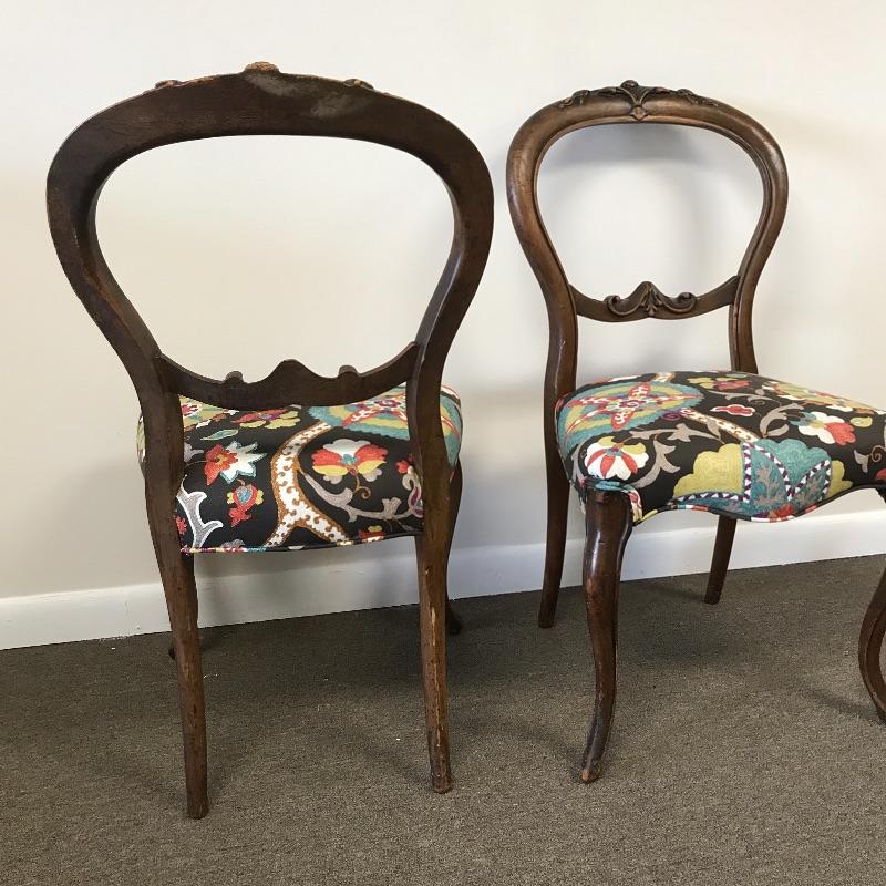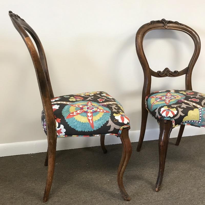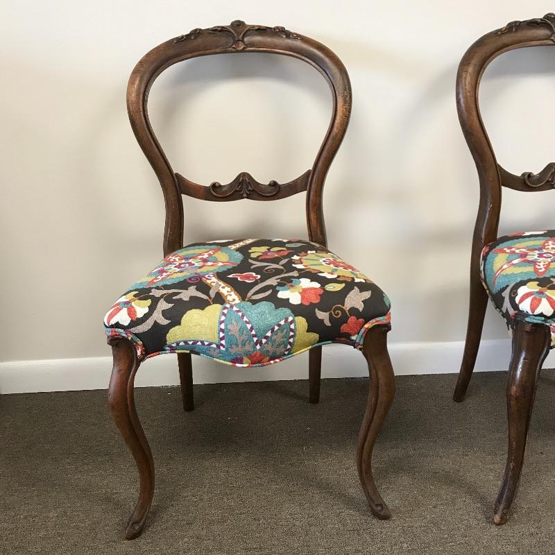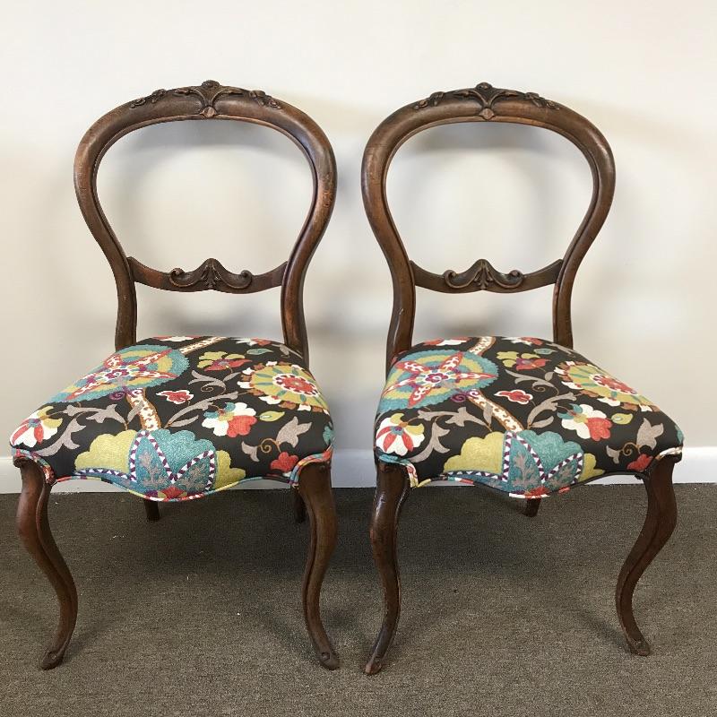 Stunning pair of antique chairs that have been updated with a bright happy modern fabric in greens, blues and black floral that have been well upholstered. Wood is a little worn on chairs. Measure 21” x 19” x 34” high. Local Shipping Only.
