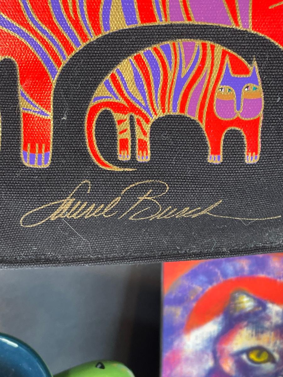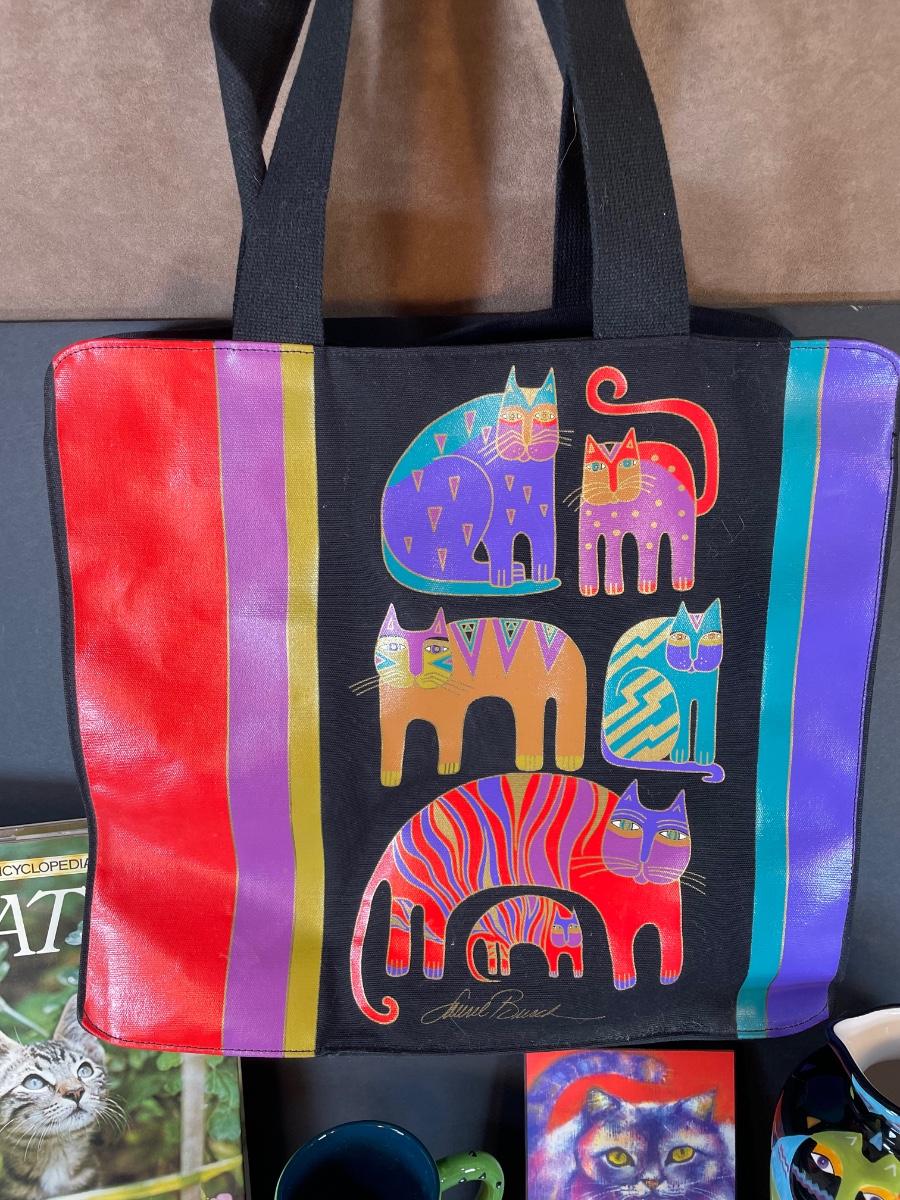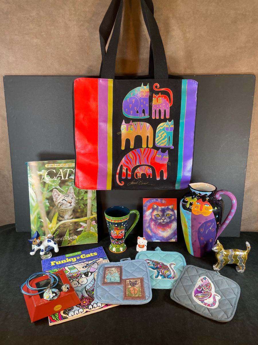 Goebel necklace and ring, 3 pot holders, Funky Cats Colring Book, Goebel cat figurine, Cat Encyclopedia, Tote bag-mug and Pitcher by Laurel Burch