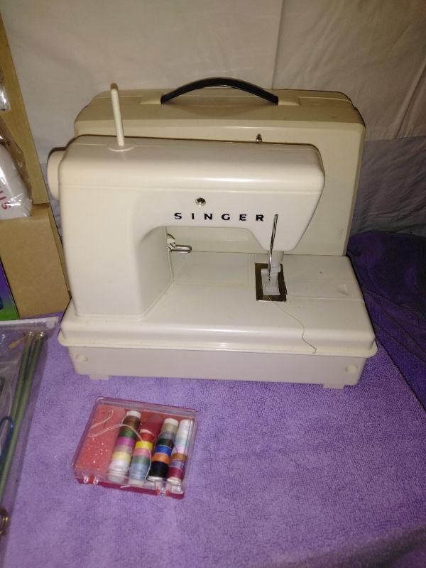 CHILD SIZE SINGER SEWING MACHINE, ASSORTED THREAD AND SEWING ITEMS, TWO SINGER SCISSORS.