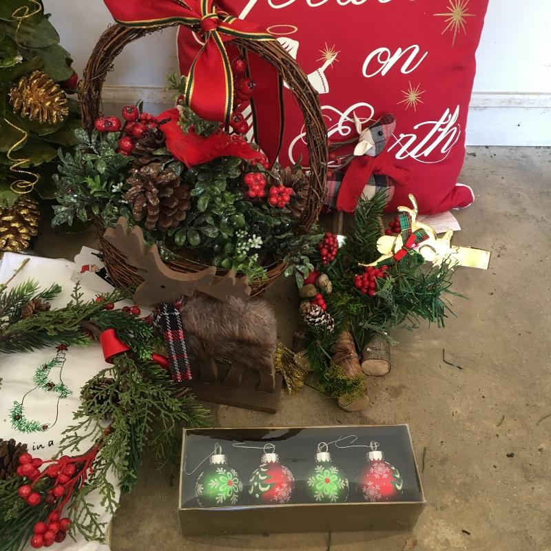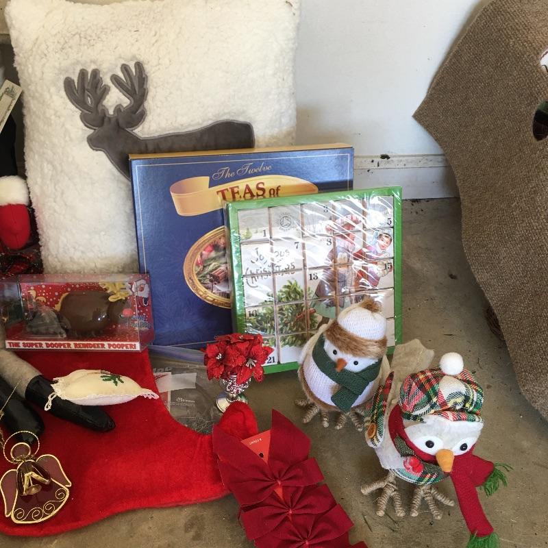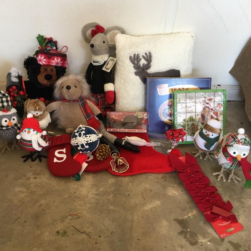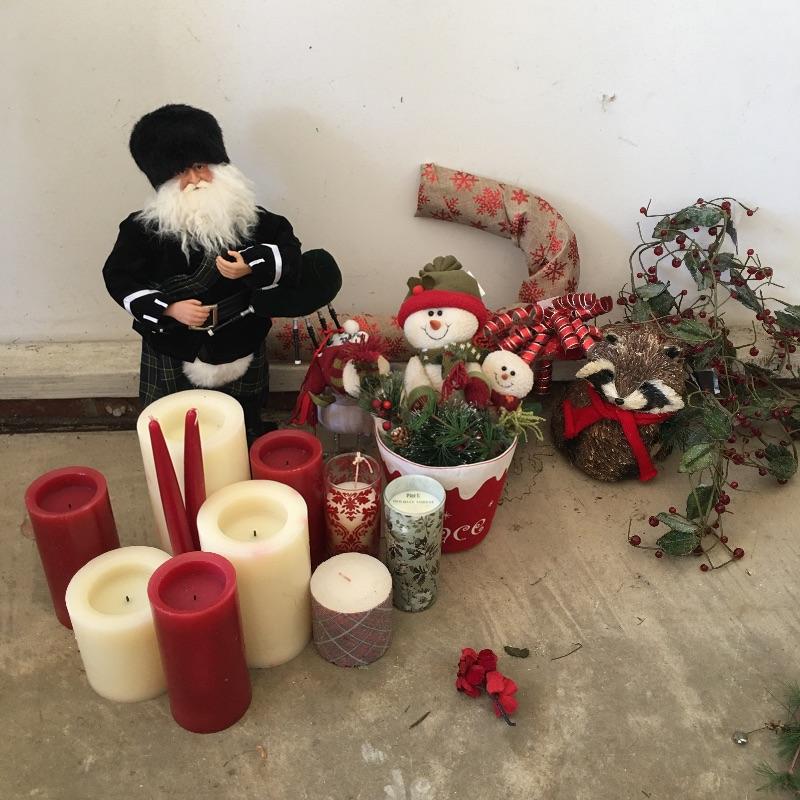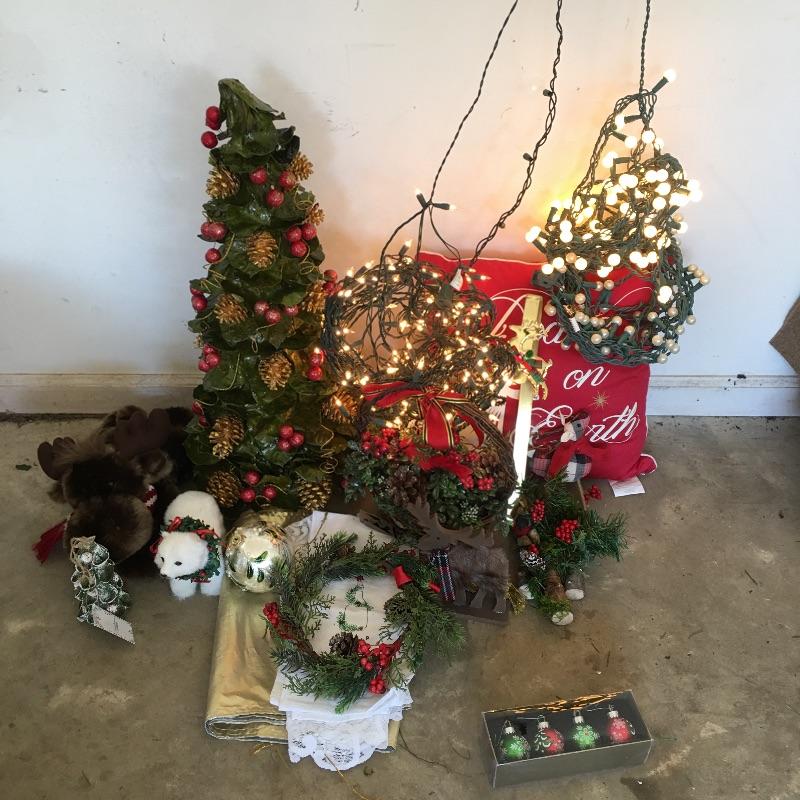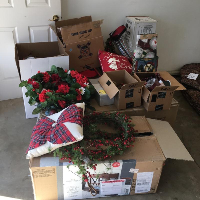 This large Christmas lot will have you in the holiday mood In no time. Lot includes 7.5 ft. lighted tree, 4 ft. lighted tree, wrapping paper, ornaments, candles, pillows, wreaths and a large selection of Christmas decorations and more.