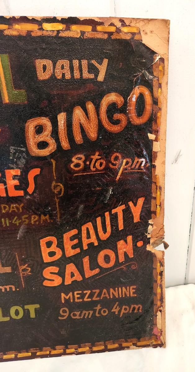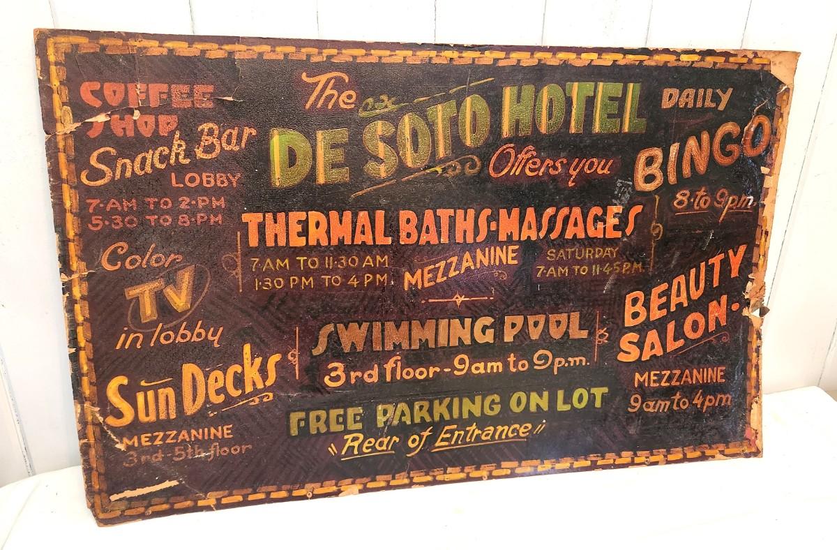 From the old DeSoto Hotel in Hot Springs, Arkansas. Check out this great hand-painted sign on heavy cardboard - notes that they offer "thermal baths", a beauty shop, and a Color tv in the lobby! Measures 35" x 22". Check out all photos - a bit "raggedy" around the side edges, but does not detract from this great piece's history.