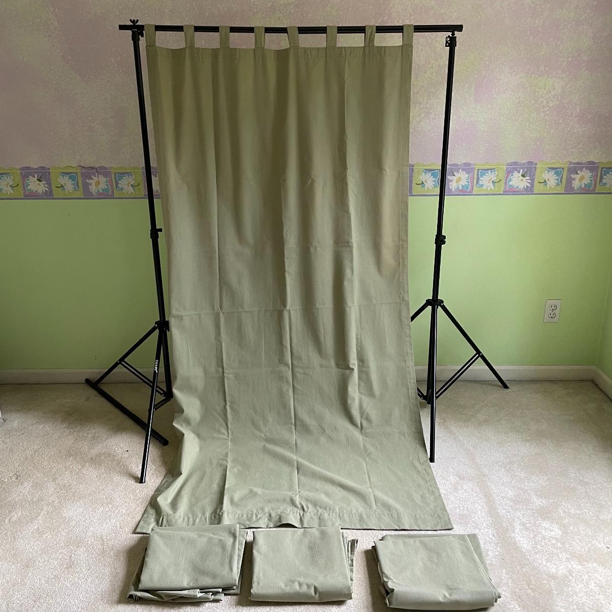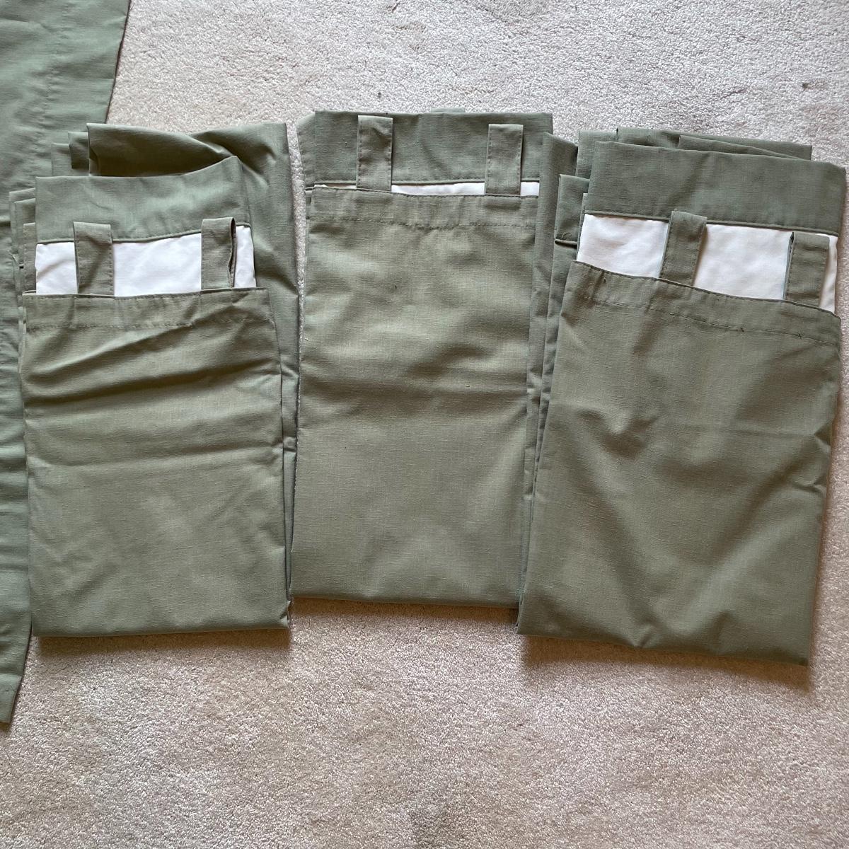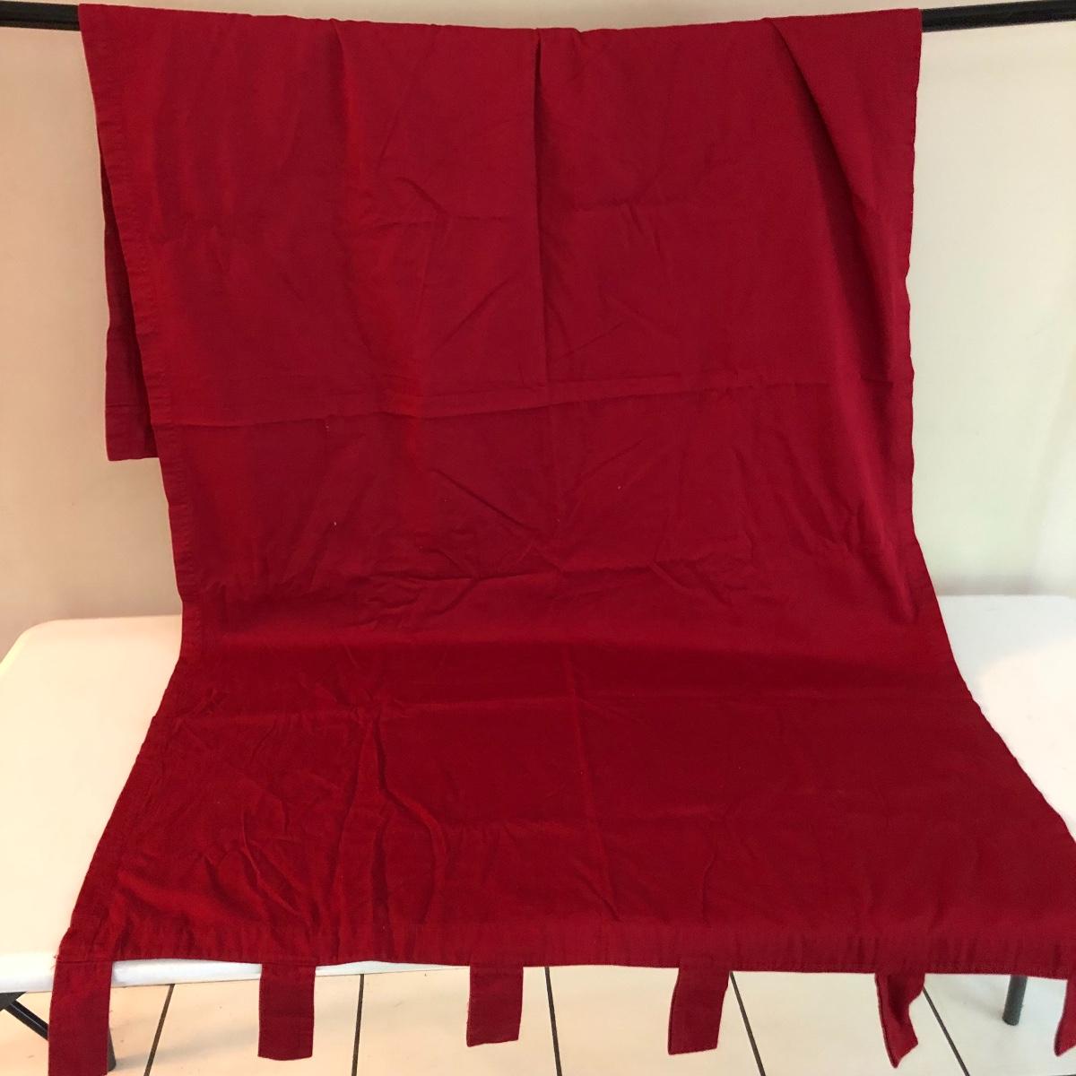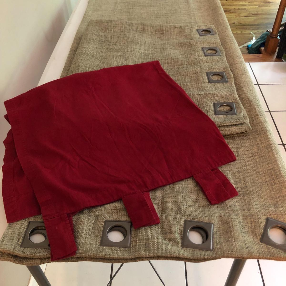 This matching set of nice light olive green woven drapes will work well with most any decor color scheme as they are an attractive and fairly neutral color. They have metal accent grommets where the curtain rod feeds through and both measure 52” x 84”. Lot features a set of four mild olive green curtains measuring approximately 40” x 82” each. Also included is a dark red tab top drape, measurements in image. Shipping available