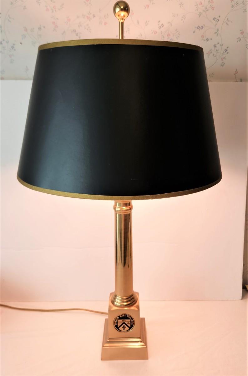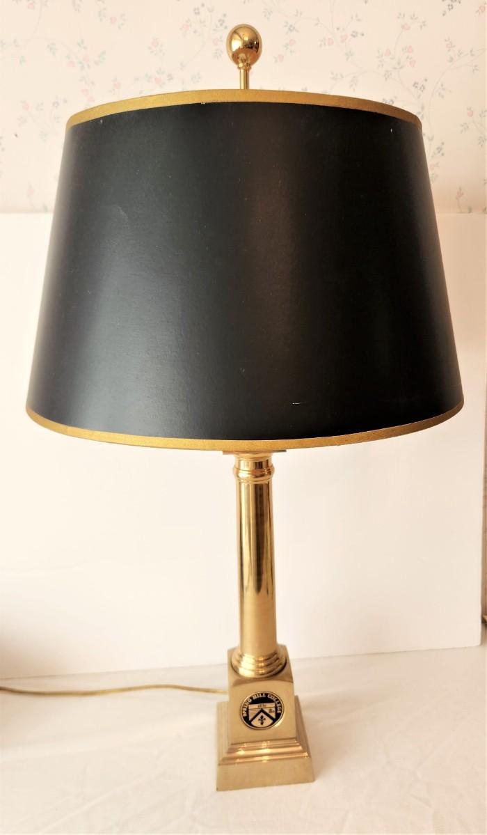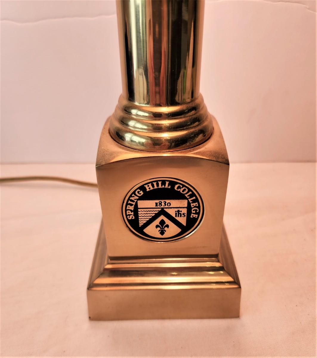 Brass plated table lamp - 2 bulbs - good working condition, 27" tall. Spring Hill College (Mobile) commemorative.