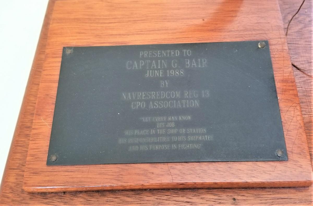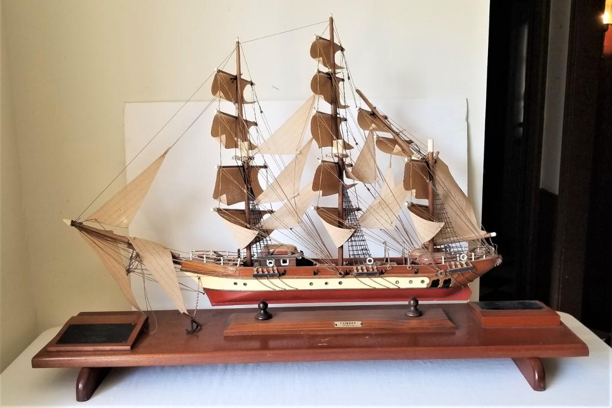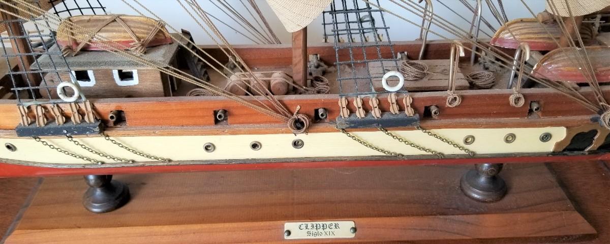 Large (39" long) Clipper Ship model on wooden base (Clipper Sigle XIX) - a presentation piece gifted to a naval captain upon his retirement. Piece is 26" tall, 9" wide. Presentation plaque could be removed and replaced. Vintage condition.