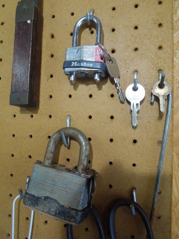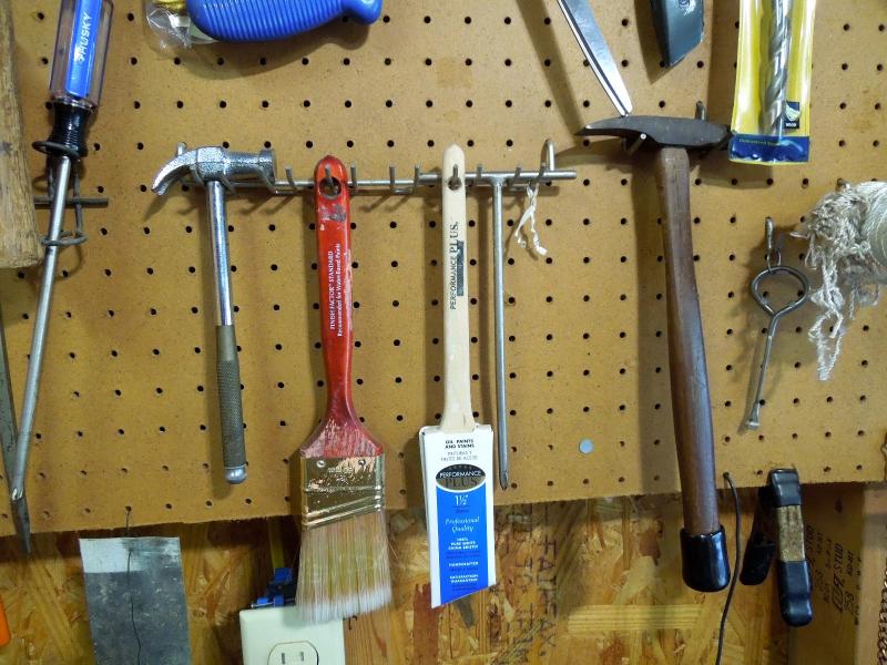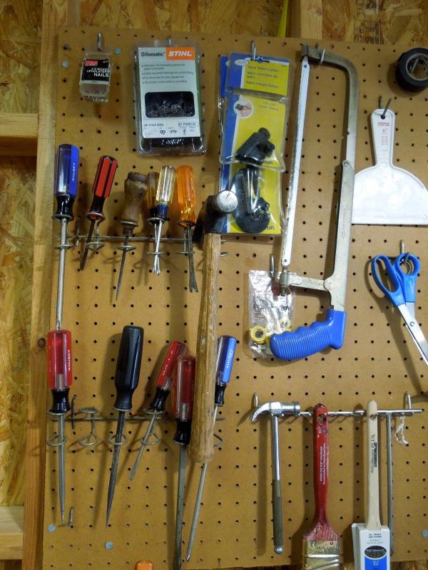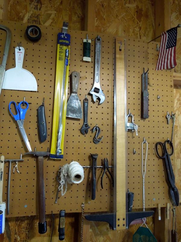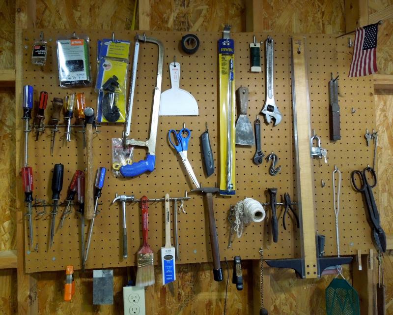 Saw, screw drivers, wrenches, tin snips, paint brushes, padlock with keys, pliers and more. Also includes peg board for hanging them on and small American flag!