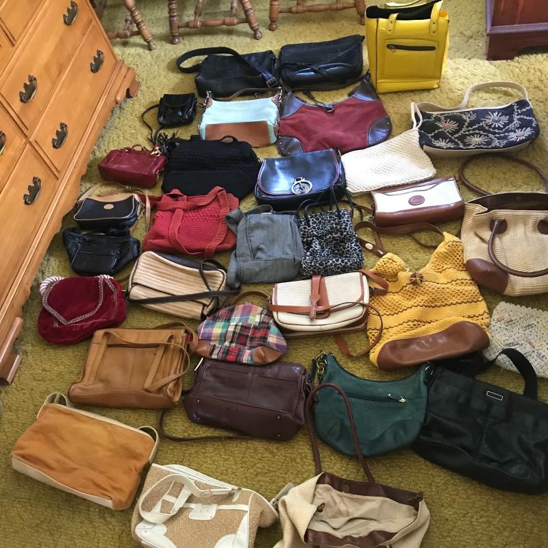 Lot includes 33 purses of varying sizes and materials. Includes three Downey & Bourke (can not verify authenticity), a few Tignanello brands, Stone Mountain, Worthington and more. Some vintage styles and several leather ones. See pix for details. Local pickup only.