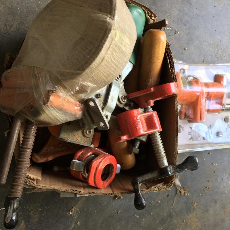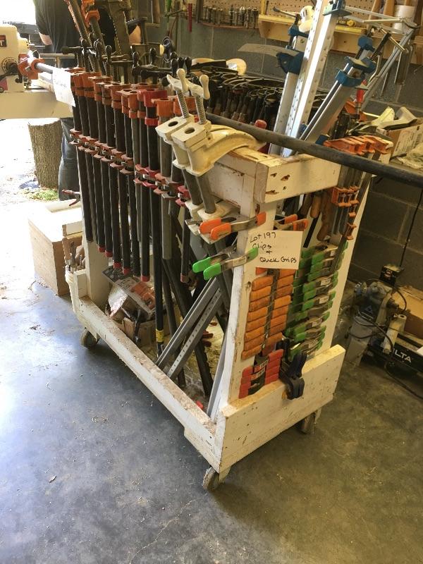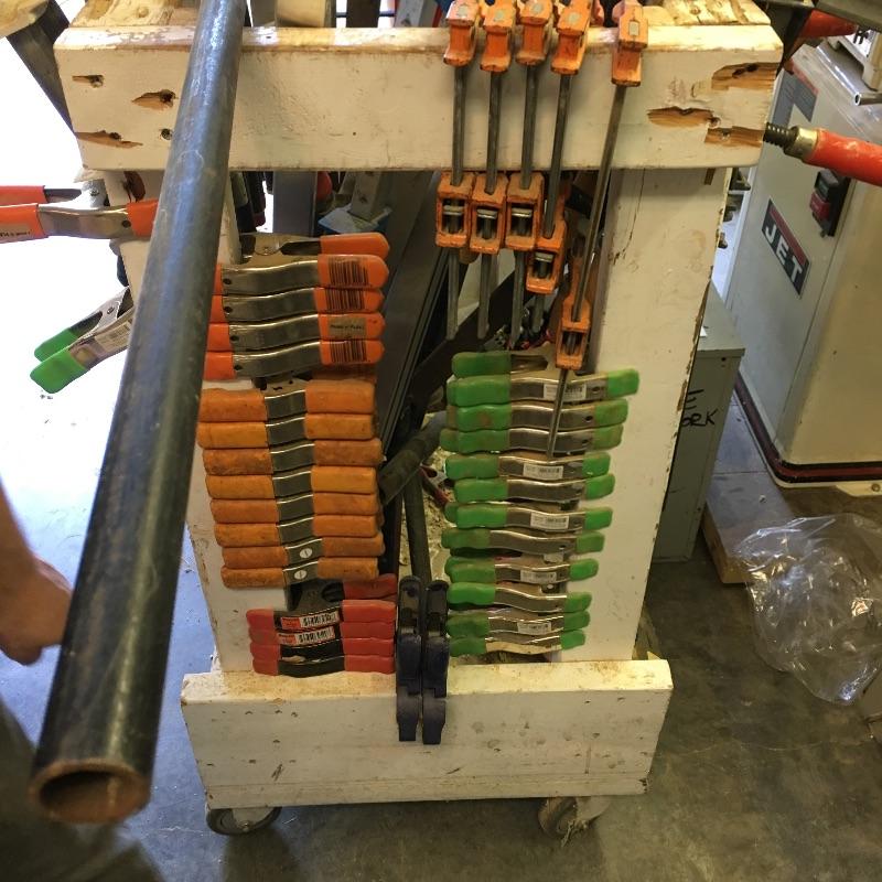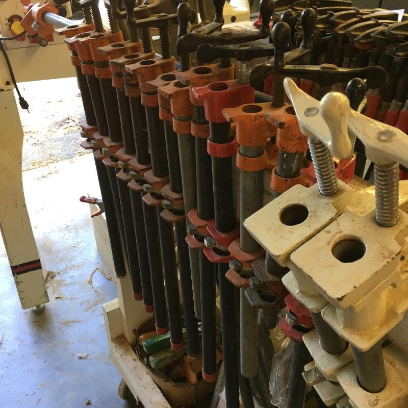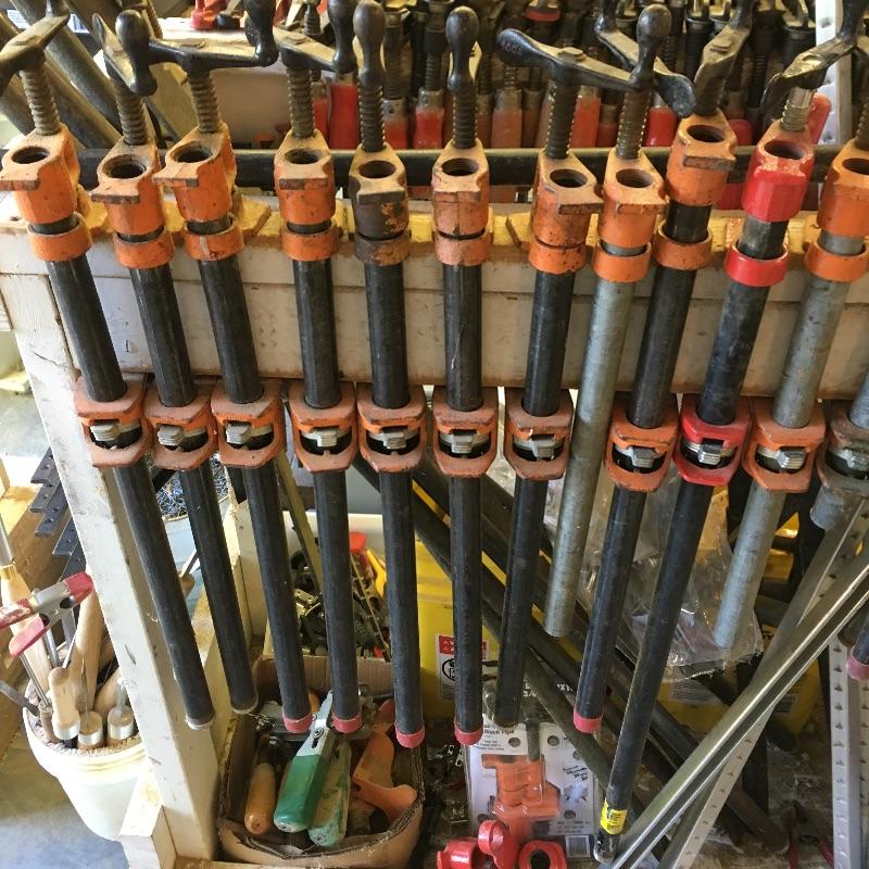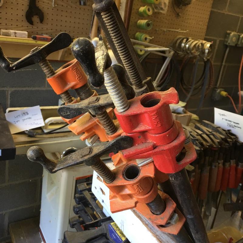 Large collection of pipe clamps. Twenty pipe clamps in sizes ranging from 12” - 80”. Just 20 pipe clamps and clamp cart and small cardboard box with clamp parts. Other clamps pictured are in lots 196 - 198.