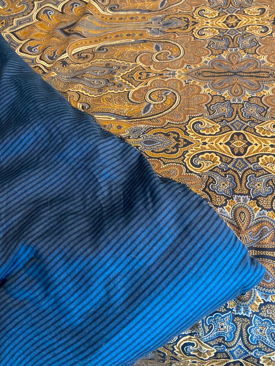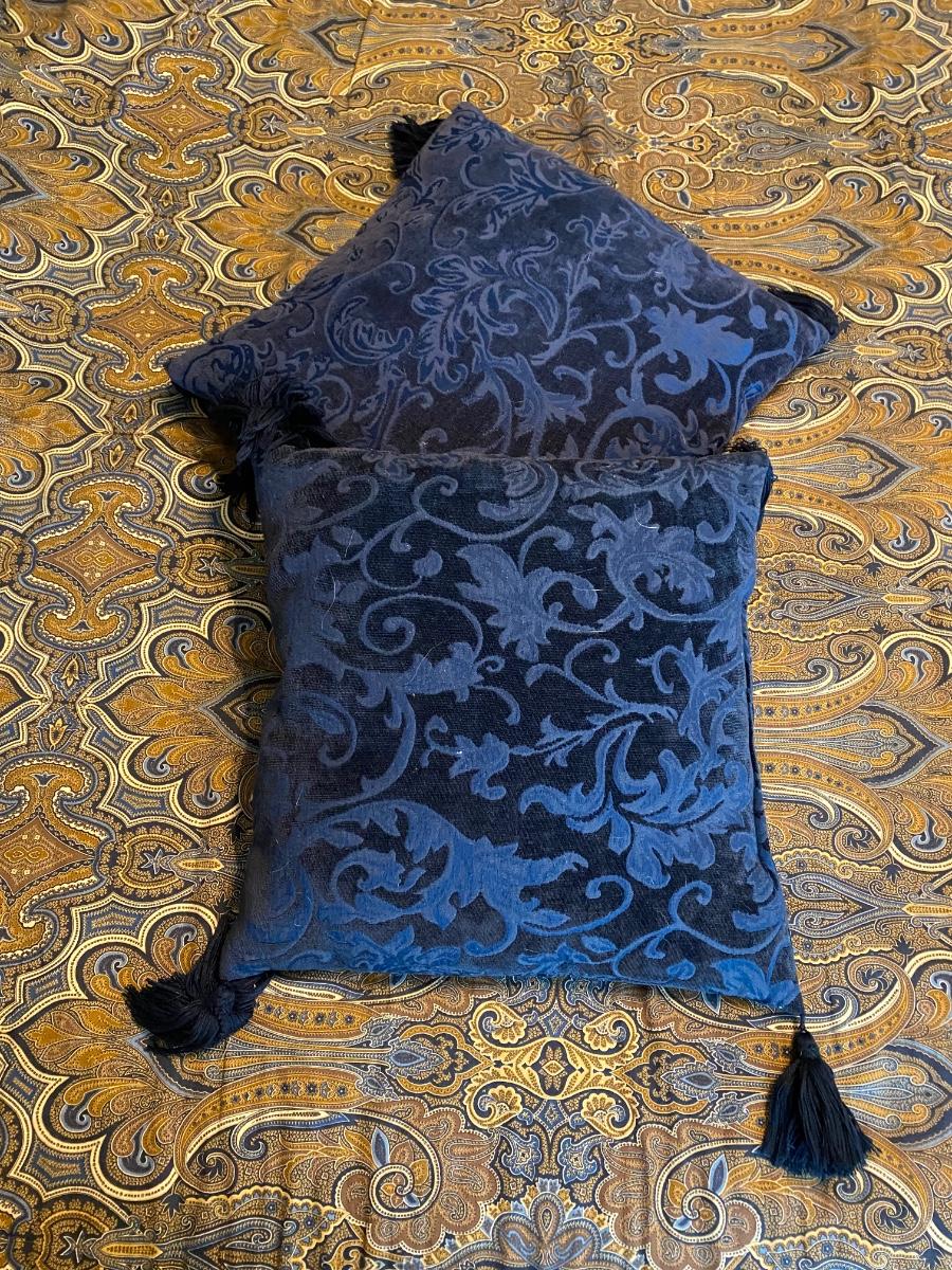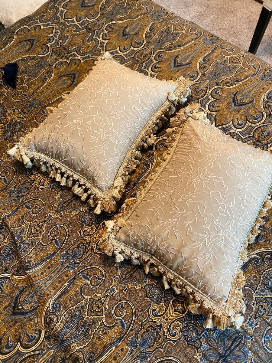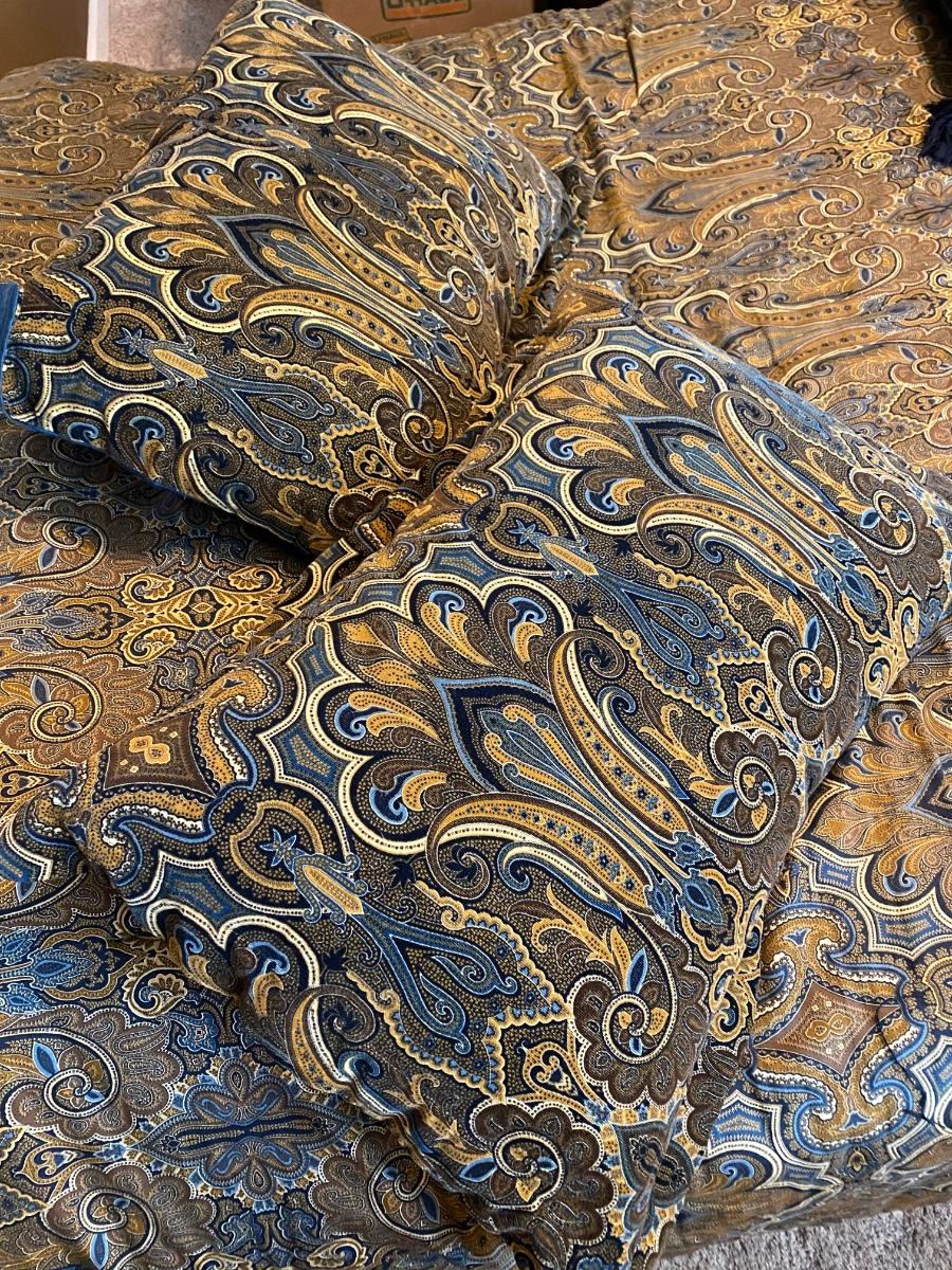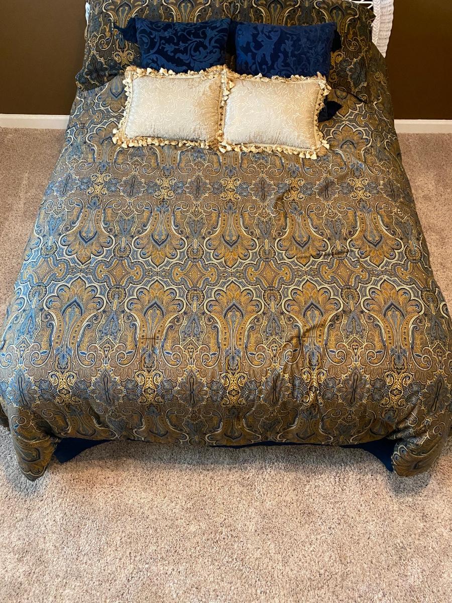 Includes bedskirt, pair of matching standard shams, two tan decorative pillows, two blue decorative pillows and a queen poly-fill comforter