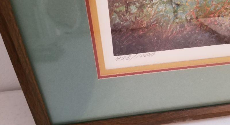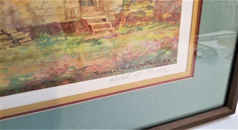 Robert Rucker signed/numbered limited edition print - #428/1000, pencil signed. Triple matted, measures 34.75" x 26". Good condition. Depicts a paddle wheeler chugging down the bayou past a remote cabin.