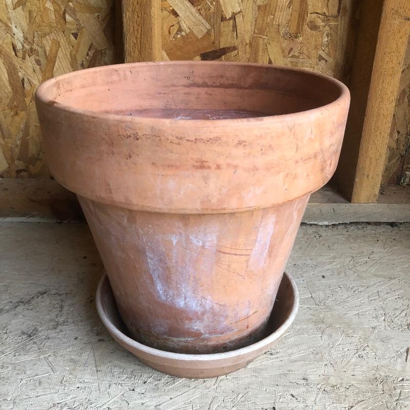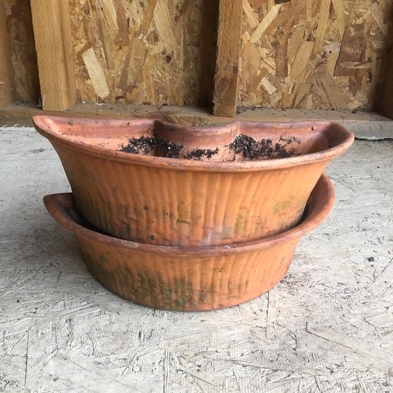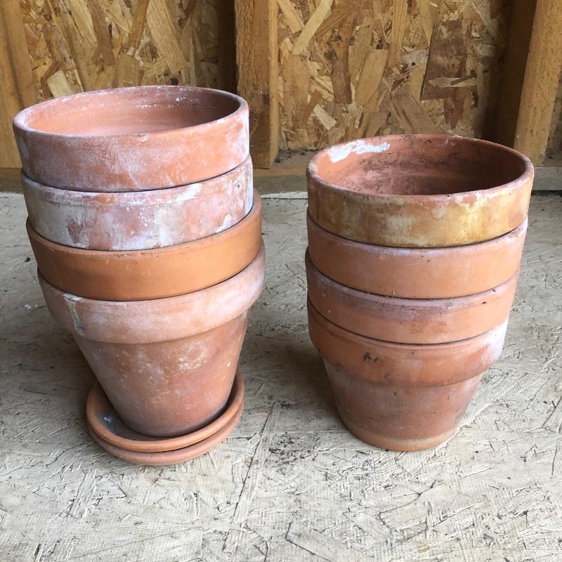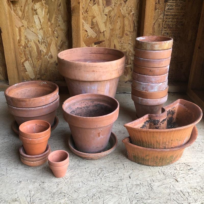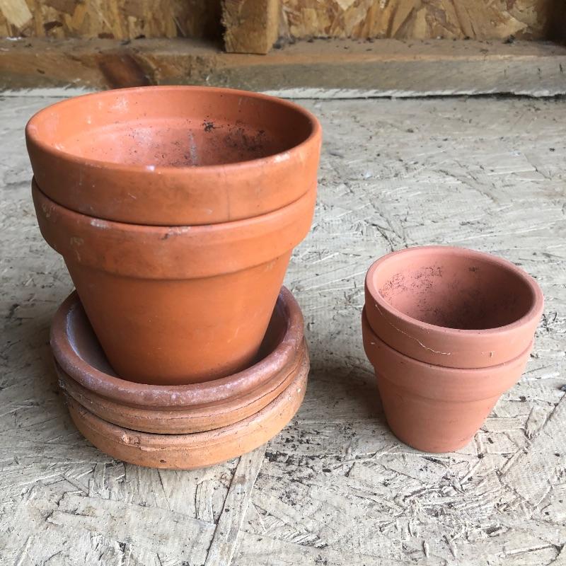 Lot includes a variety of terra cotta pots with plant saucers. These pots are perfect for all your planting needs and will provide you with endless possibilities. This lot is great for anyone wanting to start a garden or just perfect one they arleady have. Some of the pots have cracks or chips. Tallest pot is 13"W x 12.5"H. Smallest pot is 3"W x 2.5"H. Crescent pots are 14"W x 7"D x 4"H. Local pick up only.