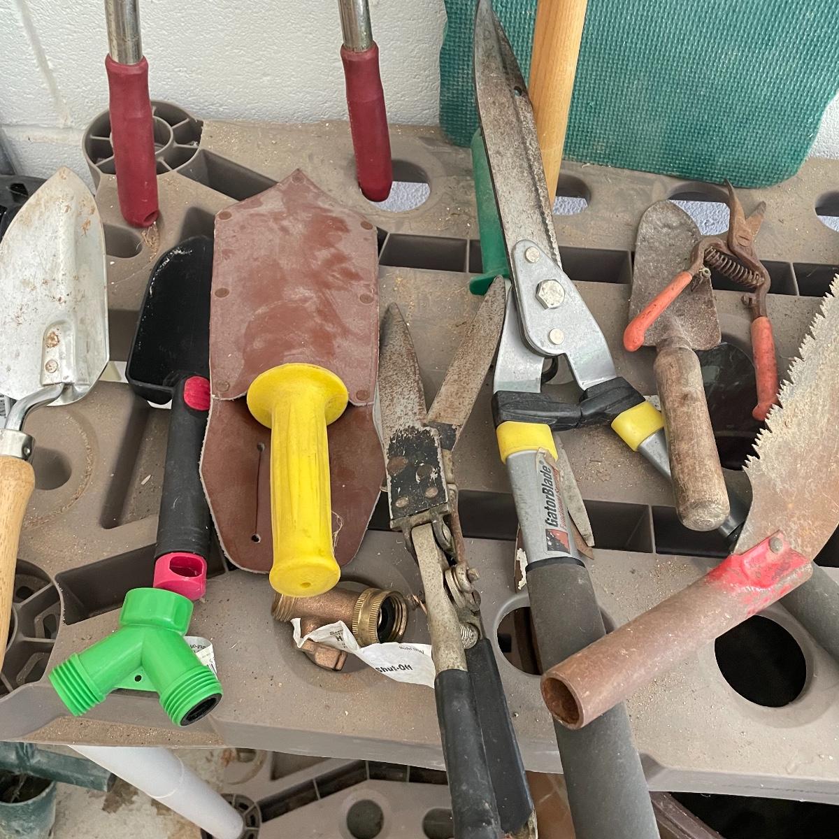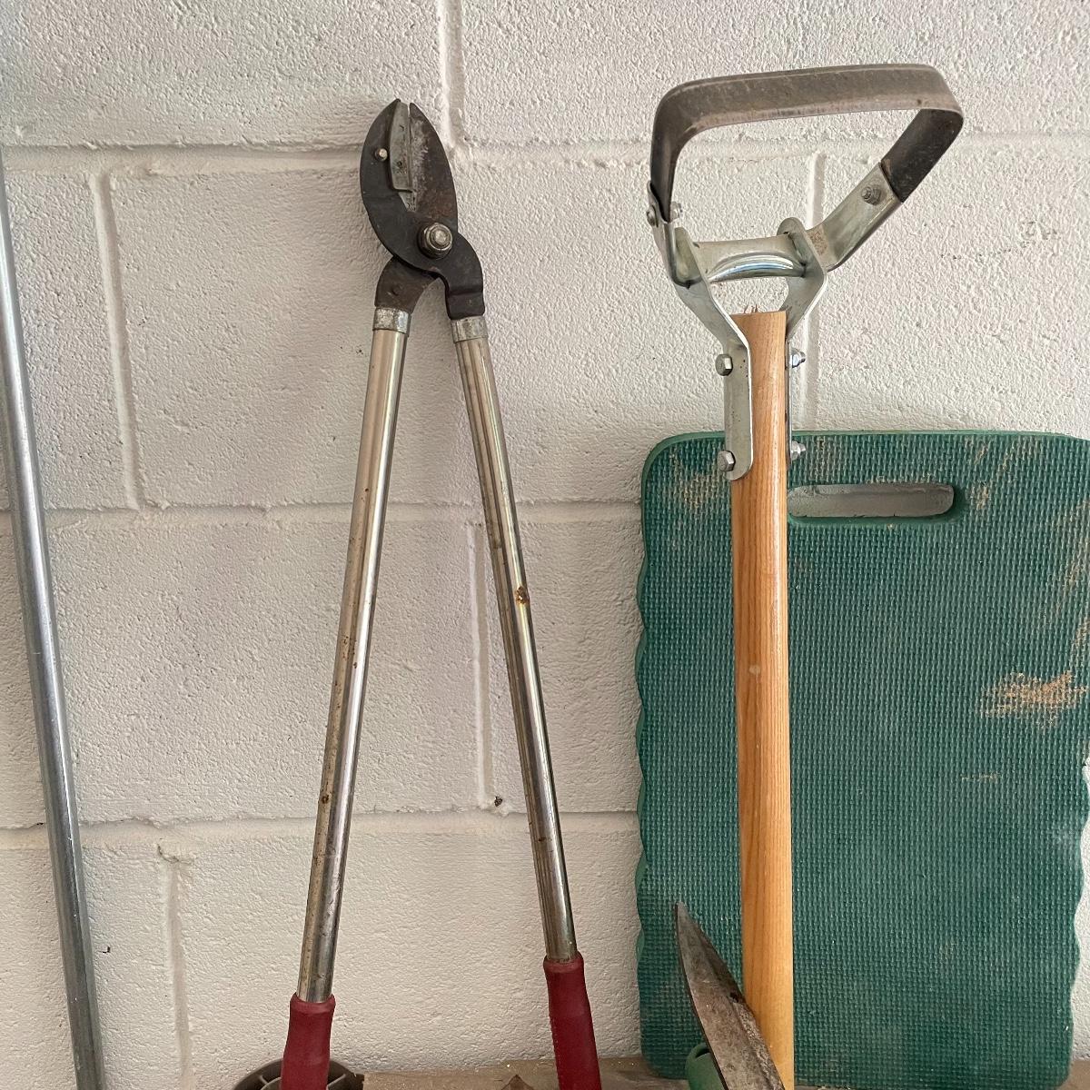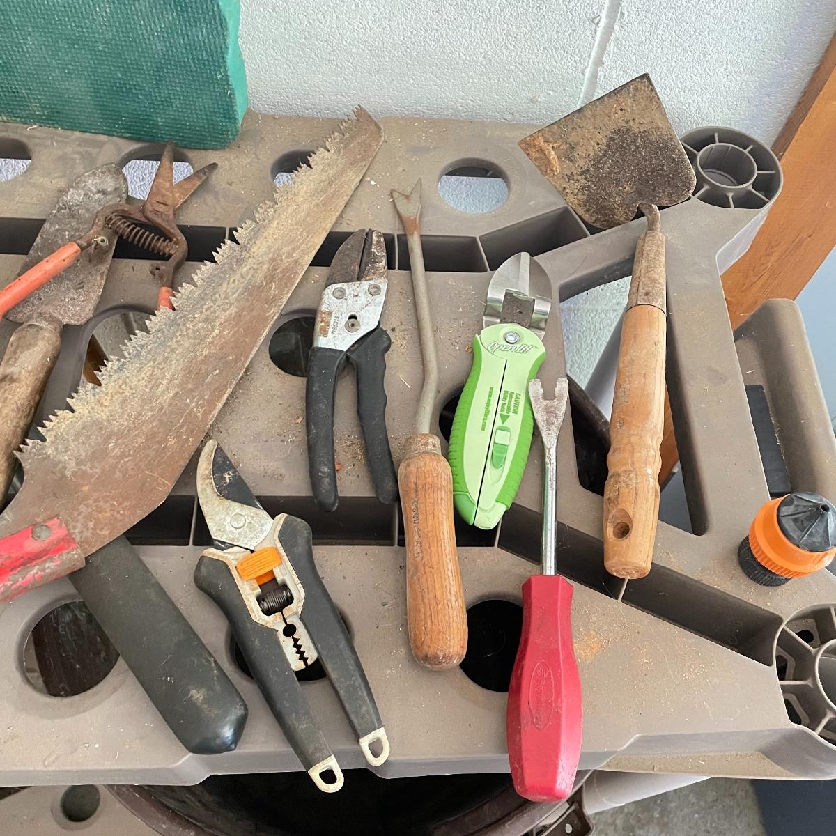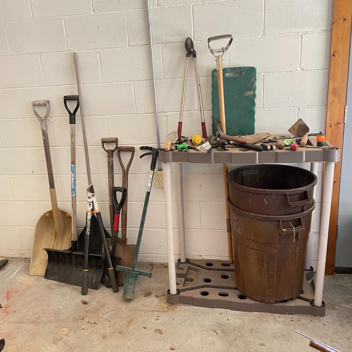 Get all your yard and garden tools here and keep them organized! The tool stand is pictured at 36” x 18” x 38”, but has nesting legs and can be shortened to about 21”. Two short rubbish bins are in nice shape, a little dirty, measuring 19”d x 22” each. The manual yard tools include clipper, snow shovels, bulb hound, saw and more! One knee pad is thrown in the mix, so you can be comfortable keeping your garden pretty! See images. Local pick up only.
