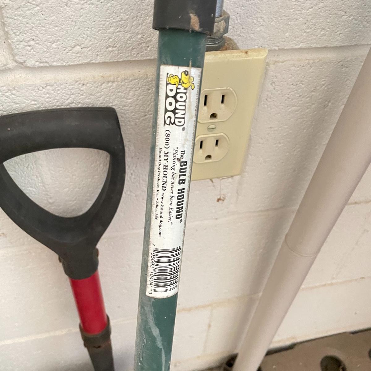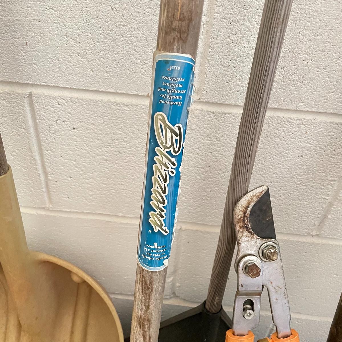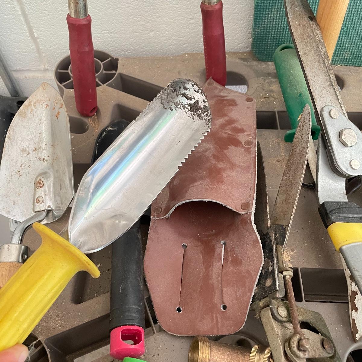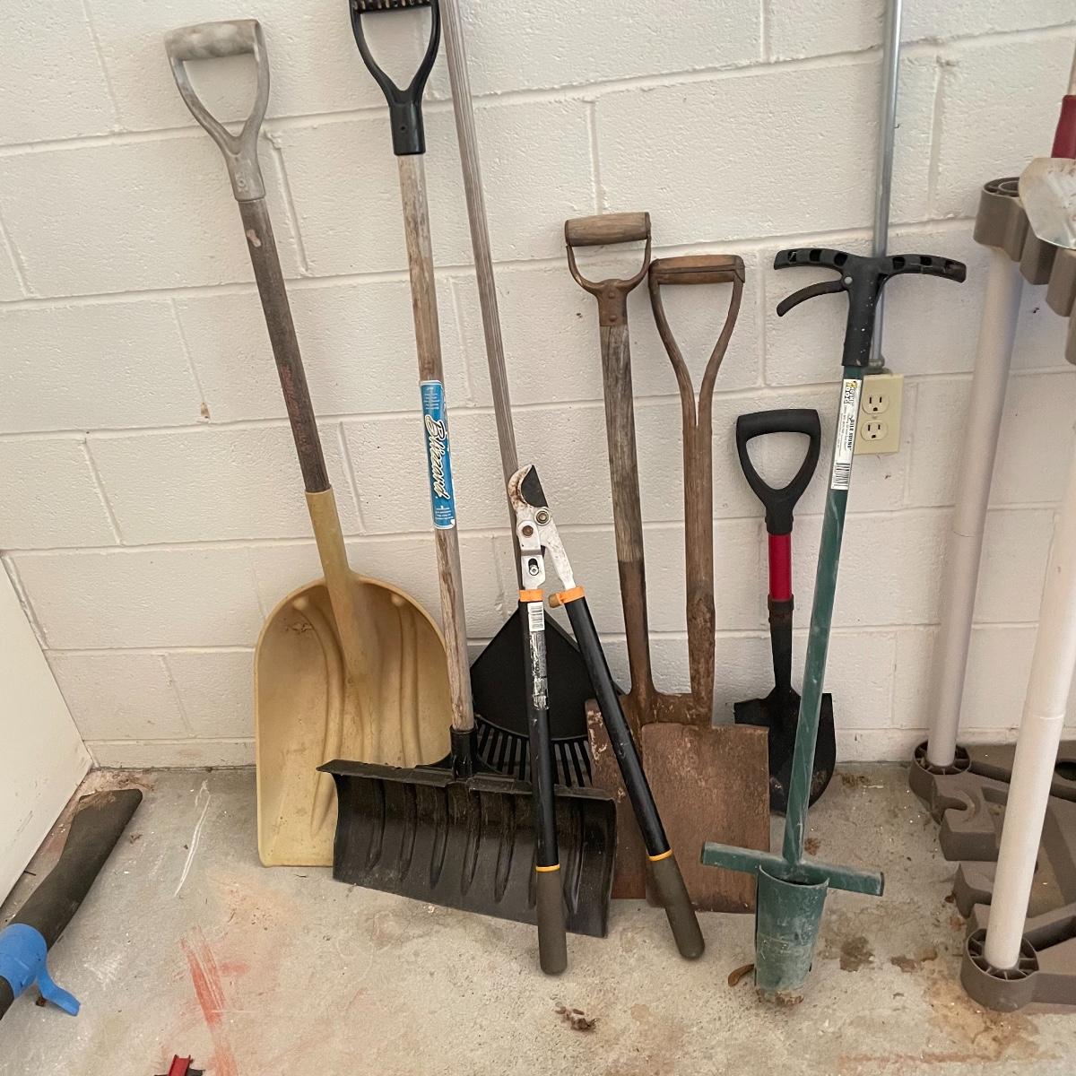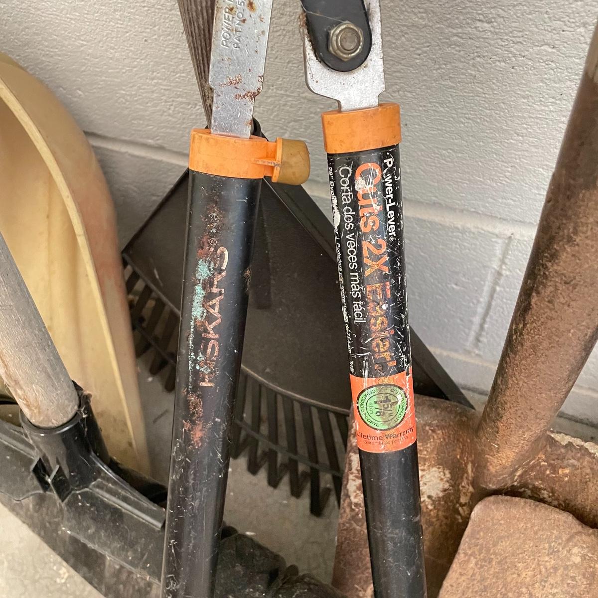 Get all your yard and garden tools here and keep them organized! The tool stand is pictured at 36” x 18” x 38”, but has nesting legs and can be shortened to about 21”. Two short rubbish bins are in nice shape, a little dirty, measuring 19”d x 22” each. The manual yard tools include clipper, snow shovels, bulb hound, saw and more! One knee pad is thrown in the mix, so you can be comfortable keeping your garden pretty! See images. Local pick up only.