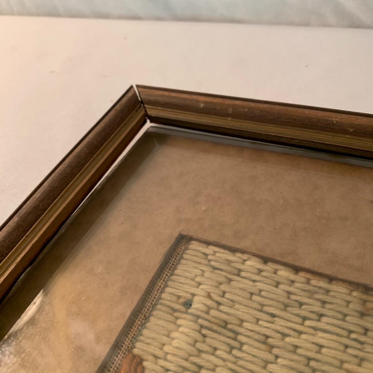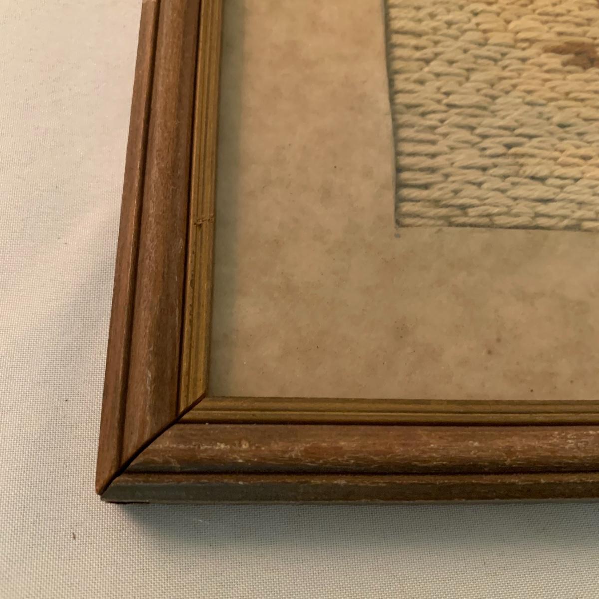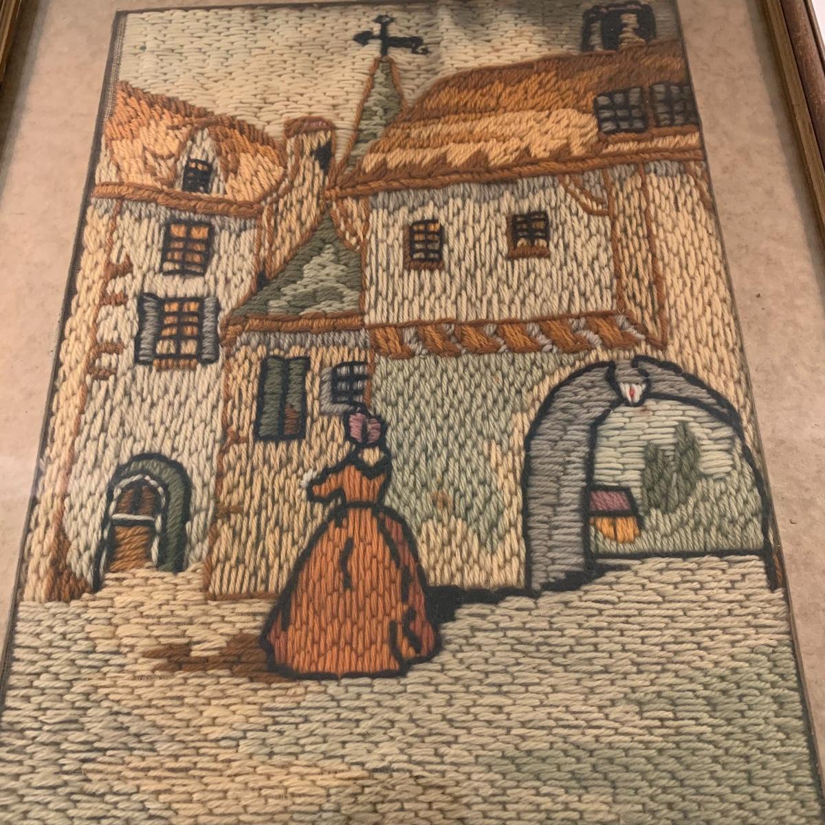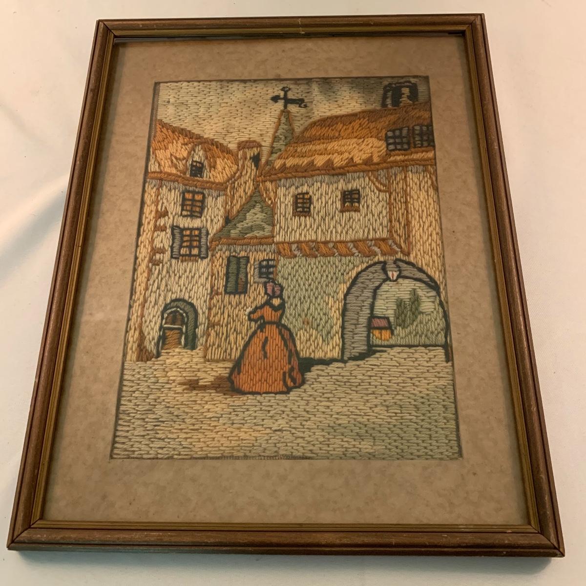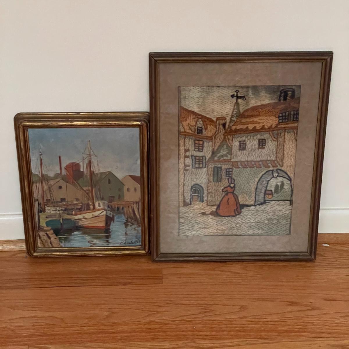 This lot includes one piece of yarn art and one painted harbor scene artwork. The yarn art is a delightful piece that is framed and matted. The frame does need some attention as it is quite loose at the joins (see photos). It measures 19in x 15in. The harbor painting is framed and appears to be signed. The paper on the back of the frame is ripped and falling off (see photos). It measures about 14in x 12in. Shipping available. Shipping art can be costly, call UPS at 828-252-6930 for a quote.