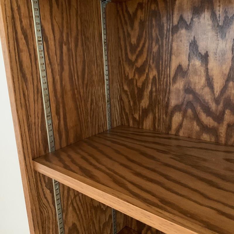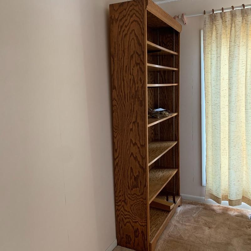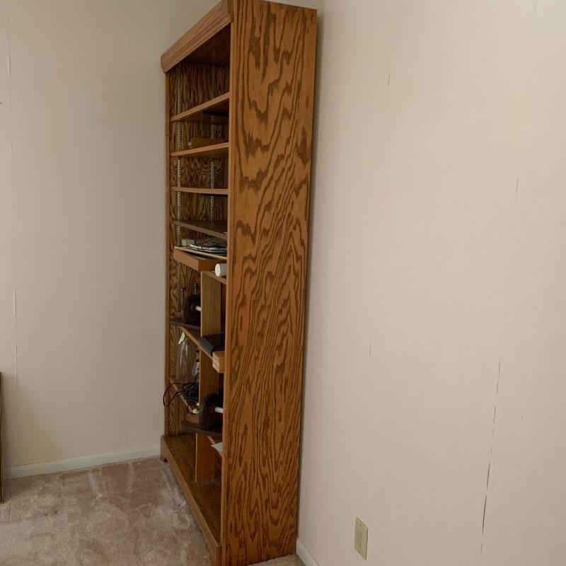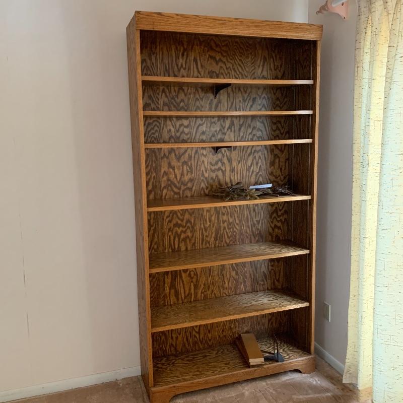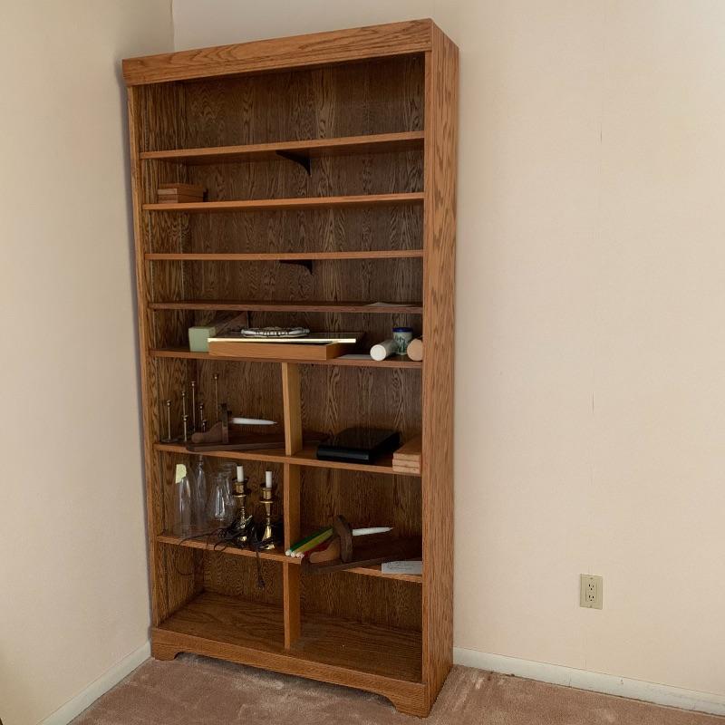 This lot includes a pair of large wooden bookshelves. The bookshelves have adjustable shelves and is made of a lighter (probably pressed) wood. Shelves include some extra slats to brace shelves, they also have hardware braces and pegs. They measure about 83in x 42in. Items on shelves are not included. Local pick up only.