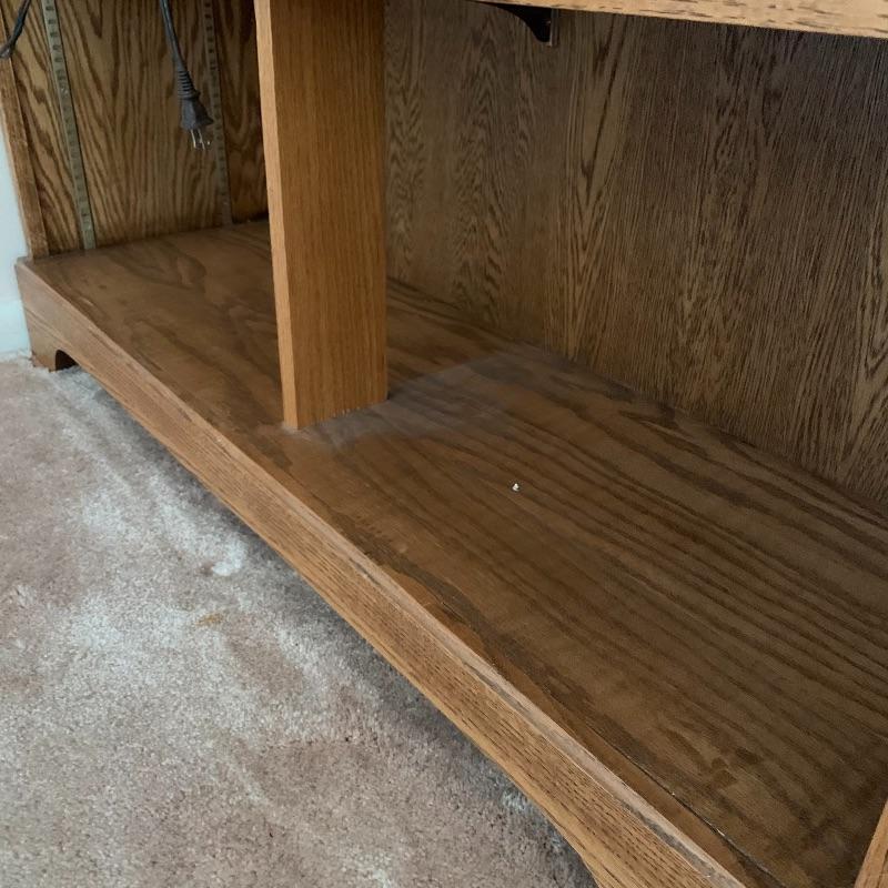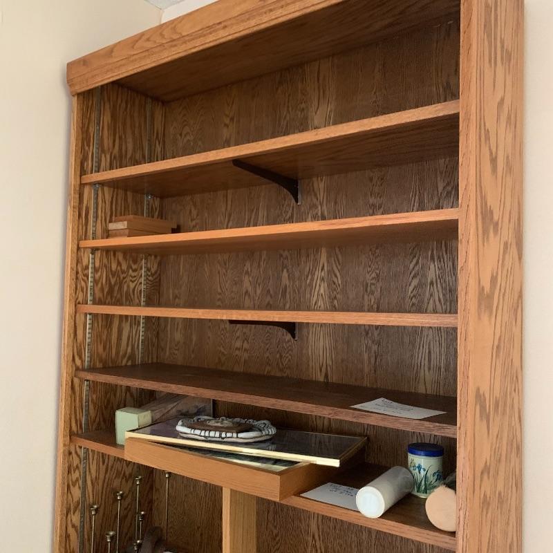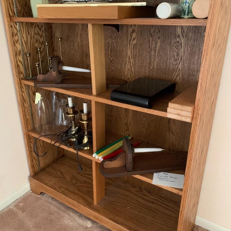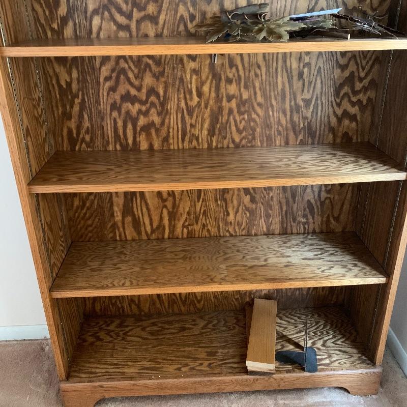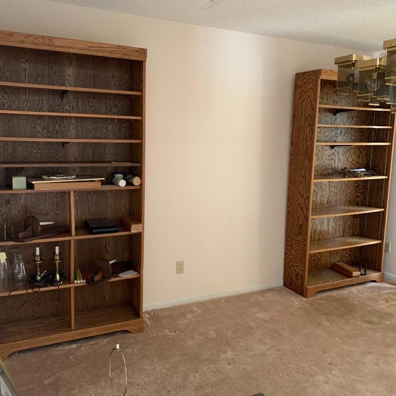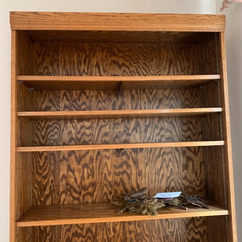 This lot includes a pair of large wooden bookshelves. The bookshelves have adjustable shelves and is made of a lighter (probably pressed) wood. Shelves include some extra slats to brace shelves, they also have hardware braces and pegs. They measure about 83in x 42in. Items on shelves are not included. Local pick up only.