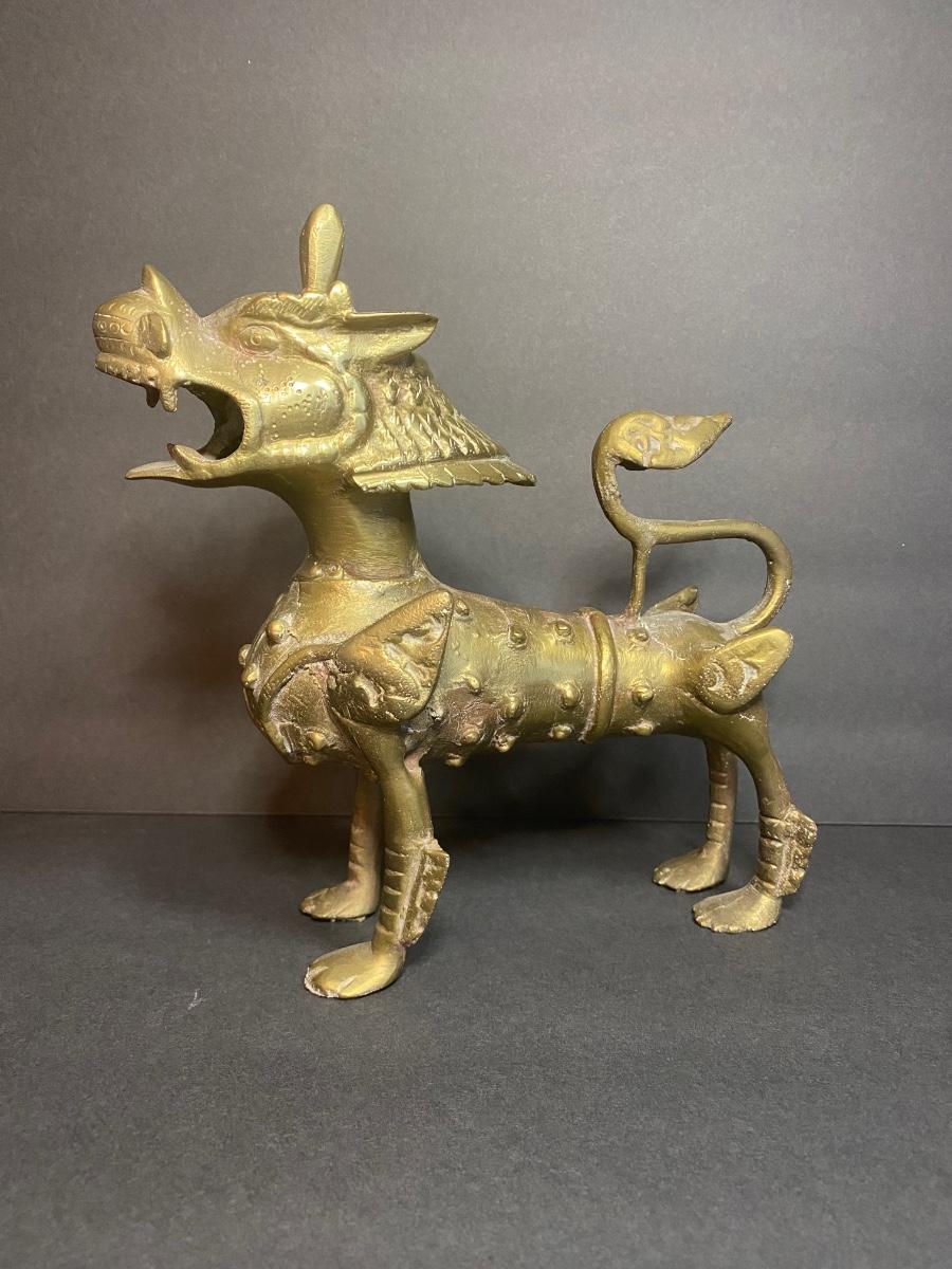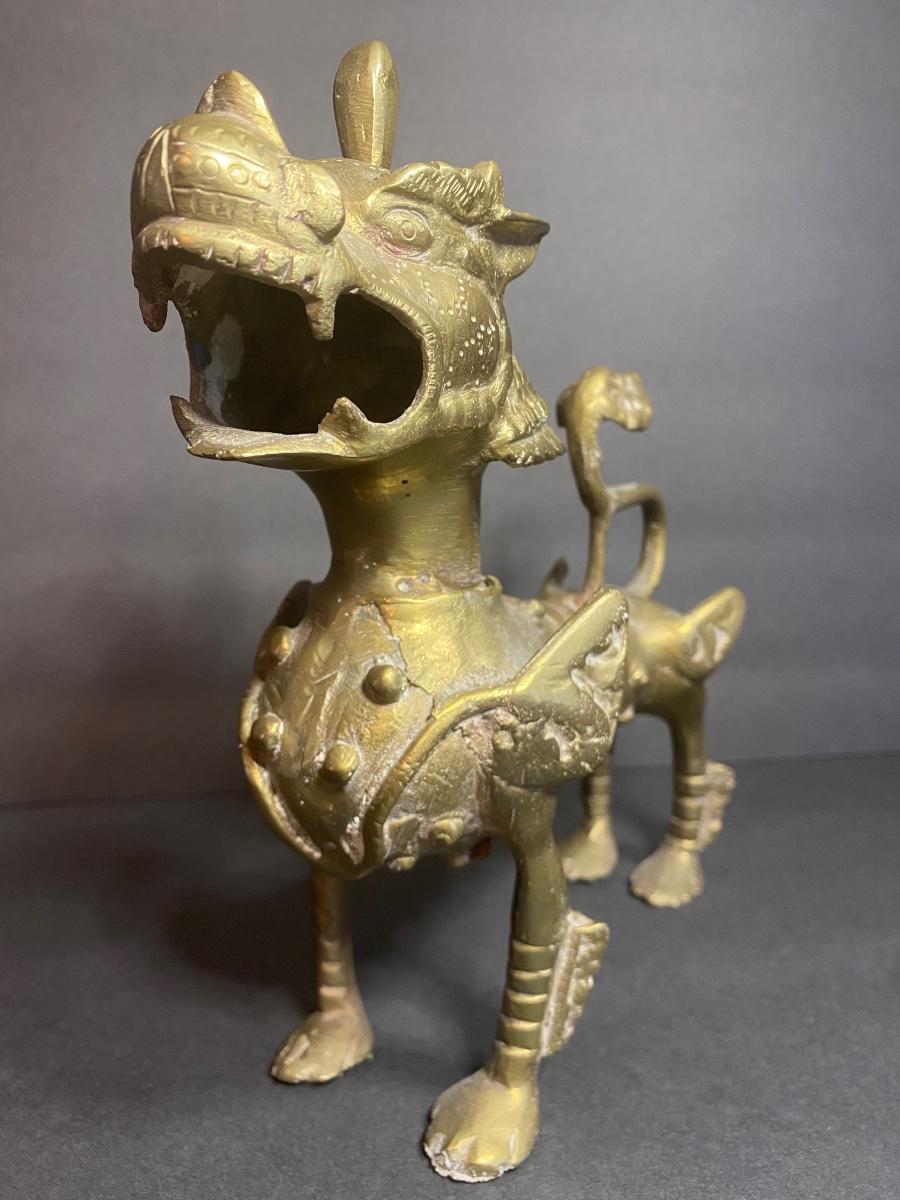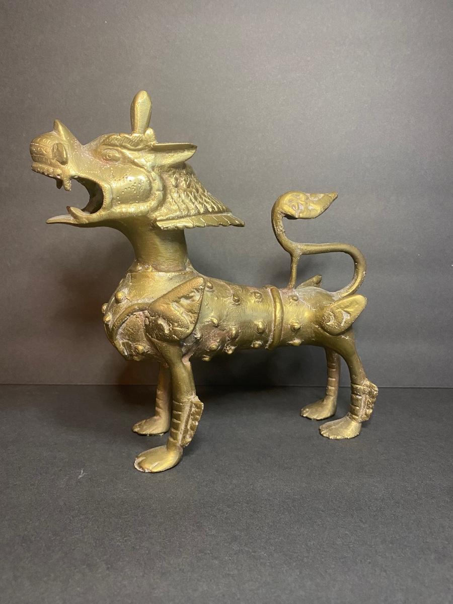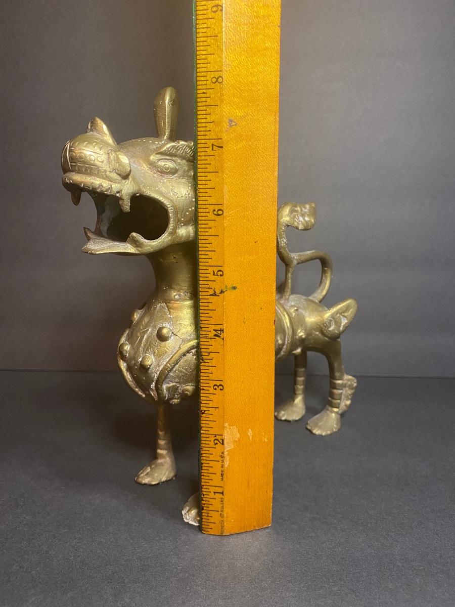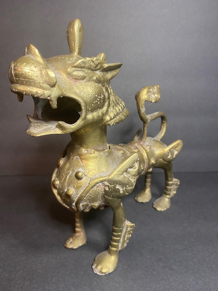 Brass Decor Treasures Nepalese Guardian Lion Foo Dog Figure, Mythical Chinese Lion, Cast brass statue. Most likely an incense burner.