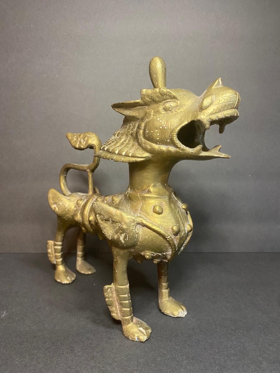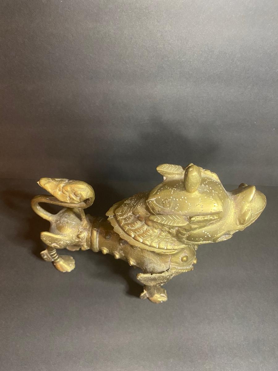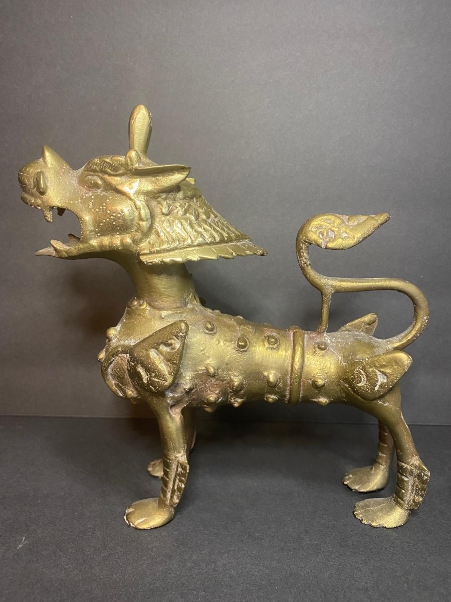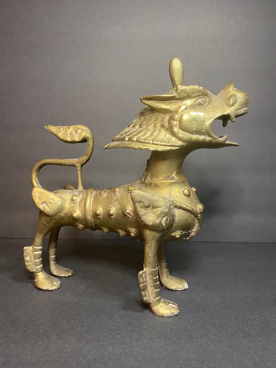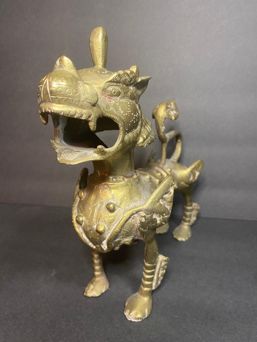 Brass Decor Treasures Nepalese Guardian Lion Foo Dog Figure, Mythical Chinese Lion, Cast brass statue. Most likely an incense burner.