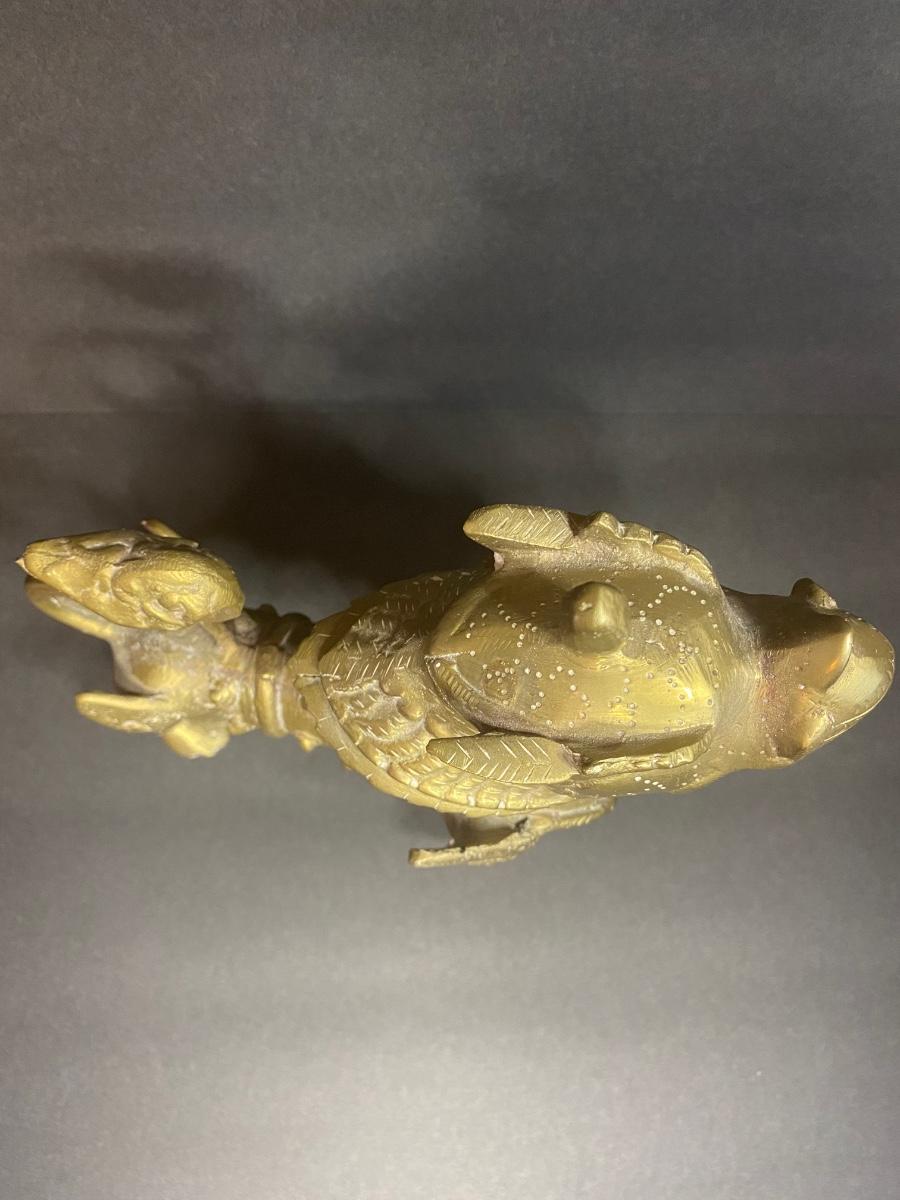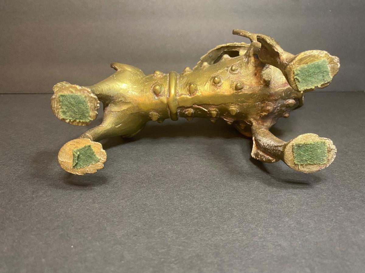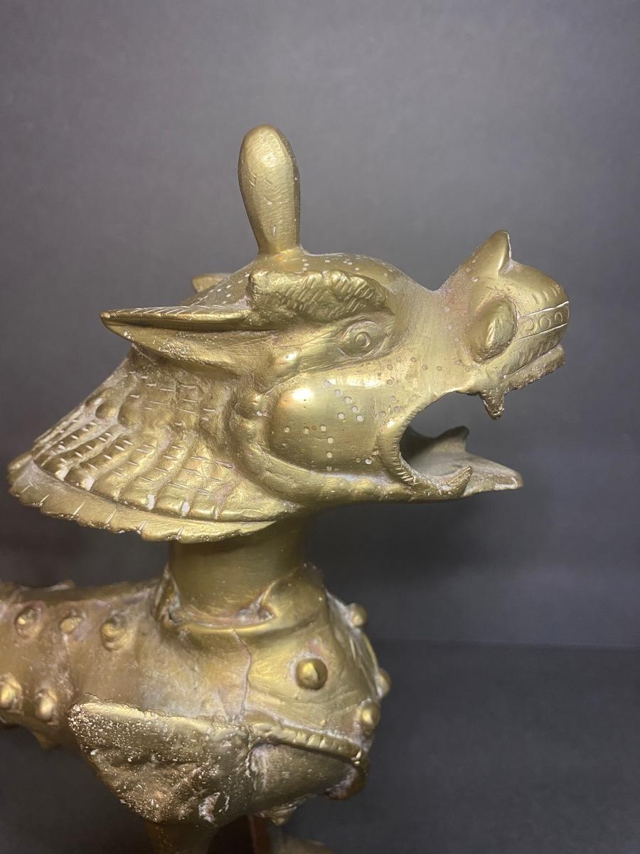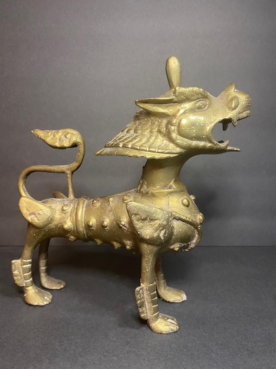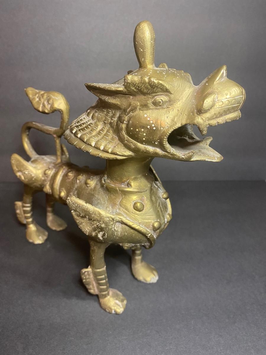 Brass Decor Treasures Nepalese Guardian Lion Foo Dog Figure, Mythical Chinese Lion, Cast brass statue. Most likely an incense burner.