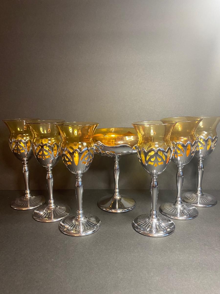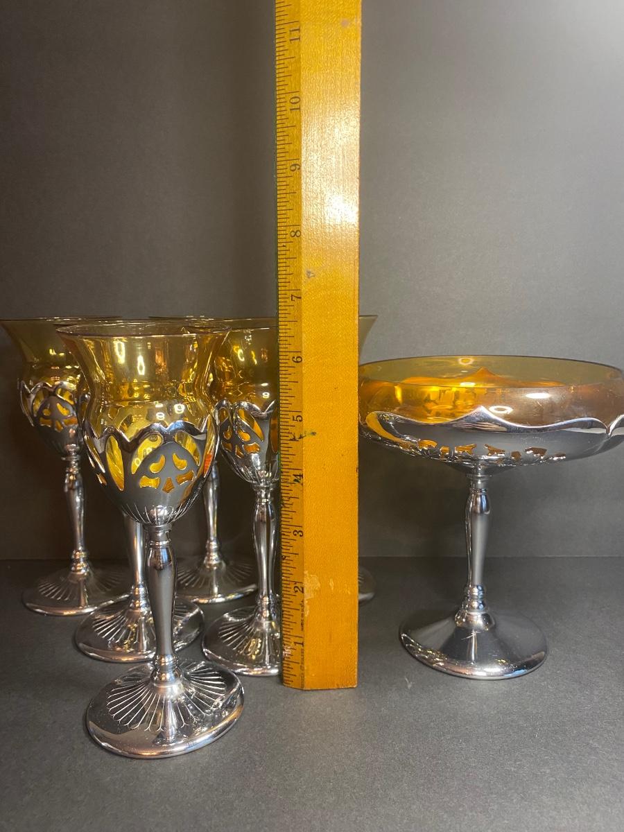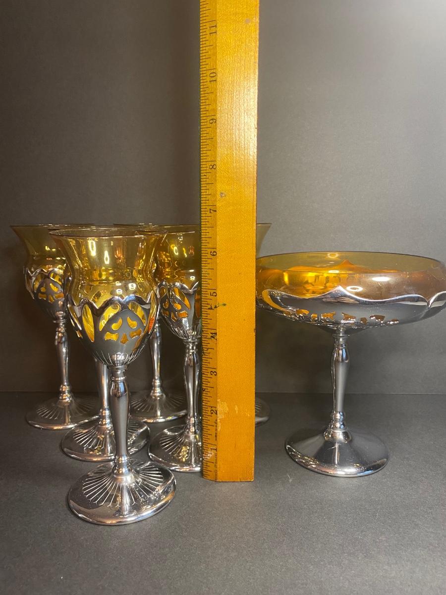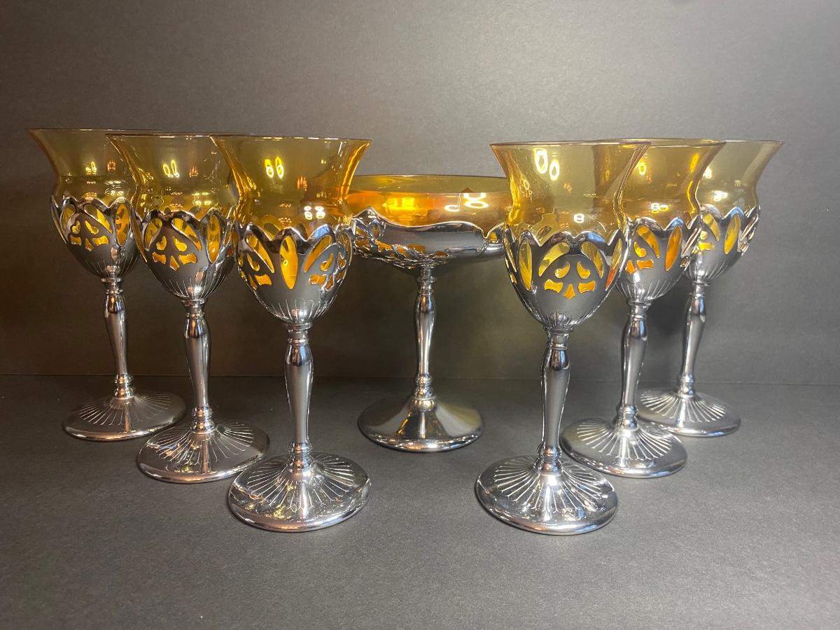 Vintage Farber Bros. Krome Kraft Cambridge Glass Amber Art Deco Compote and set of 6 Cocktail Glasses.