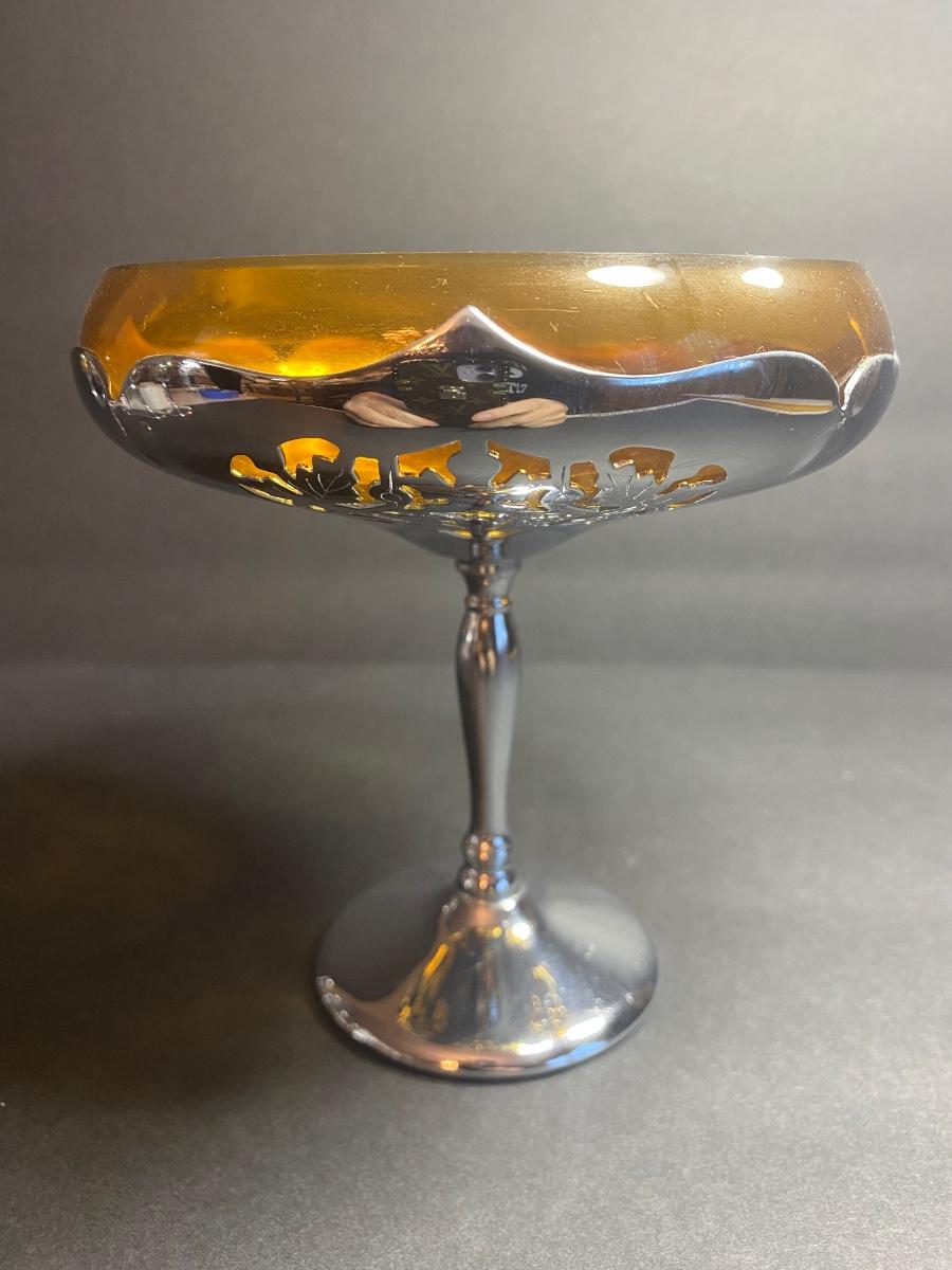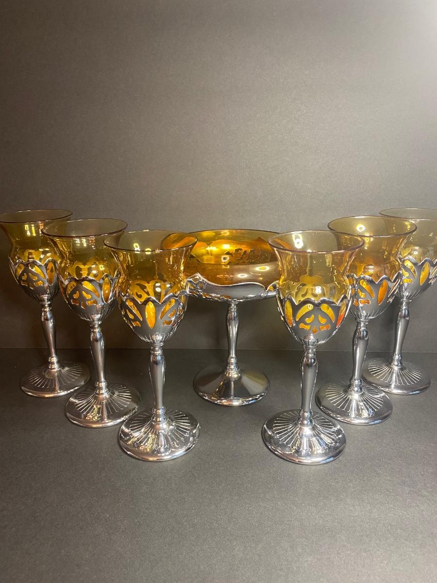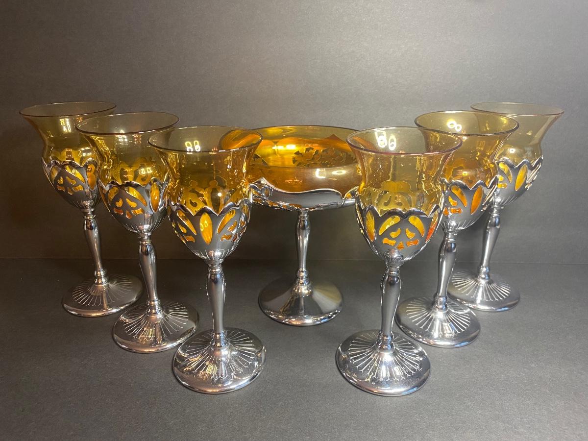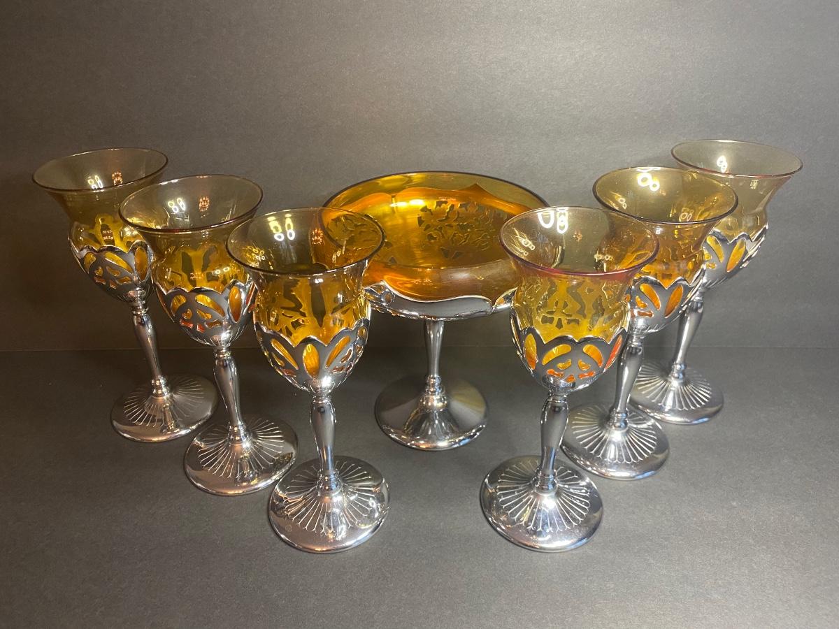 Vintage Farber Bros. Krome Kraft Cambridge Glass Amber Art Deco Compote and set of 6 Cocktail Glasses.