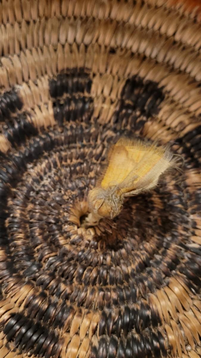This colorful Woven Navajo Wedding Basket appears to have been signed by the original Artist. Has a piece of cloth tied in the center to used to hang the basket. Can be easily removed.