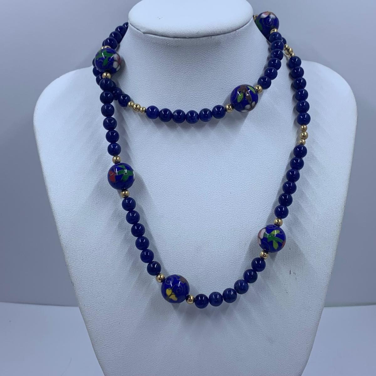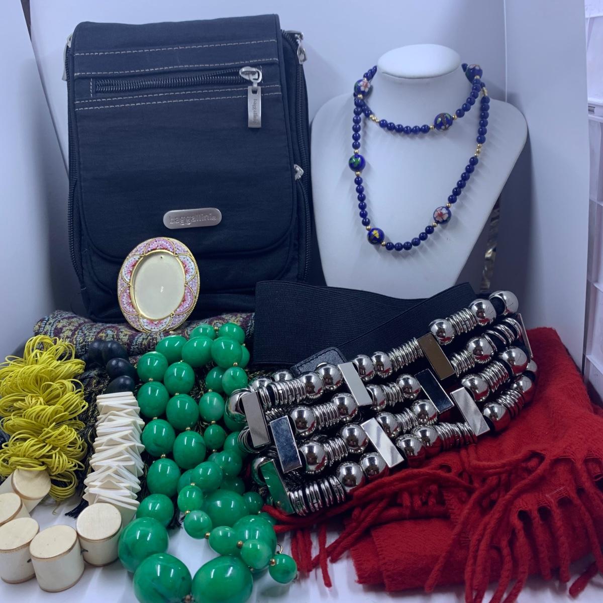 Lot 196: Blue Beaded Cloisonné Style Necklace, Baggallini Crossbody, Vintage Stretch Belt (30inches), Scarves & More
