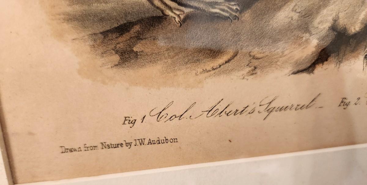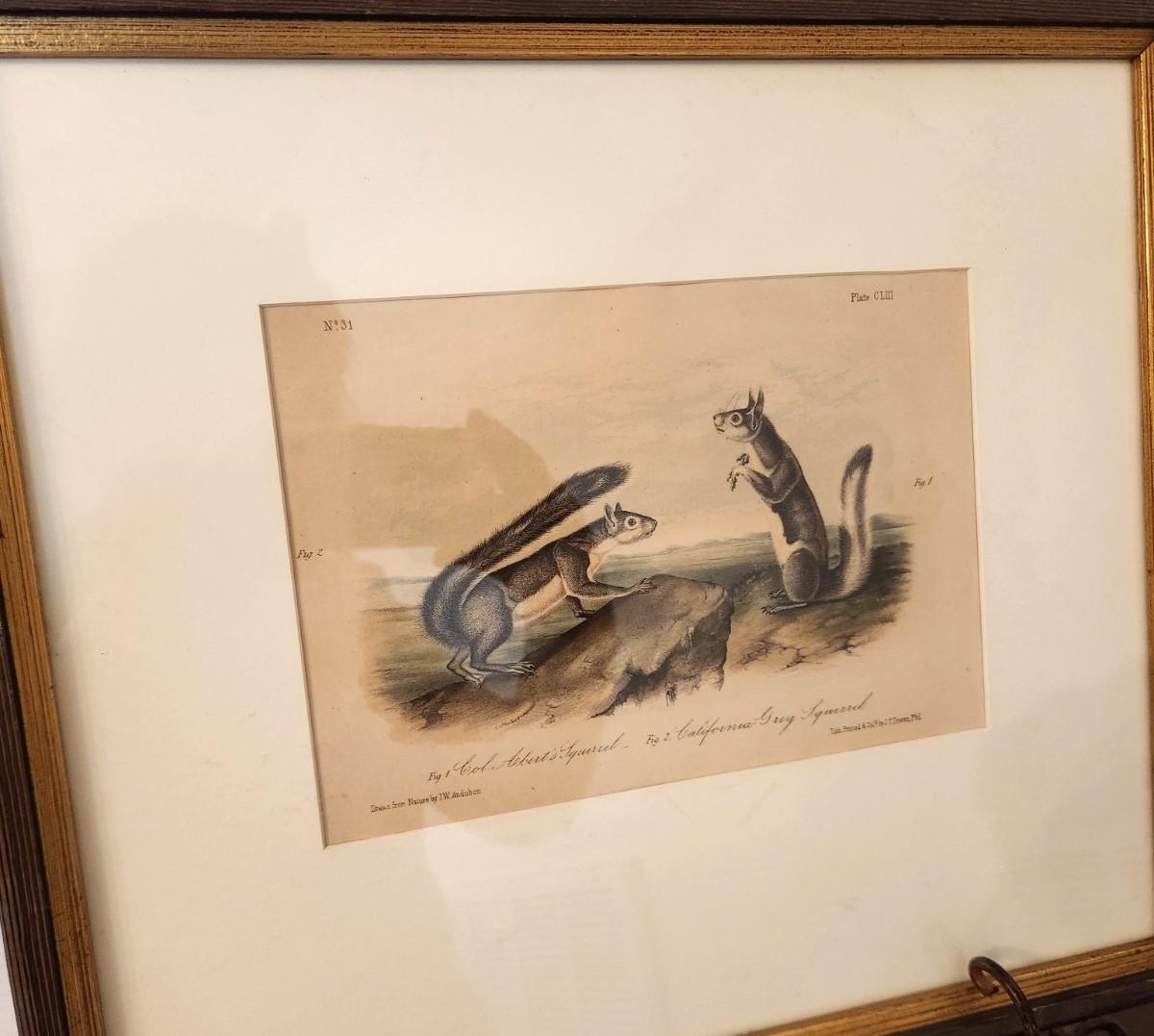 Another print in the Mammals of North America series by JJ Audubon - 19th century, hand colored, nicely framed. Depicts 2 different squirrels "Col Albert's Squirrel" and "California Gray Squirrel." 16.5" x 14.5". Good condition.