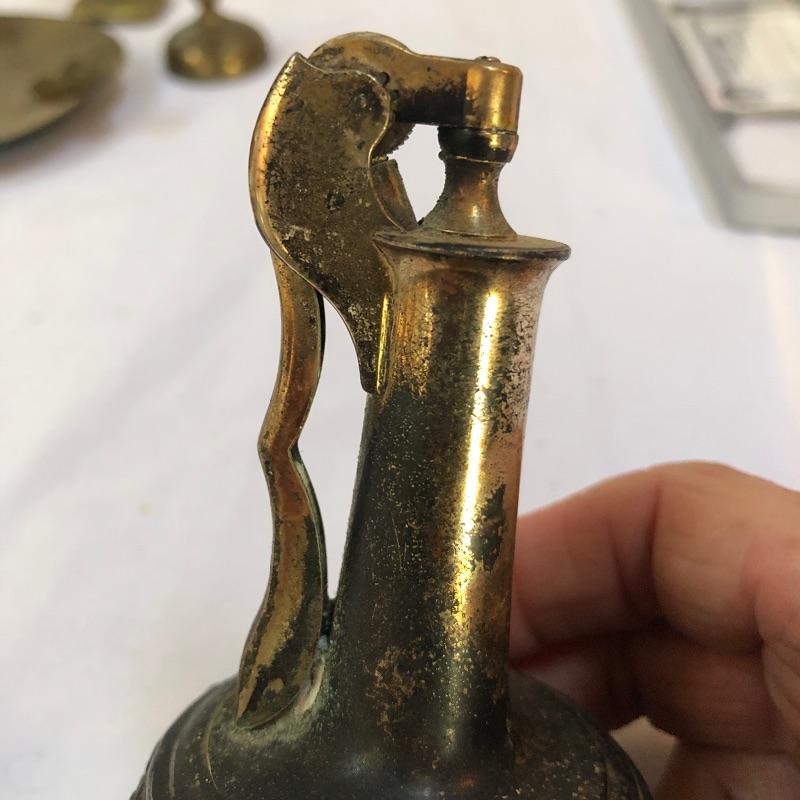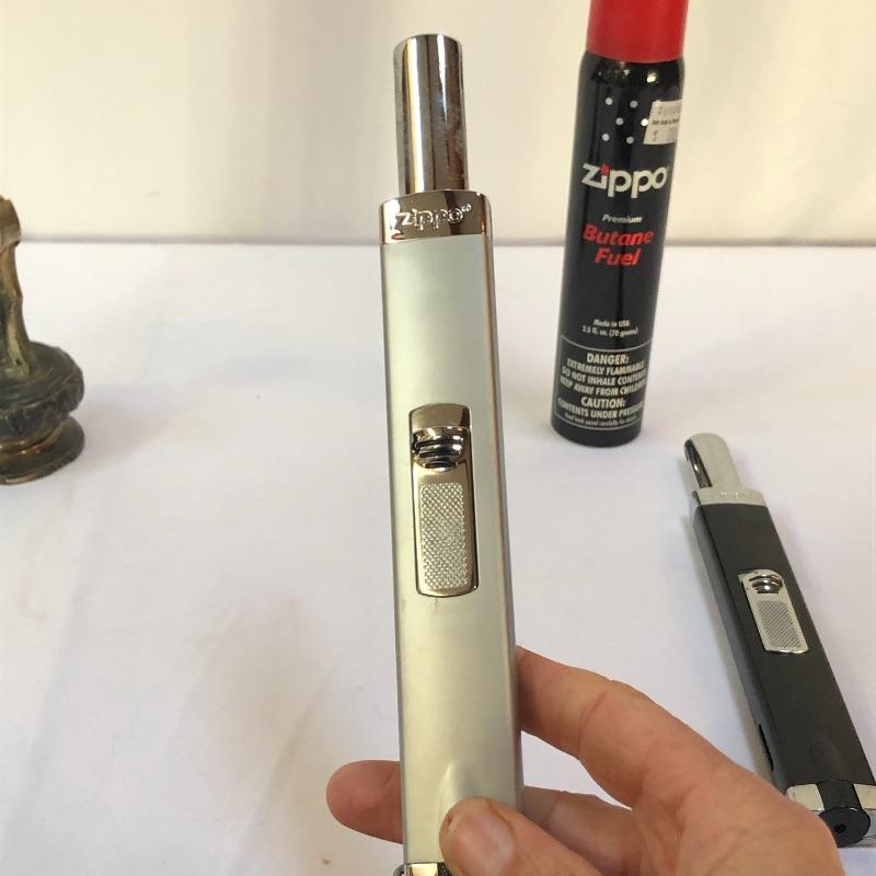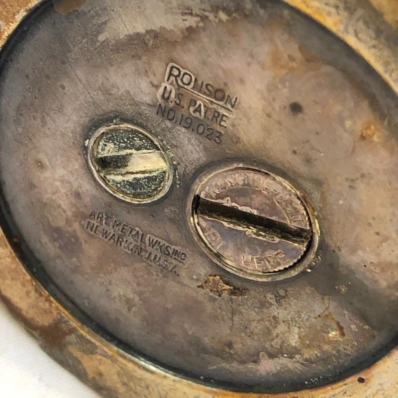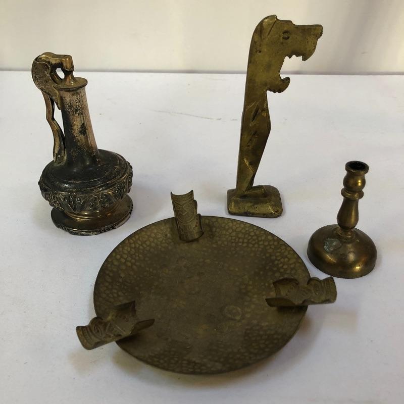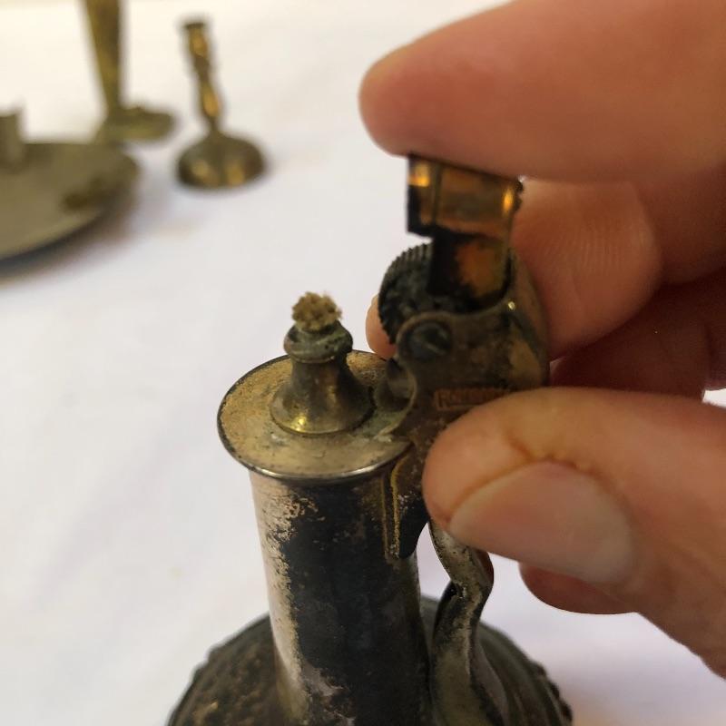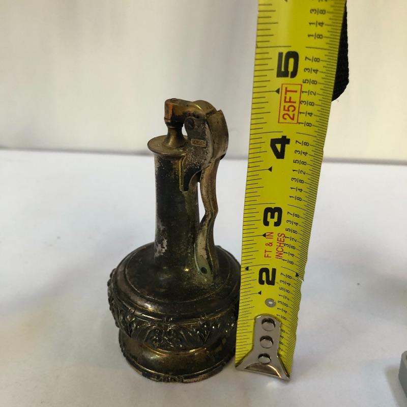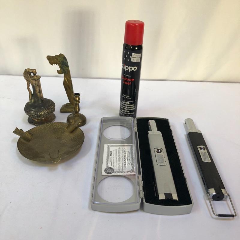 A great assortment of antique brass accessories here that includes a Ronson lighter, ashtray, cigarette holder and more. Also included are two Zippo lighters, one with box and a bottle of butane fuel. Lighters were not tested.