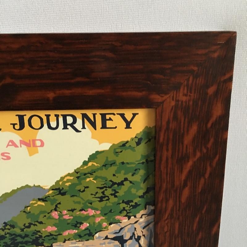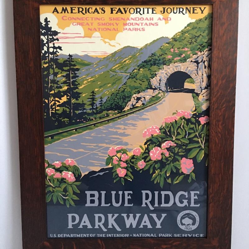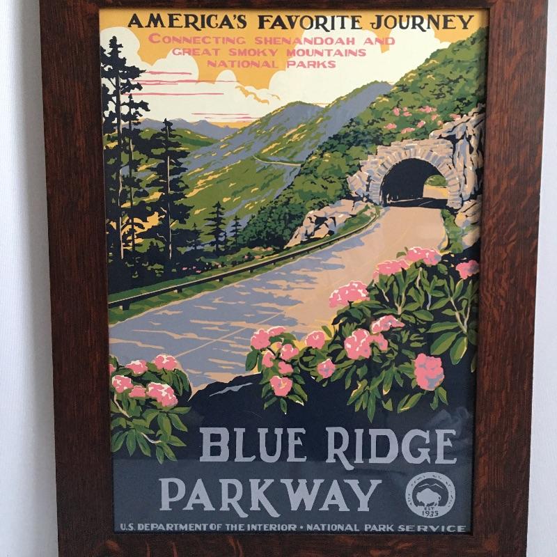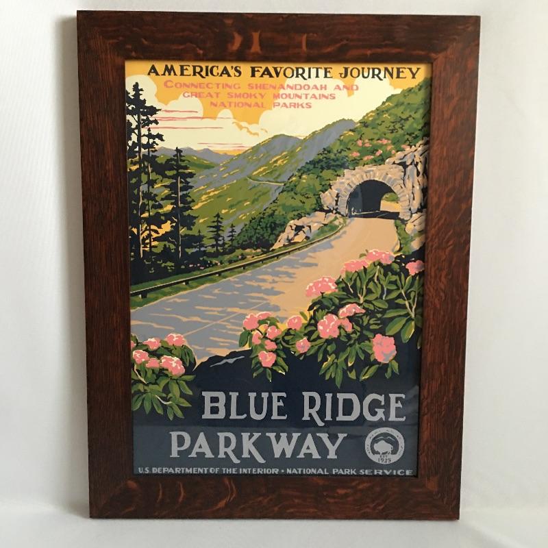 Arts & Crafts Frame by Dard Hunter studios with Blue Ridge Parkway artwork. A classic example of great craftsmanship. Frame measures 17.5” x 23”.