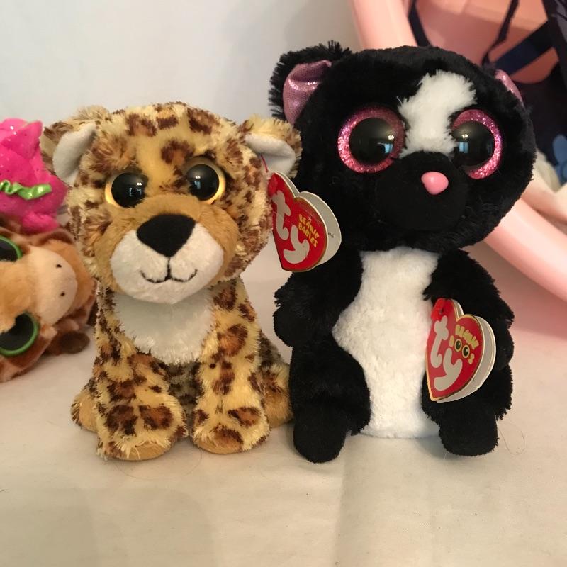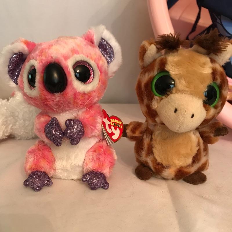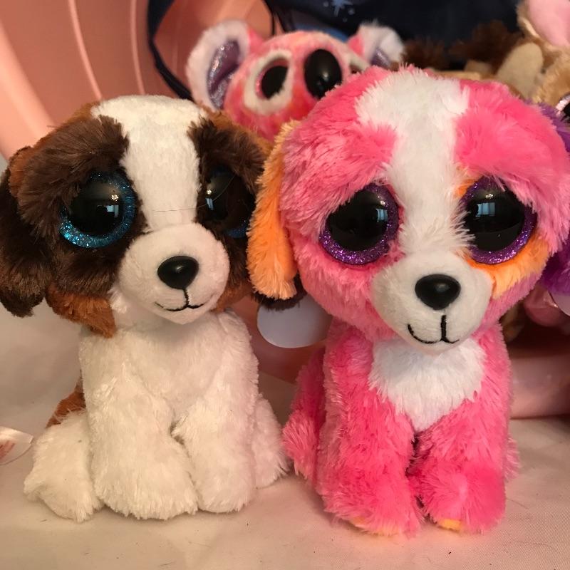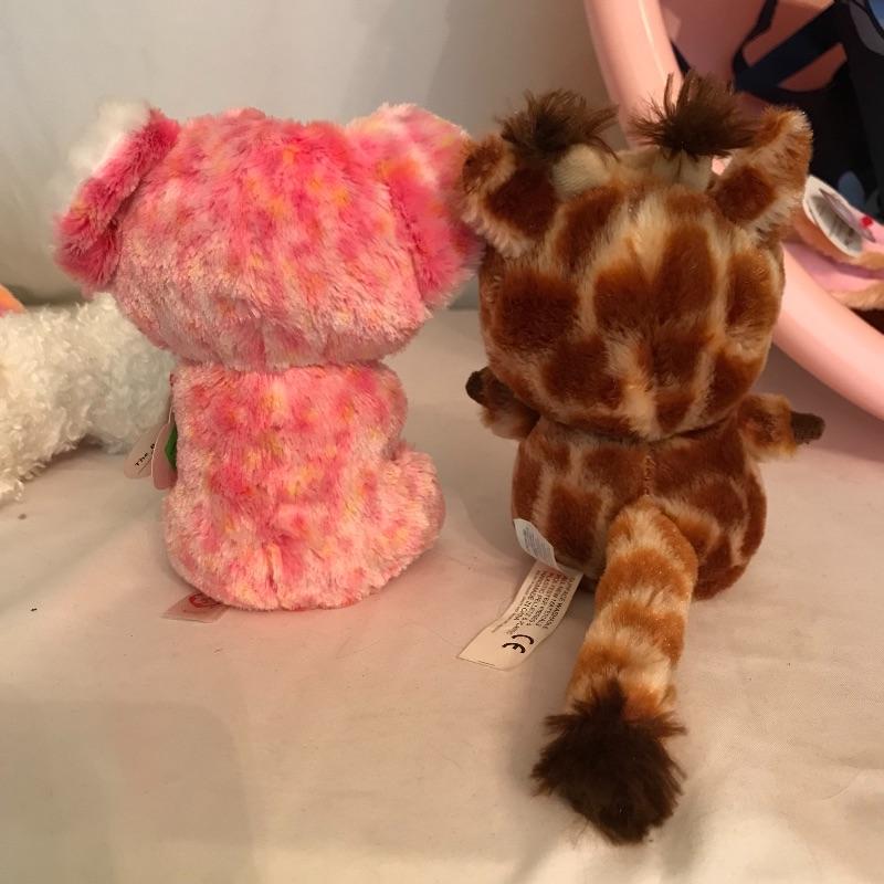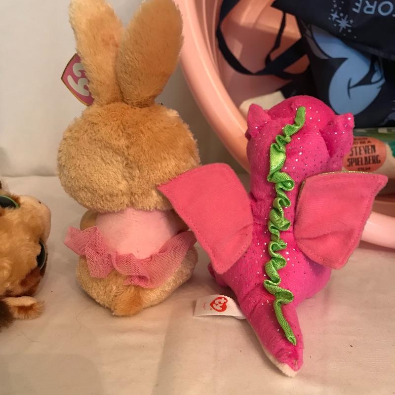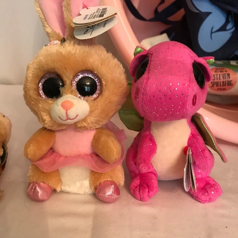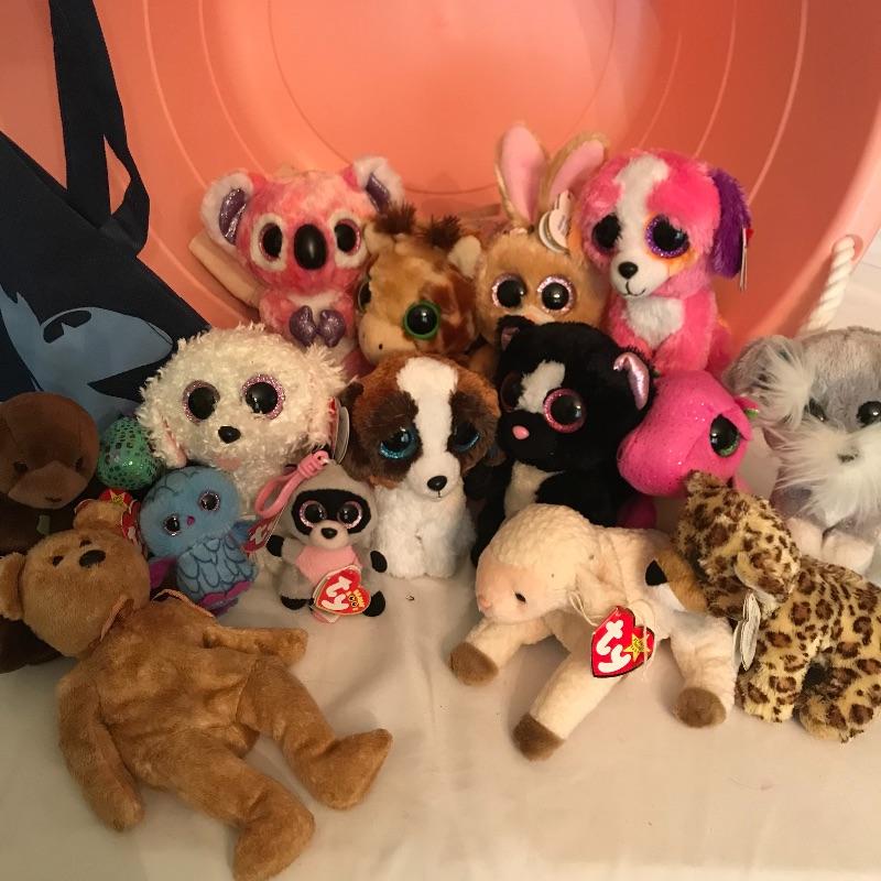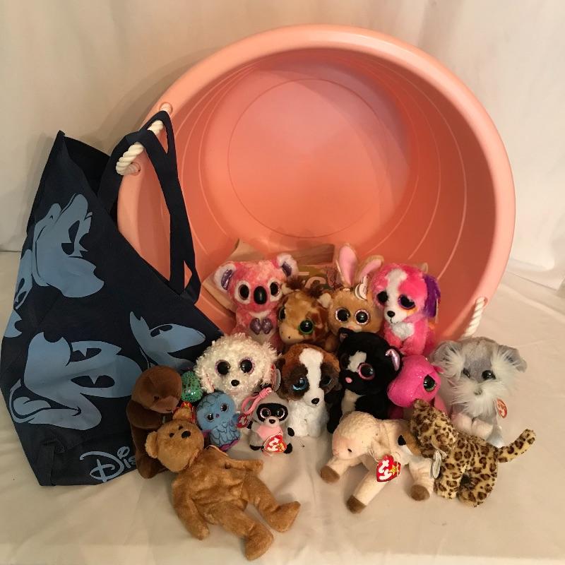 Fun collection of new and older TY Beanies. Most have original tags attached, the giraffe is missing its tag. There’s an otter, ewe, and teddy bear that all appear to be older while the newer sparkly eyes adorn the rest of the collection. All appear in very nice shape. A Disney store reusable bag with a BFG bag and a large pink storage tub also included. Tub measures 21.5”d x 16.5. No shipping.
