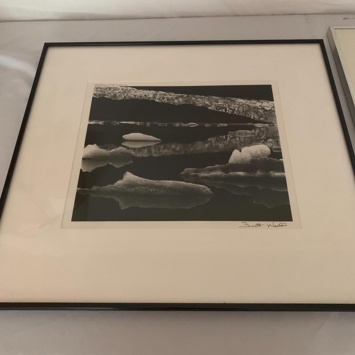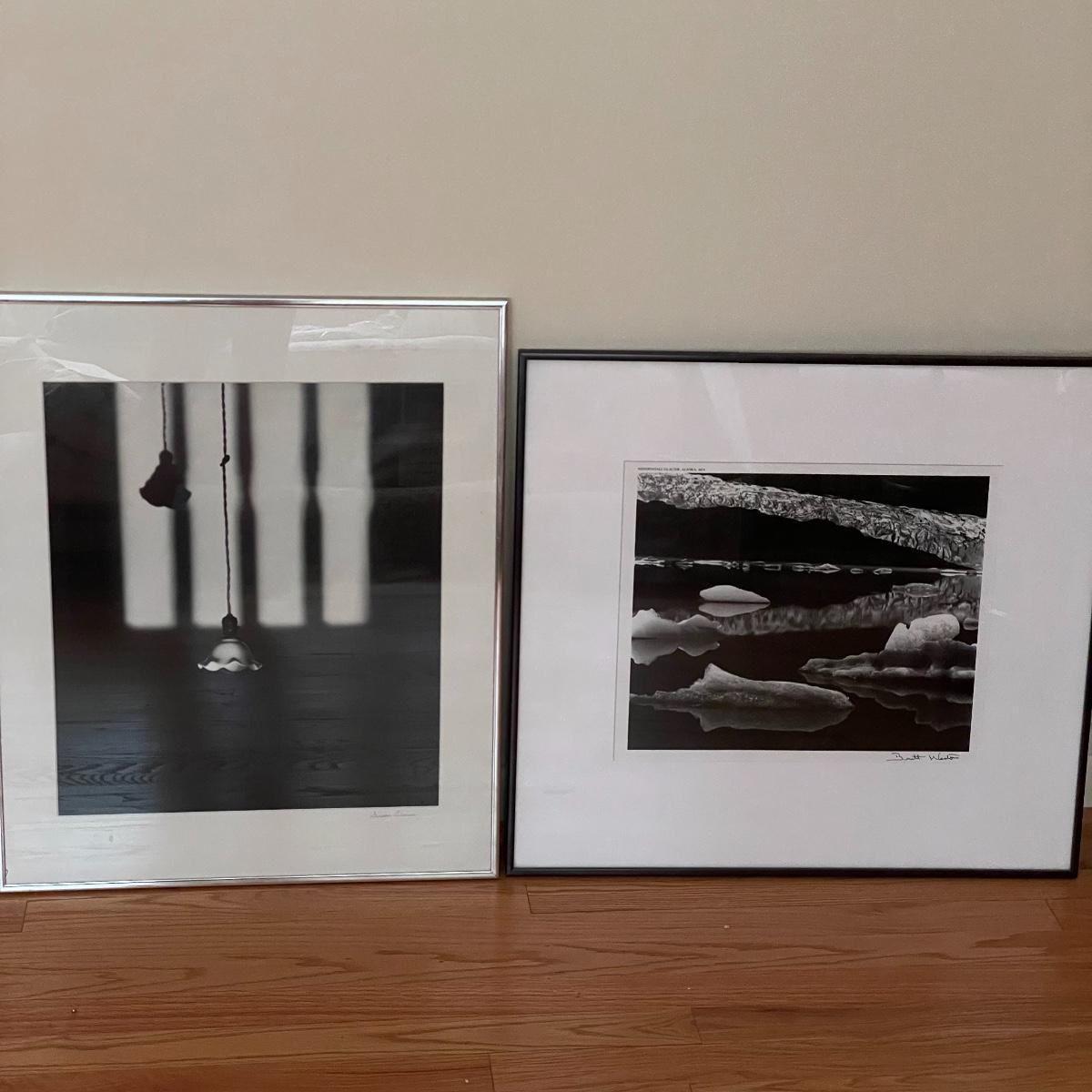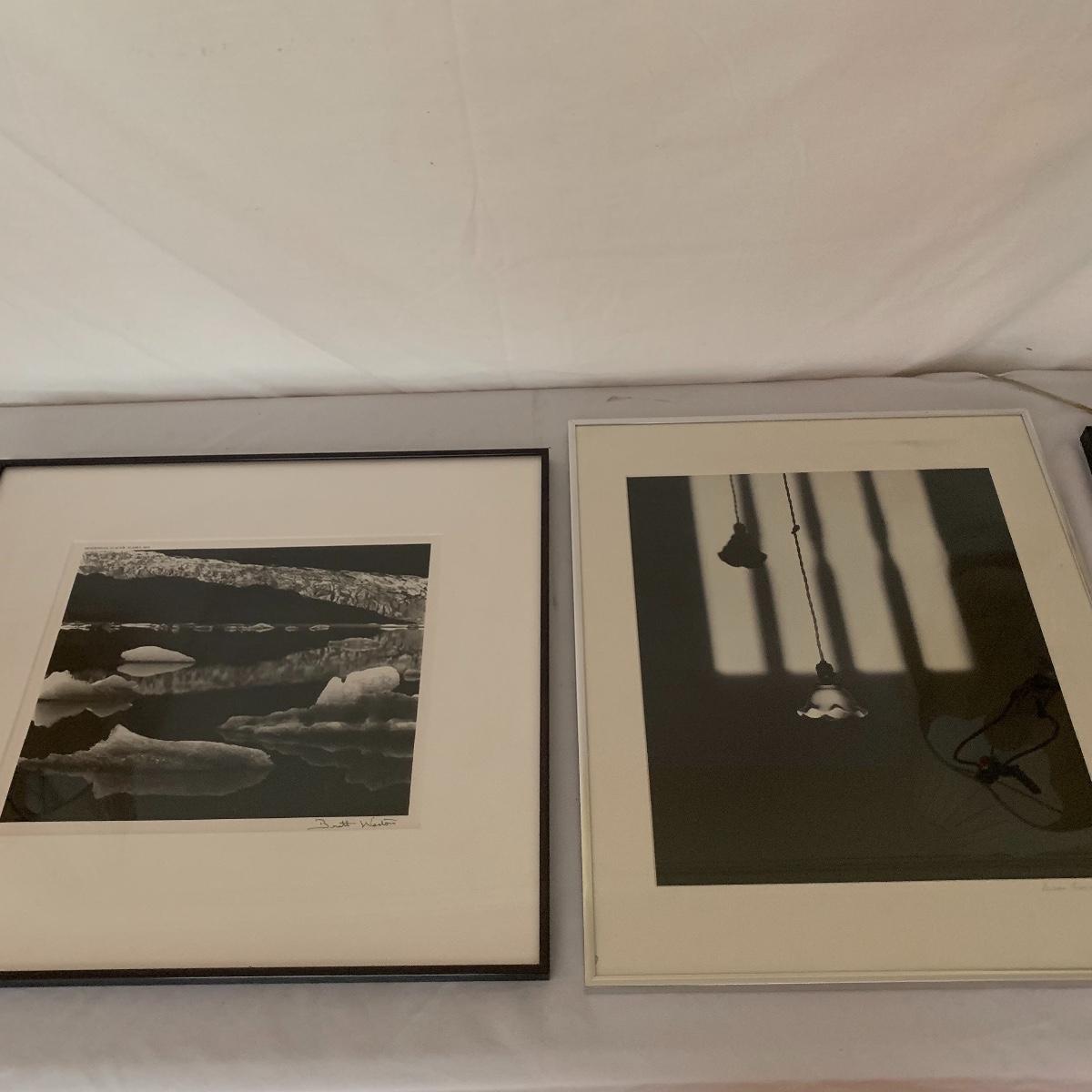 This lot includes two framed and matted black and white photography pieces. One piece is of the Mendenhall Glacier in Alaska and appears to be signed by Brett Weston. It measures 22in x 24in. The other piece is an atmospheric photograph signed by Susan Lanier. It measures 24in x 20.5in. Shipping available. Shipping art can be costly, call UPS at 828-252-6930 for a quote.