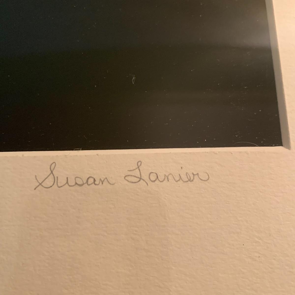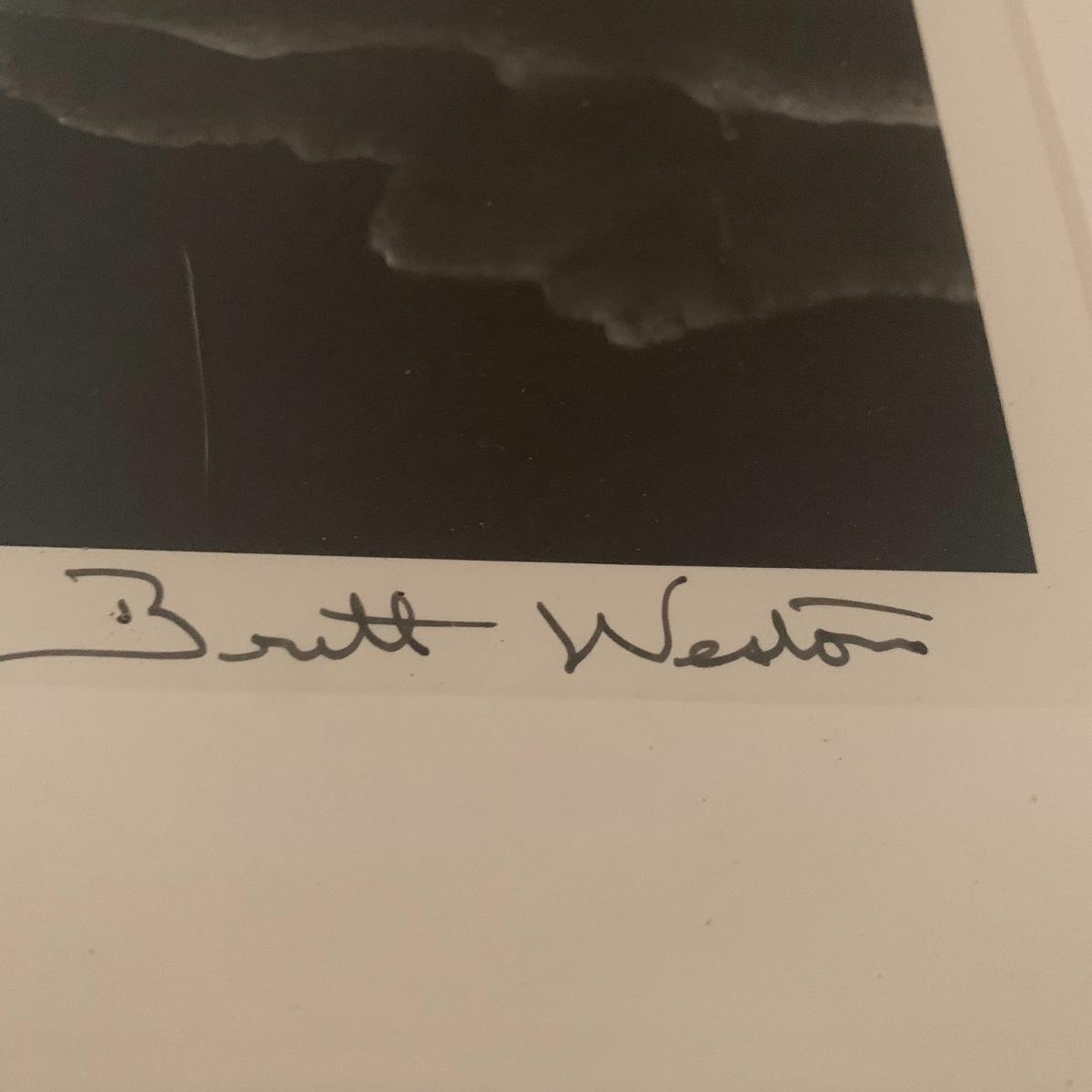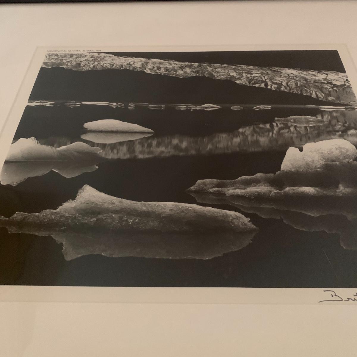 This lot includes two framed and matted black and white photography pieces. One piece is of the Mendenhall Glacier in Alaska and appears to be signed by Brett Weston. It measures 22in x 24in. The other piece is an atmospheric photograph signed by Susan Lanier. It measures 24in x 20.5in. Shipping available. Shipping art can be costly, call UPS at 828-252-6930 for a quote.
