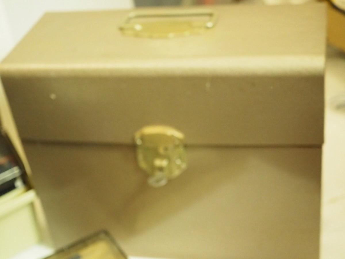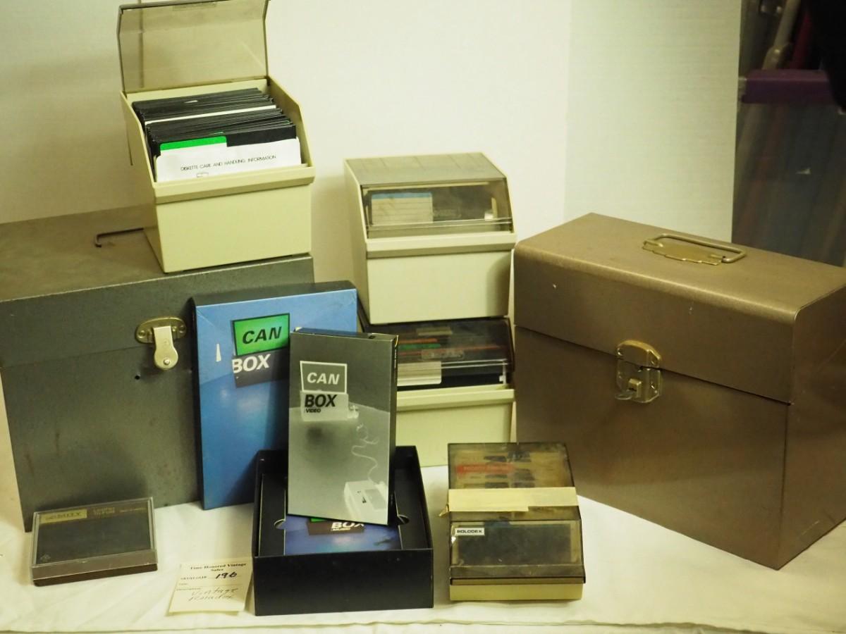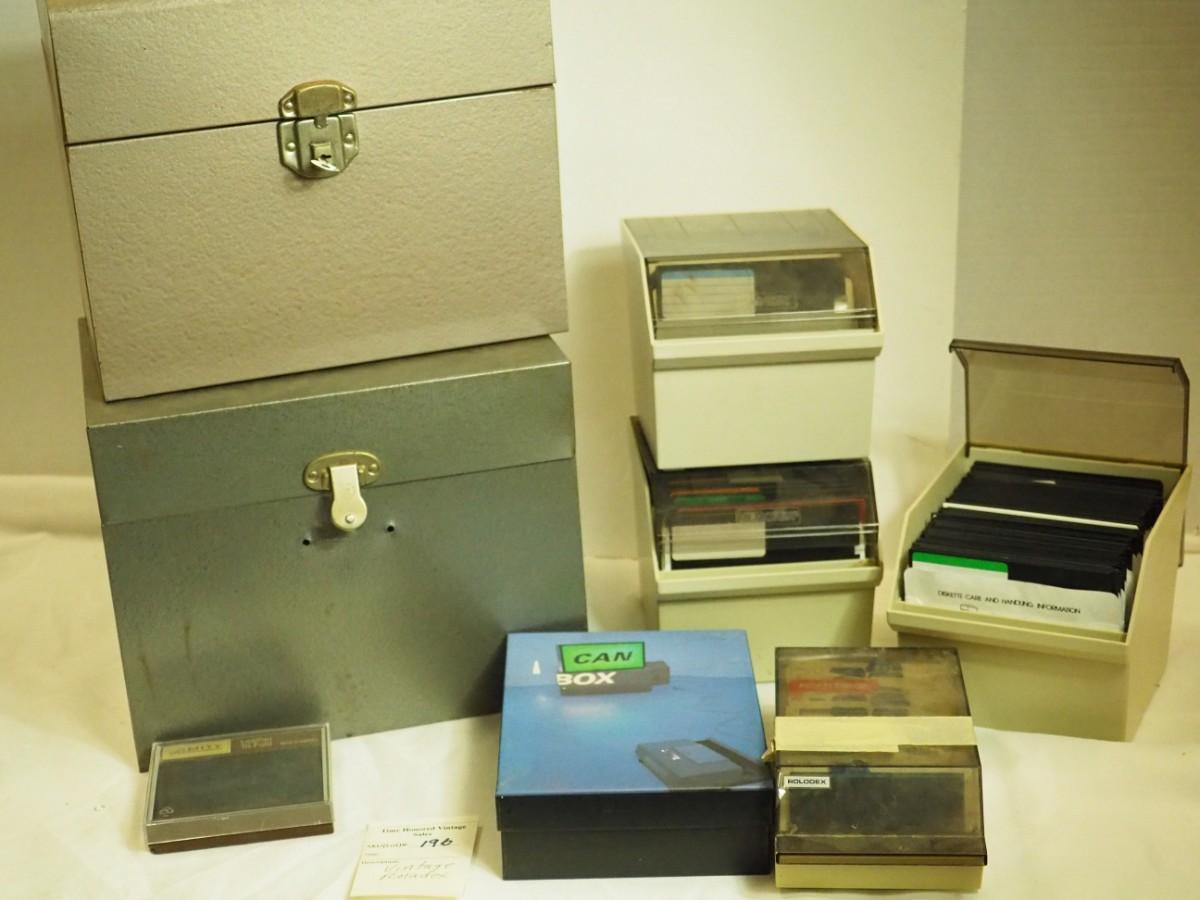 Lot 196 Can Box VHS, Vintage metal file boxes, data and Rolodex boxes, new vintage wallet.