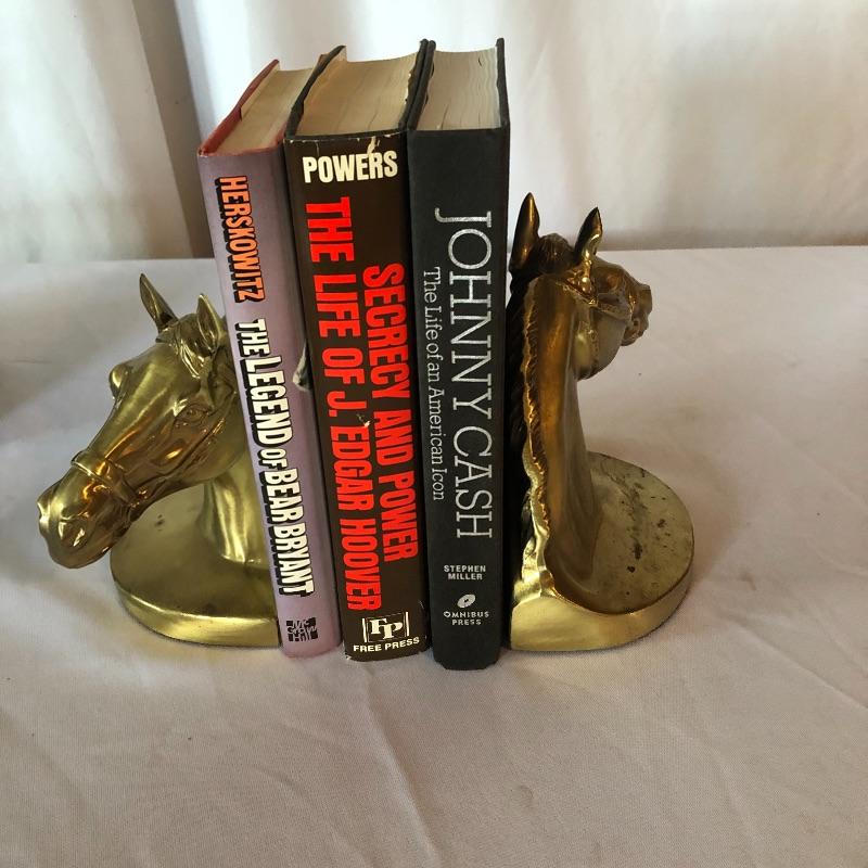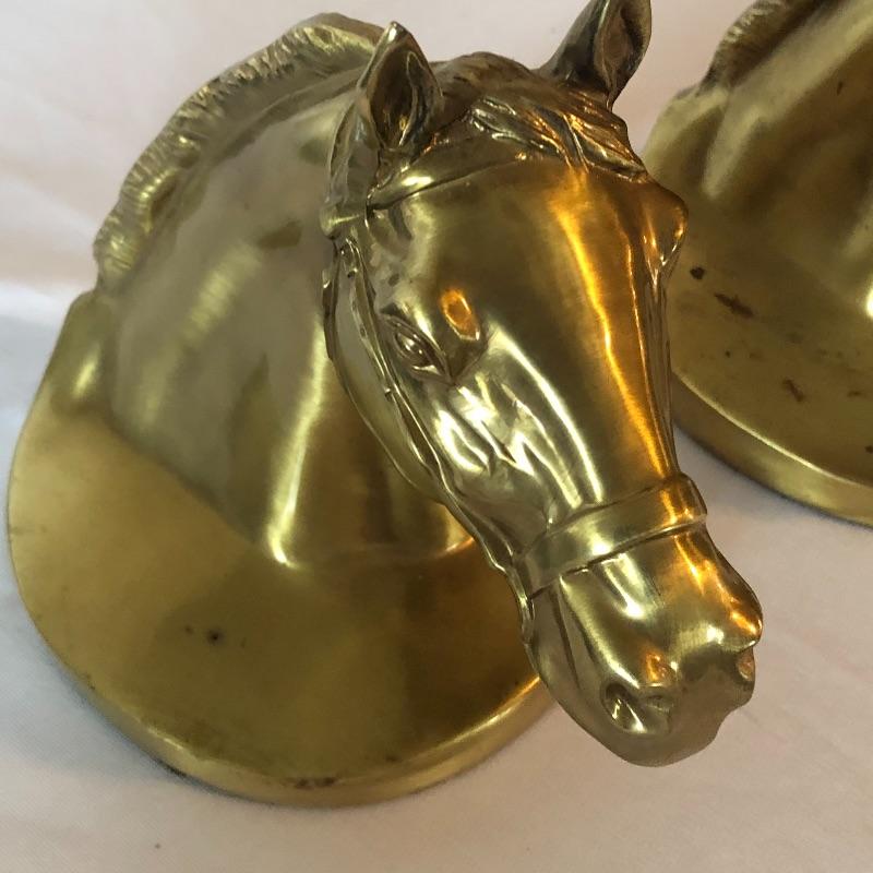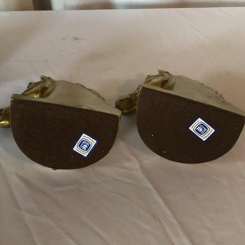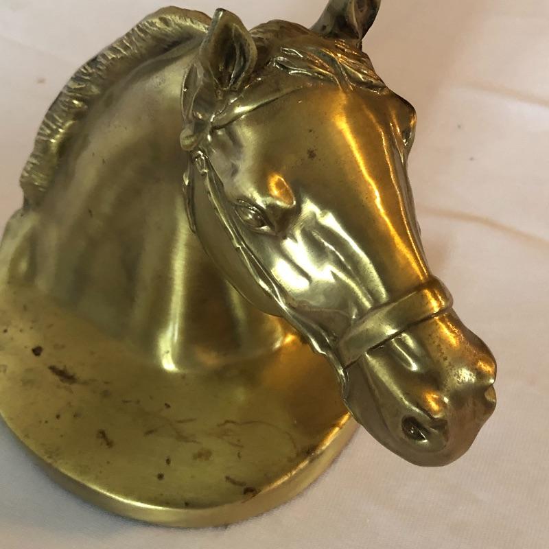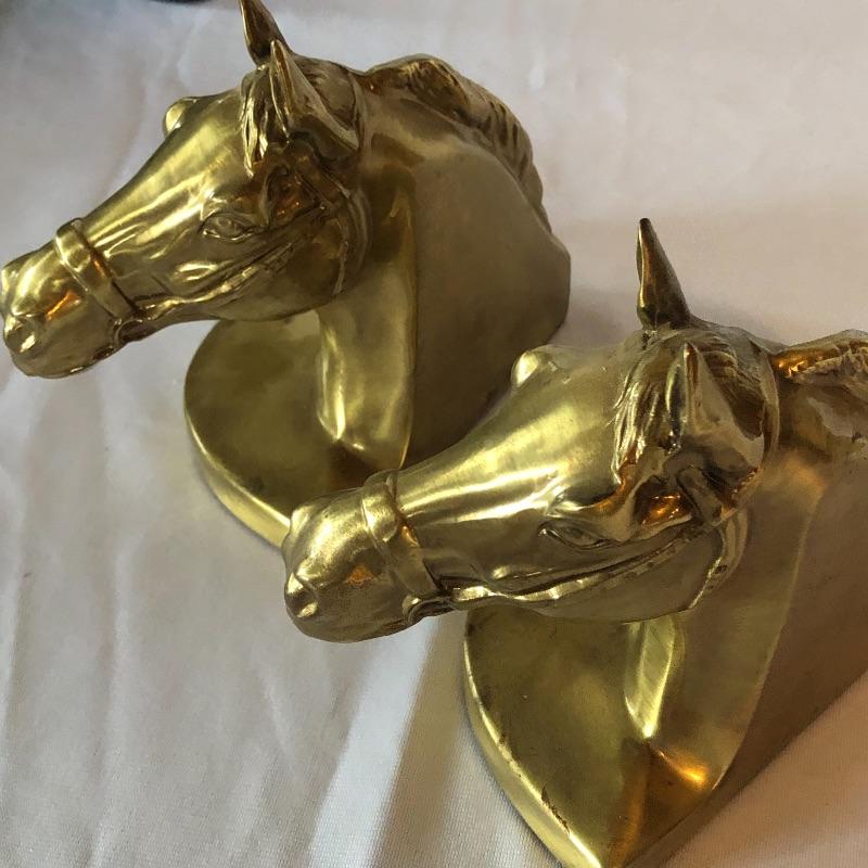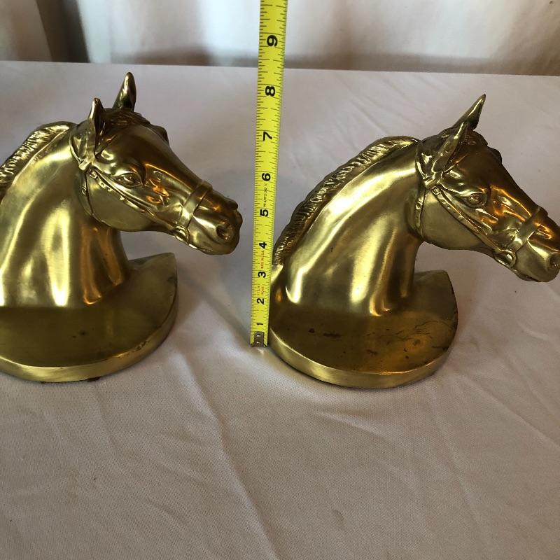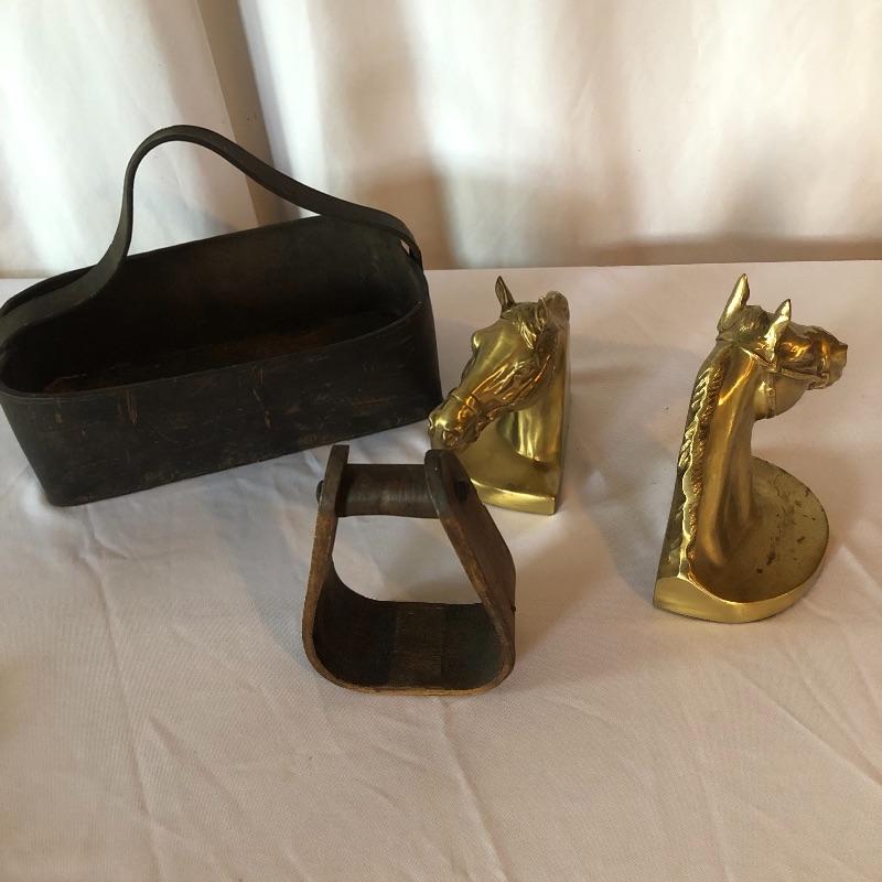 Horse lovers beware! This lot will decorate your house with an equine flair! It includes two heavy brass like book ends ( books not included), a wooden stirrup and horse feeding bag. The book ends have marks on bases (see photos). Pictures give dimensions. Shipping available.